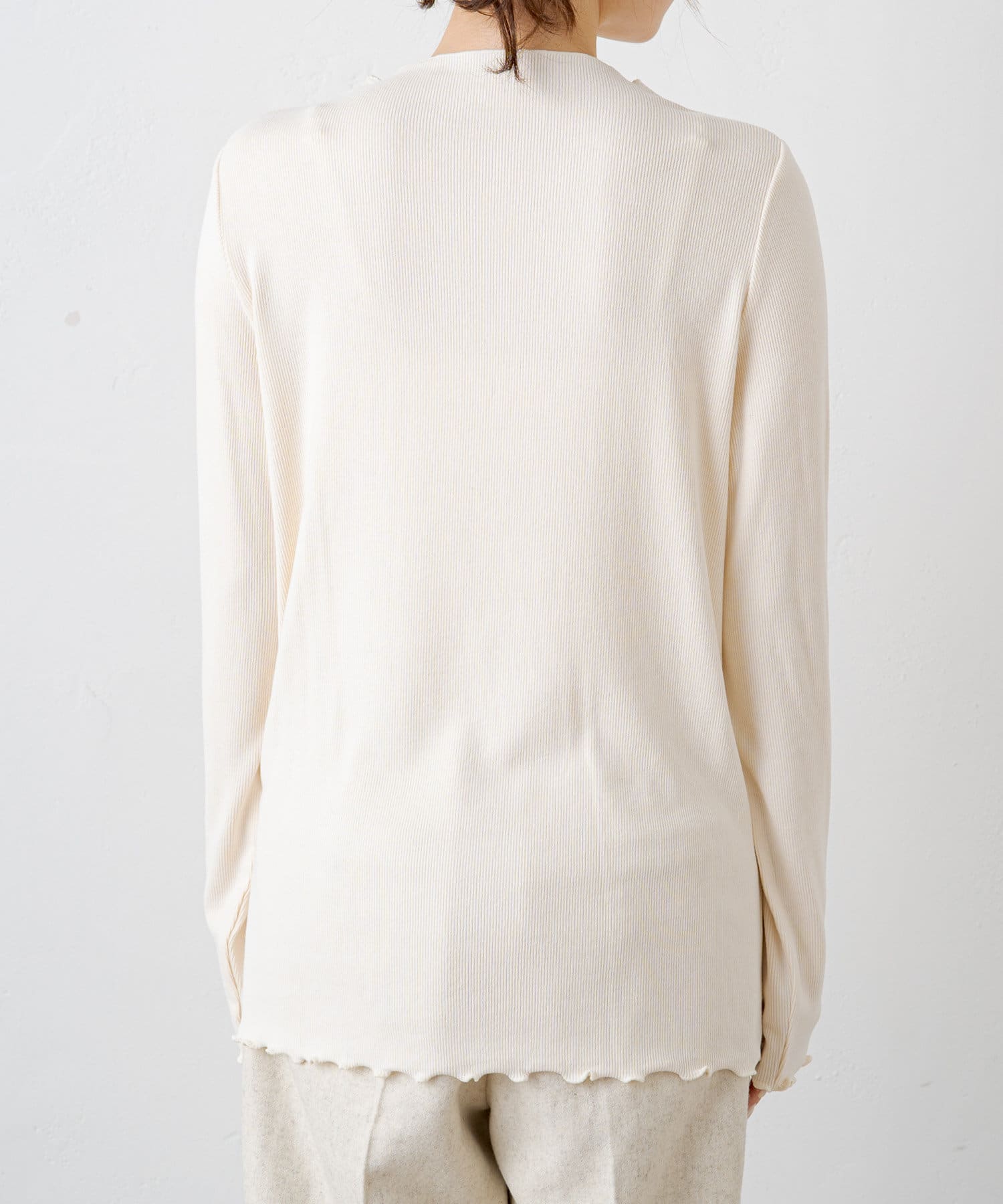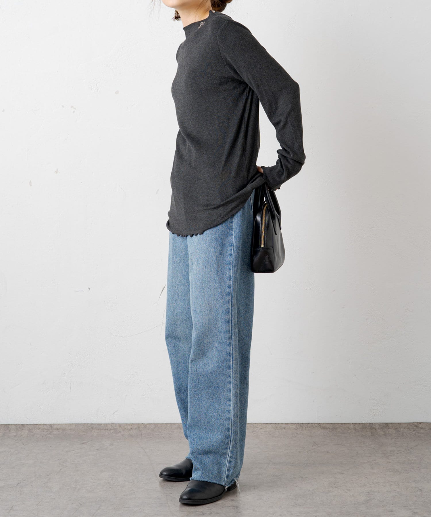 程よく開いたボトルネックは窮屈感がなく、ハイネックが苦手な方にもオススメ。