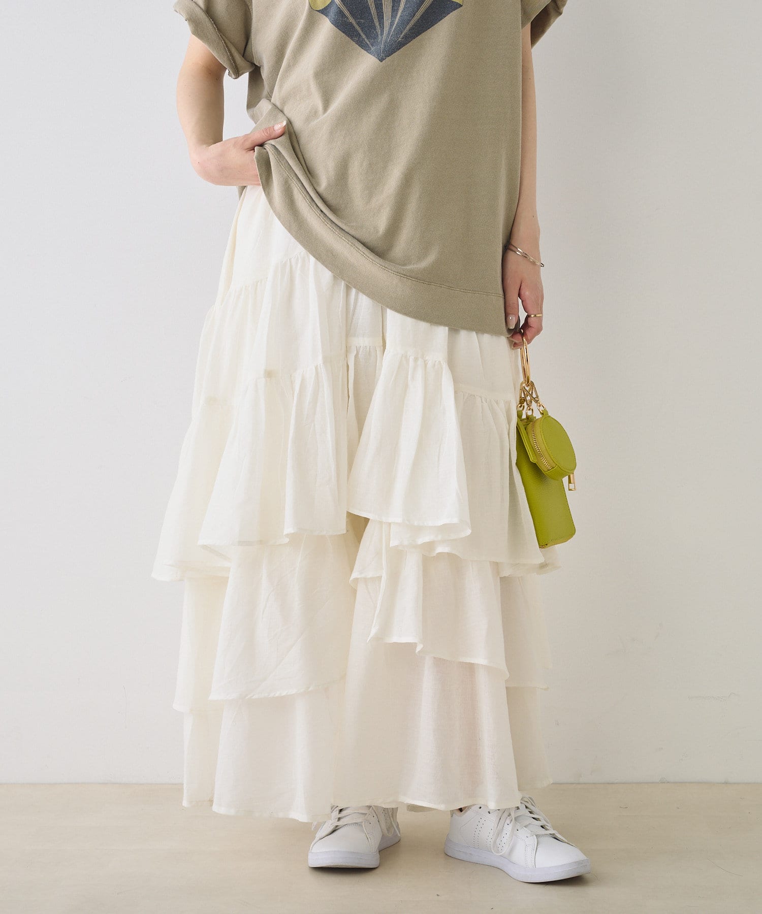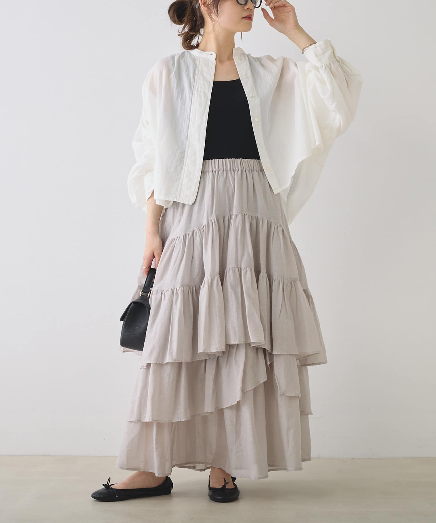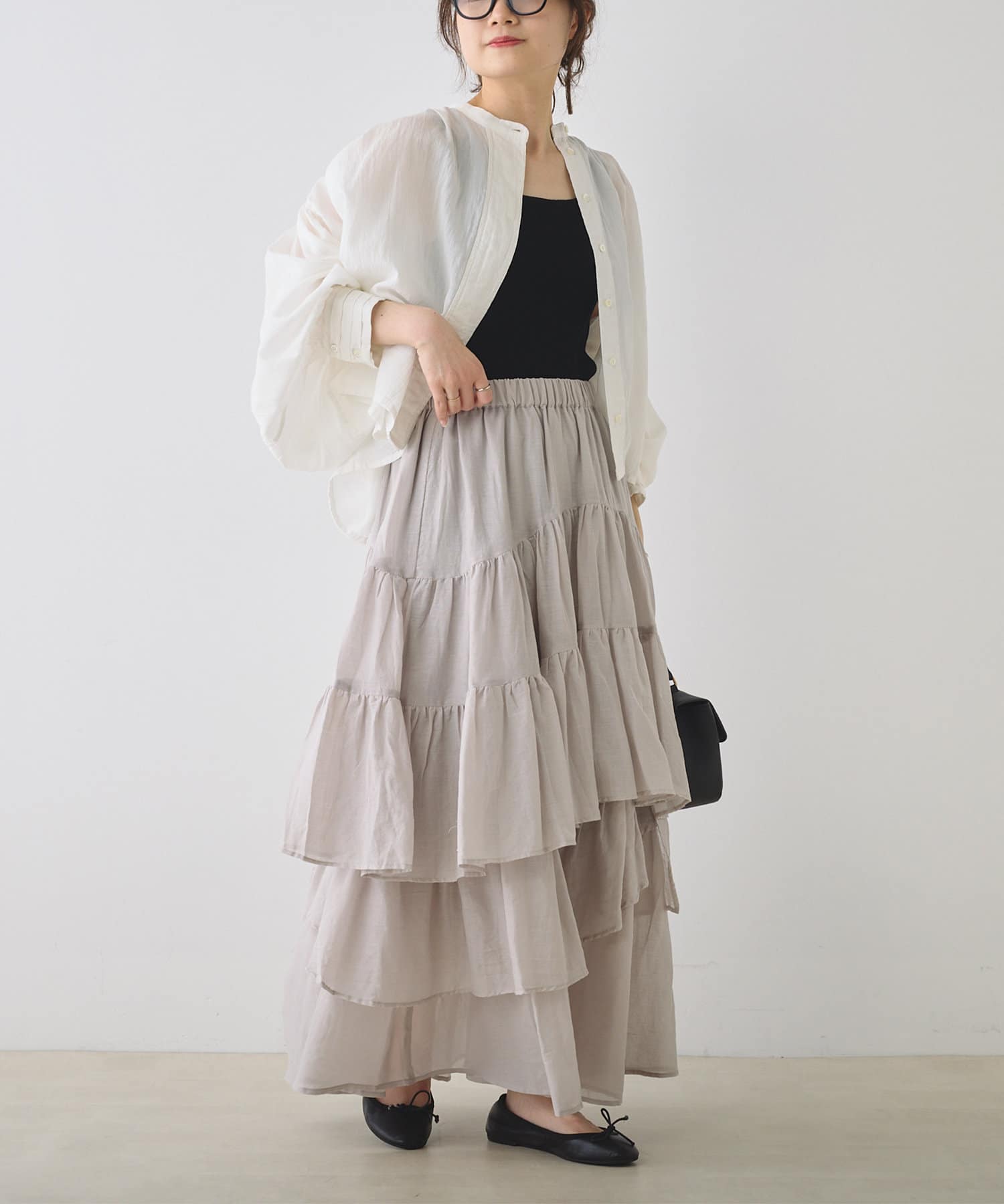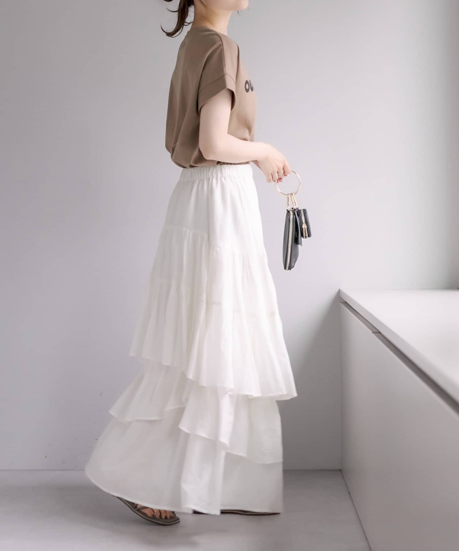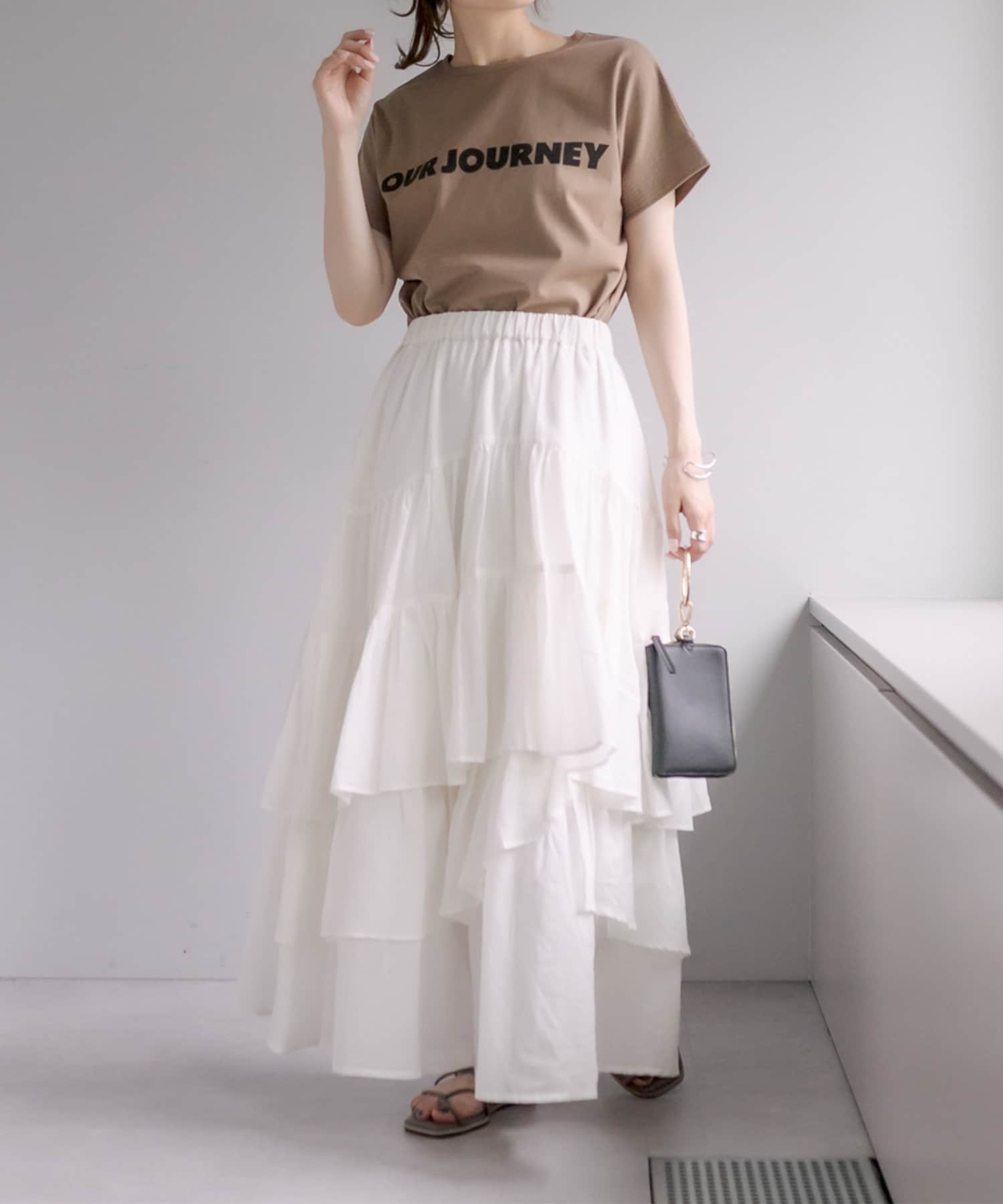 ボリュームがあるティアードスカートは、クロップド丈やコンパクトめなトップスとの相性が良いですが、