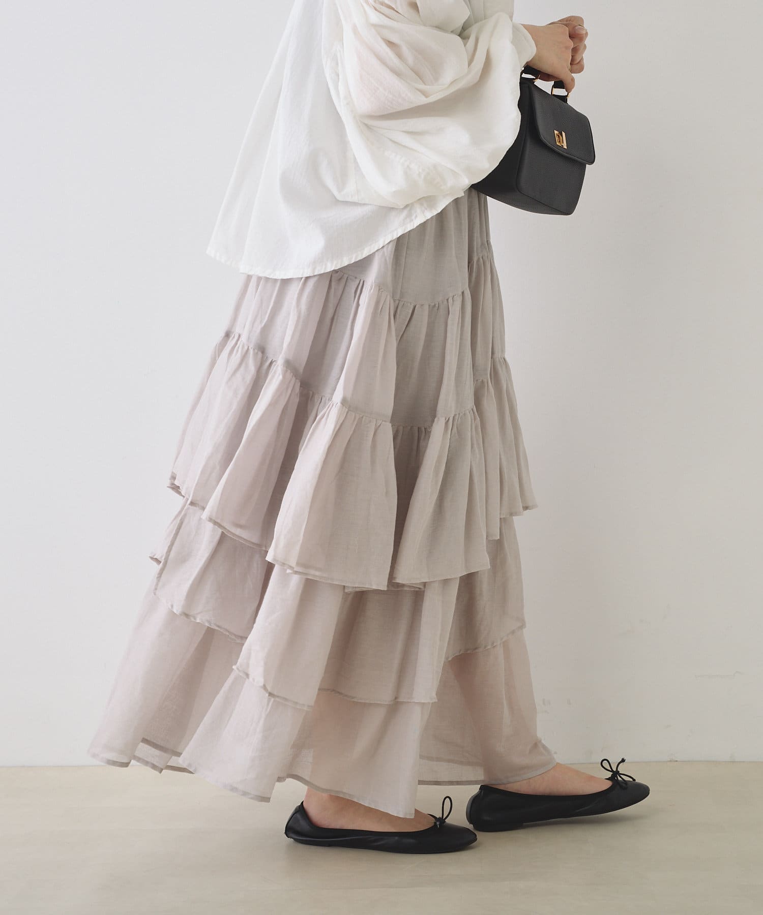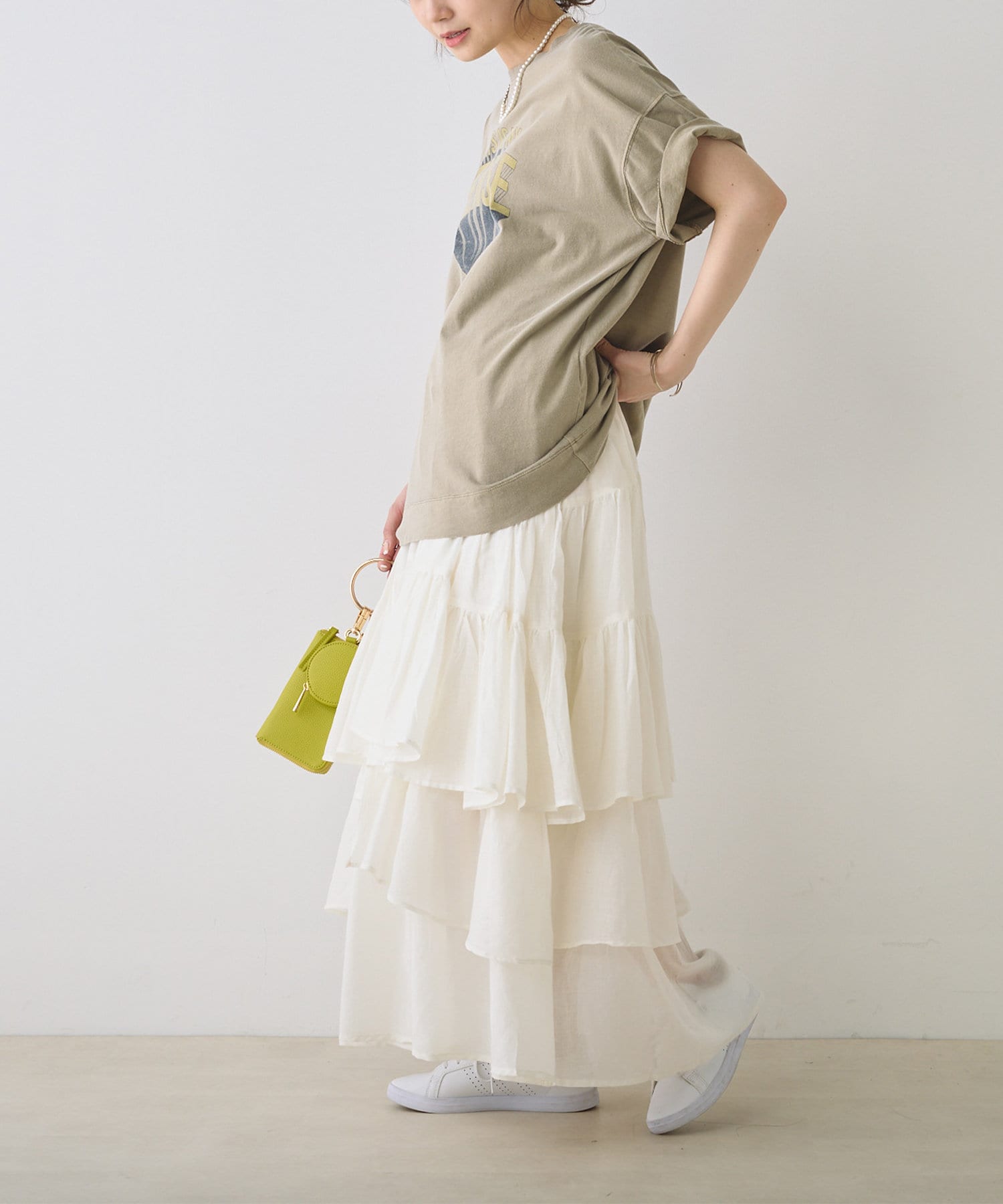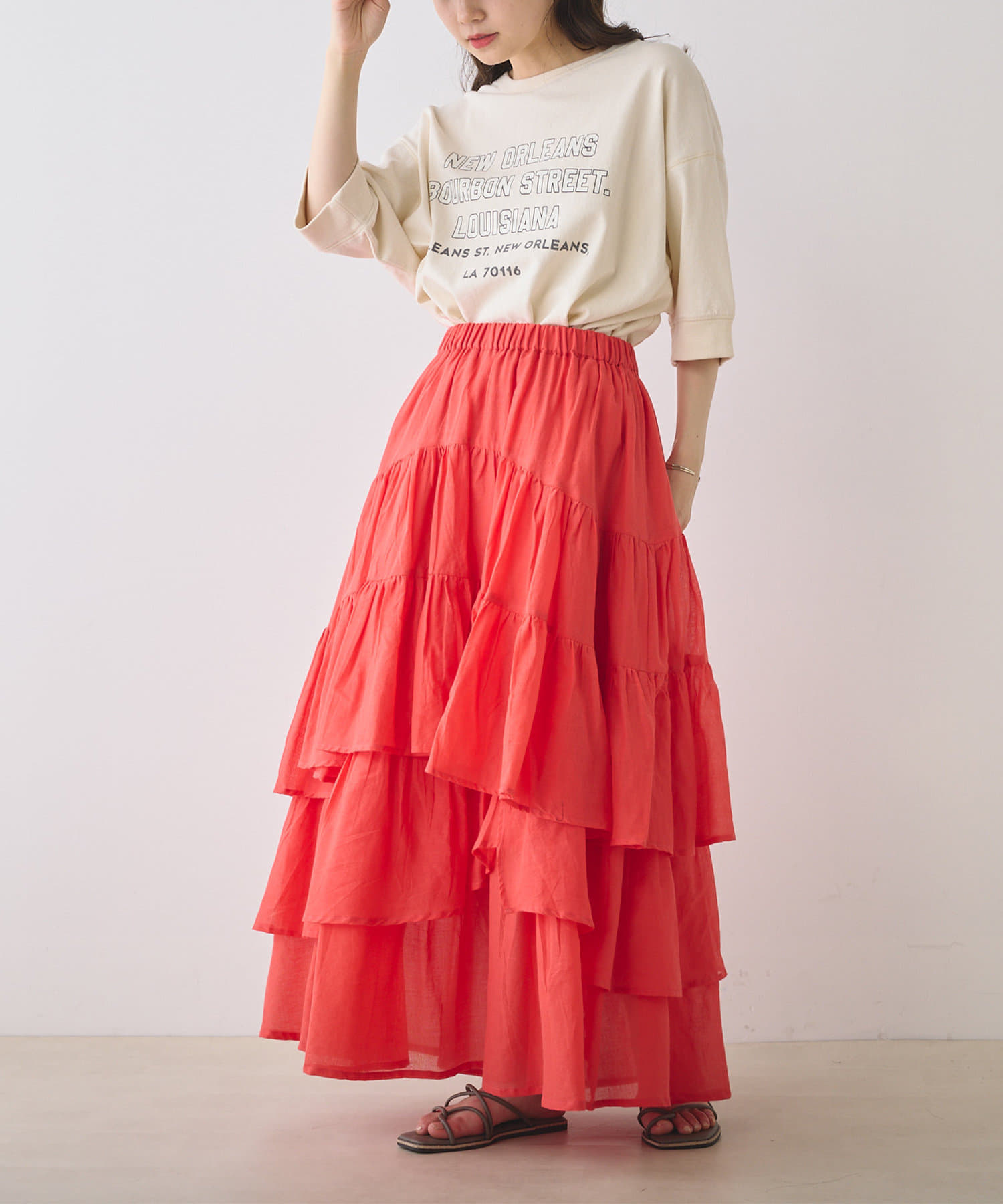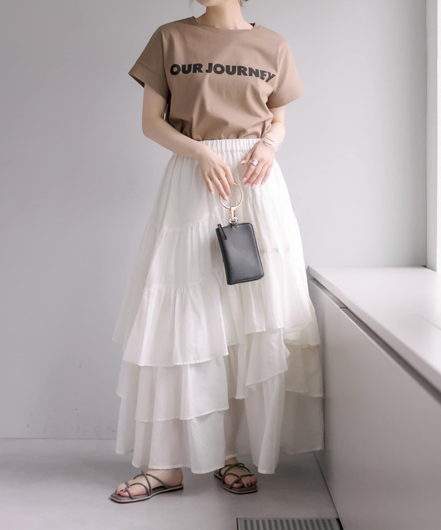 ボリュームがあるティアードスカートは、クロップド丈やコンパクトめなトップスとの相性が良いですが、