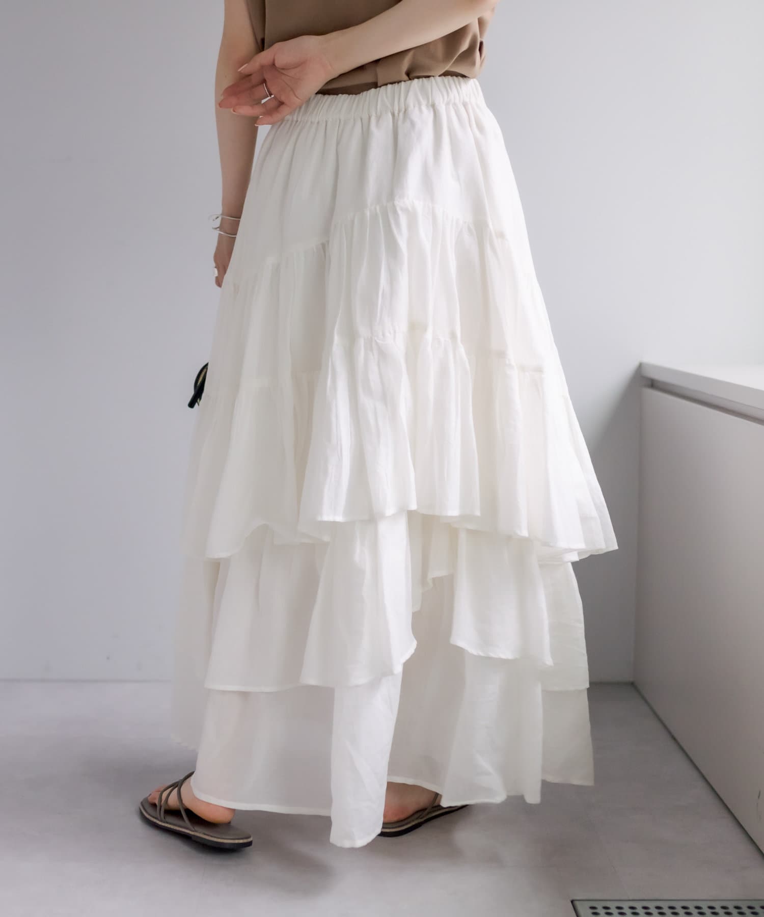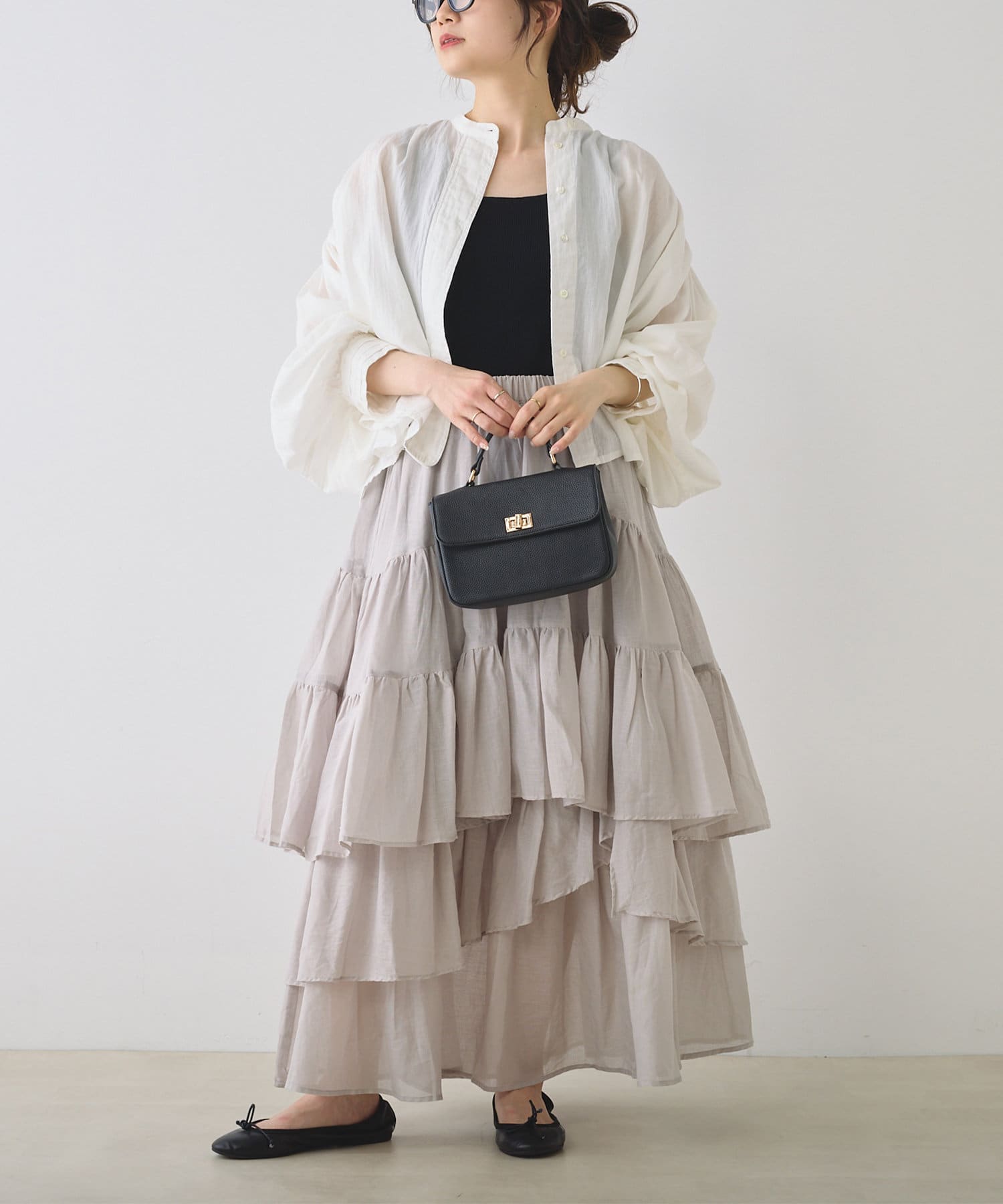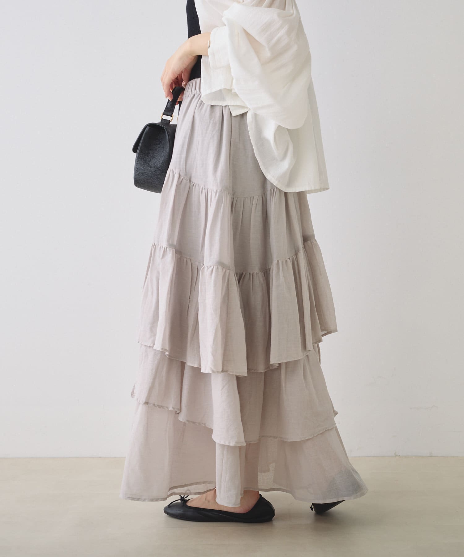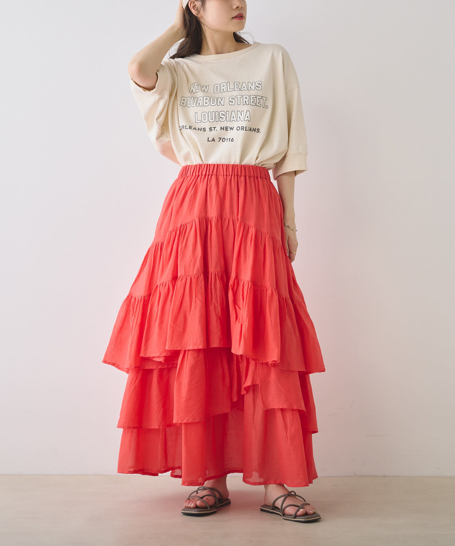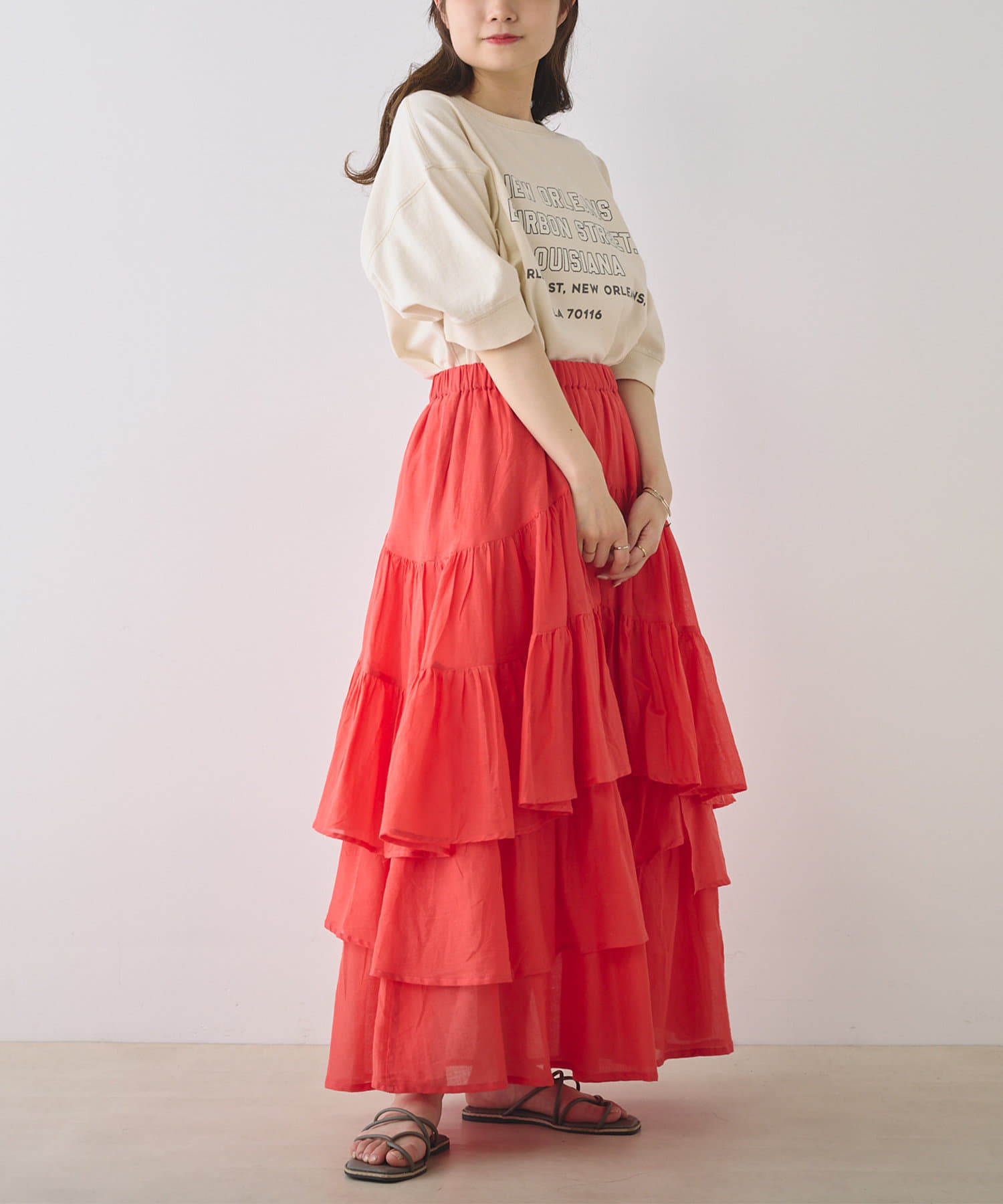 ボリュームがあるティアードスカートは、クロップド丈やコンパクトめなトップスとの相性が良いですが、