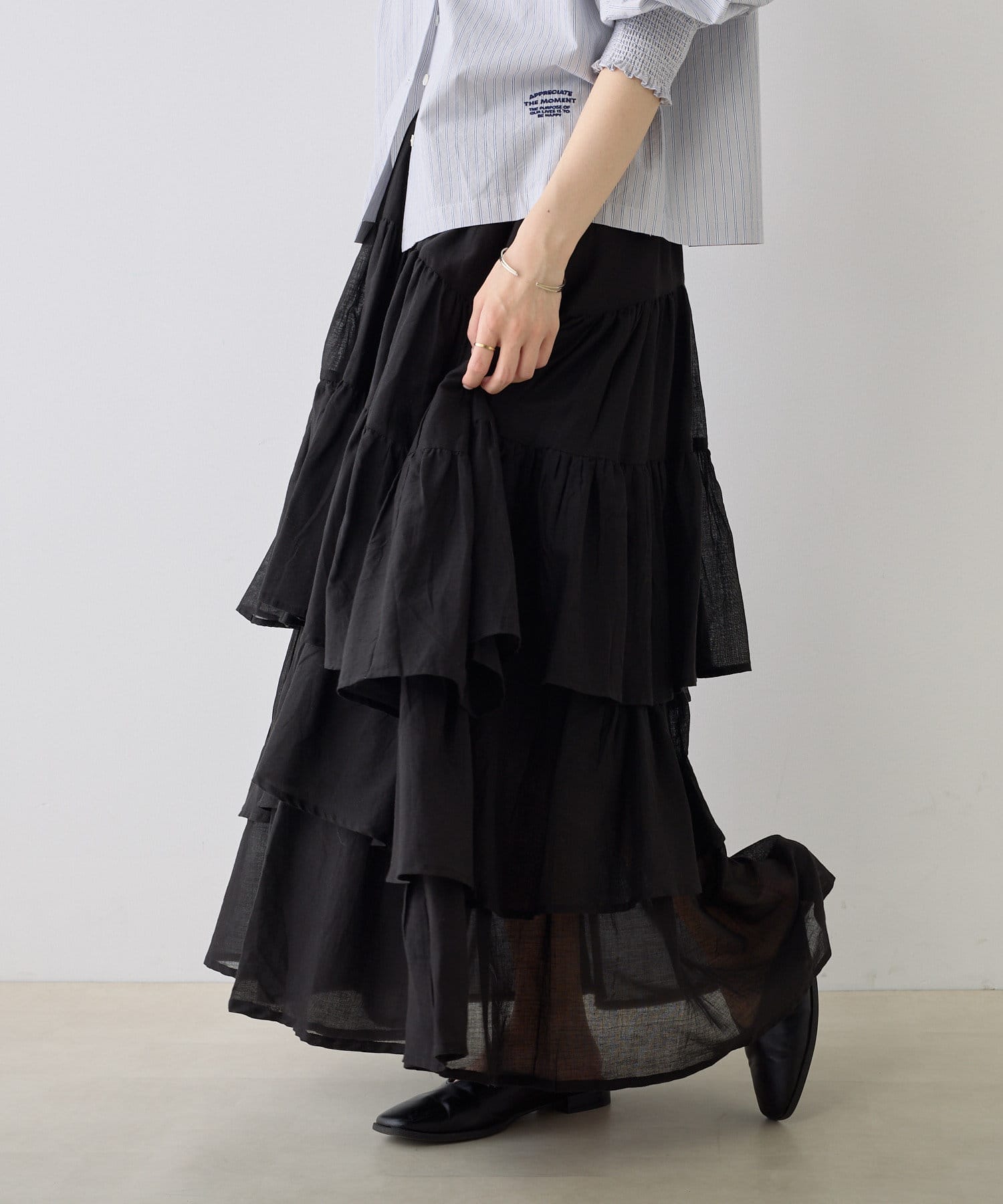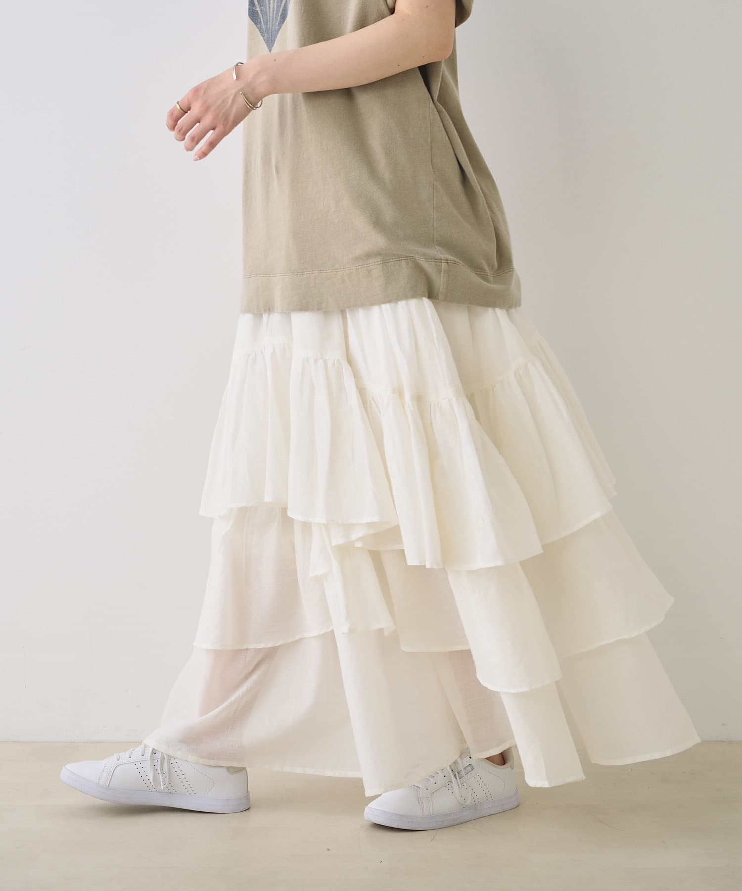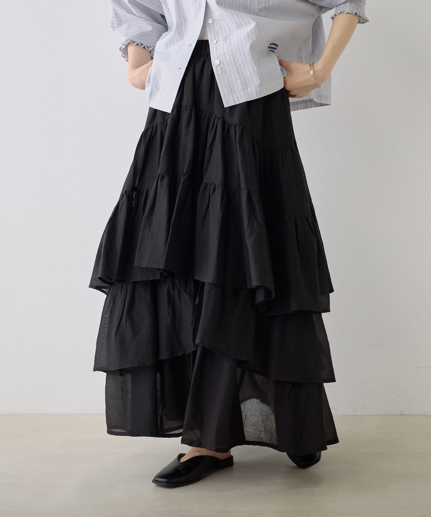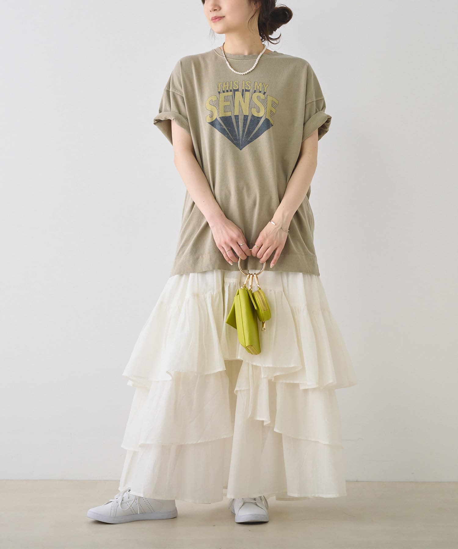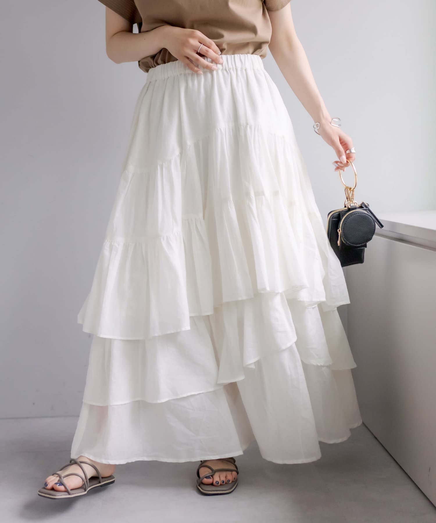 ボリュームがあるティアードスカートは、クロップド丈やコンパクトめなトップスとの相性が良いですが、