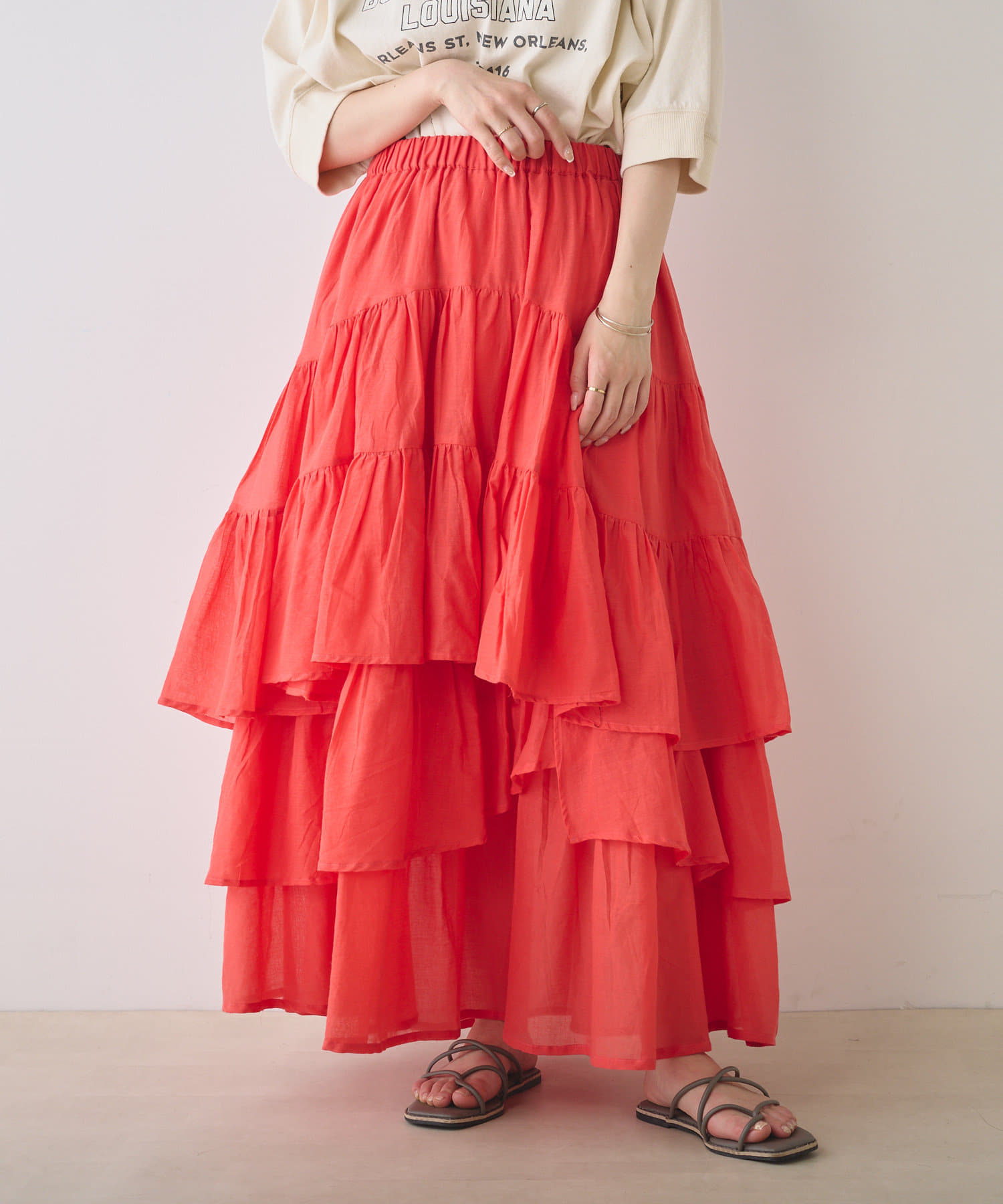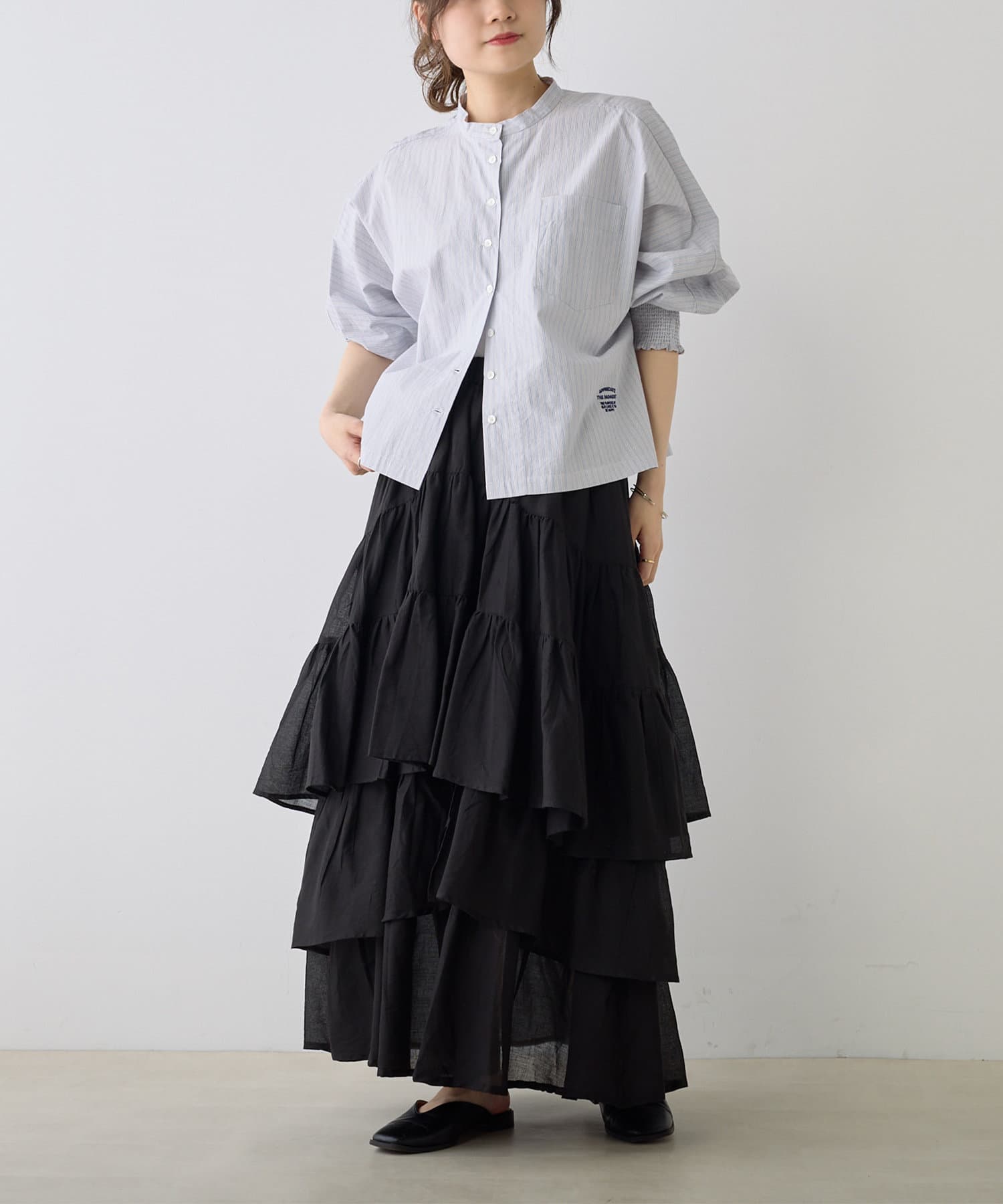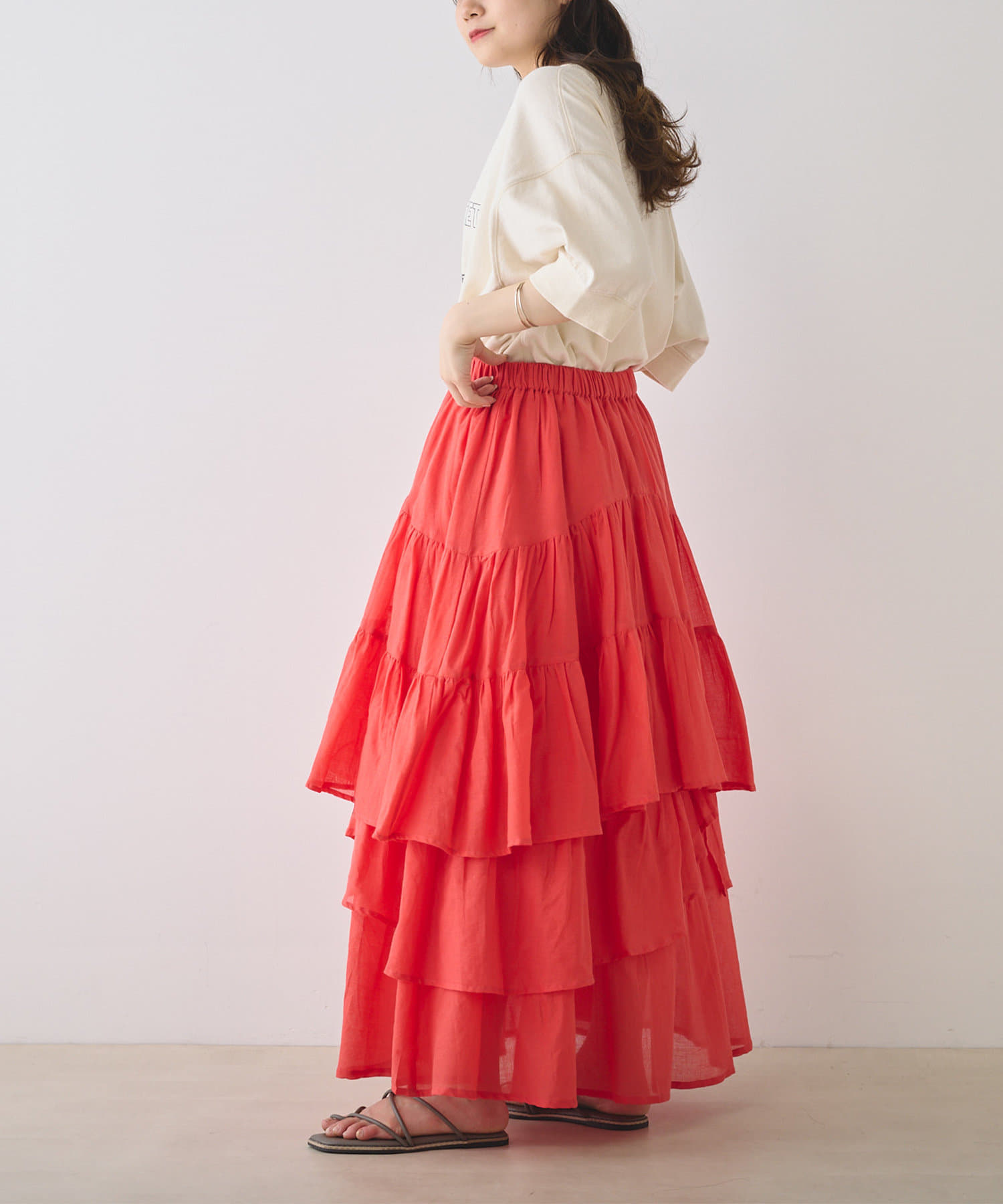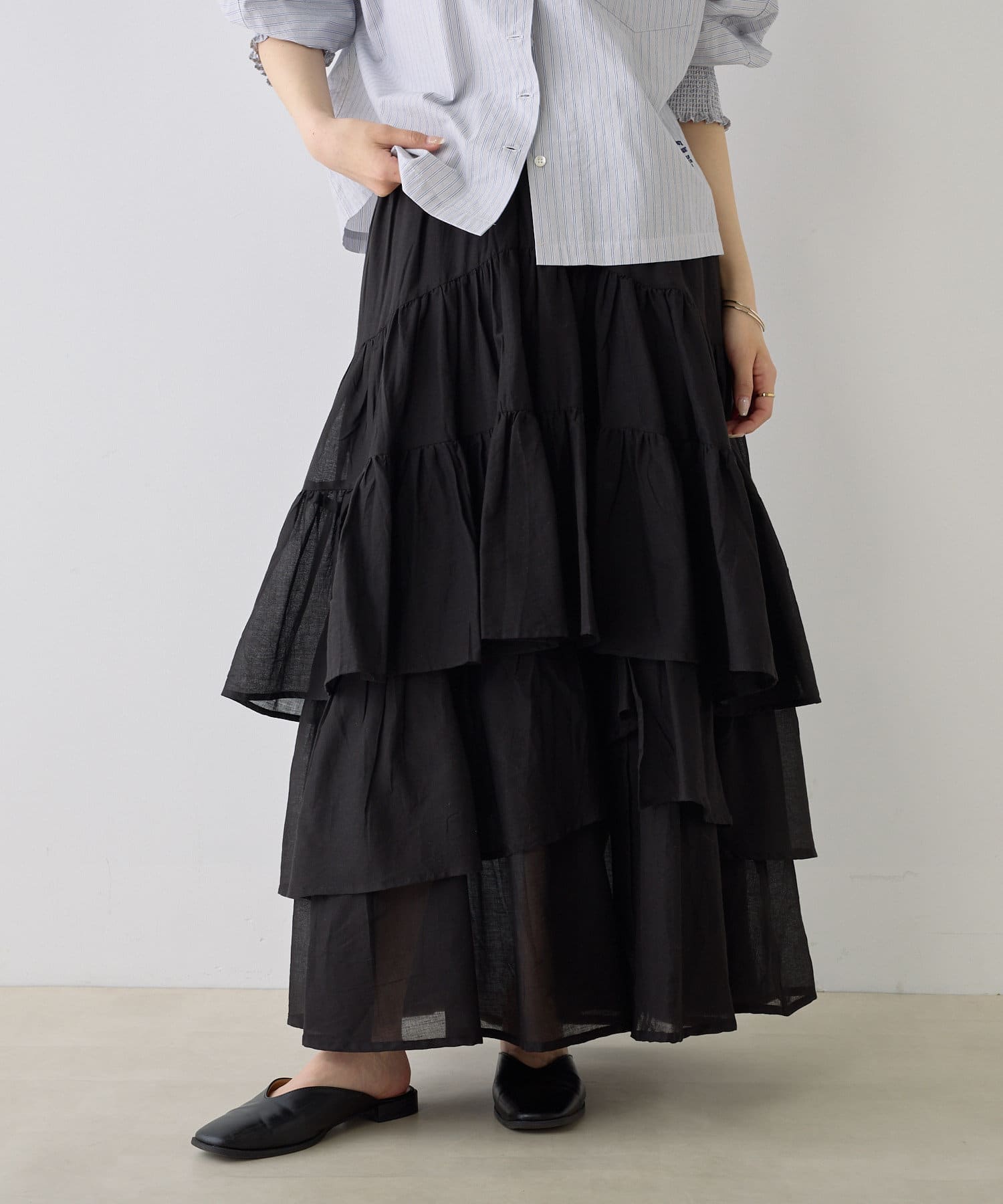 ボリュームがあるティアードスカートは、クロップド丈やコンパクトめなトップスとの相性が良いですが、