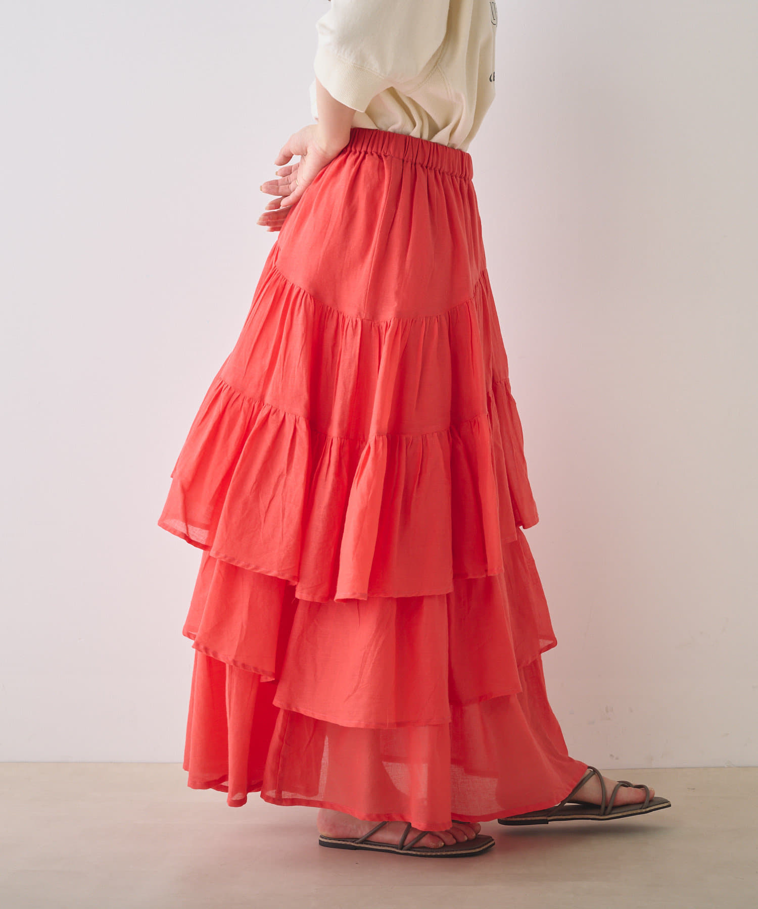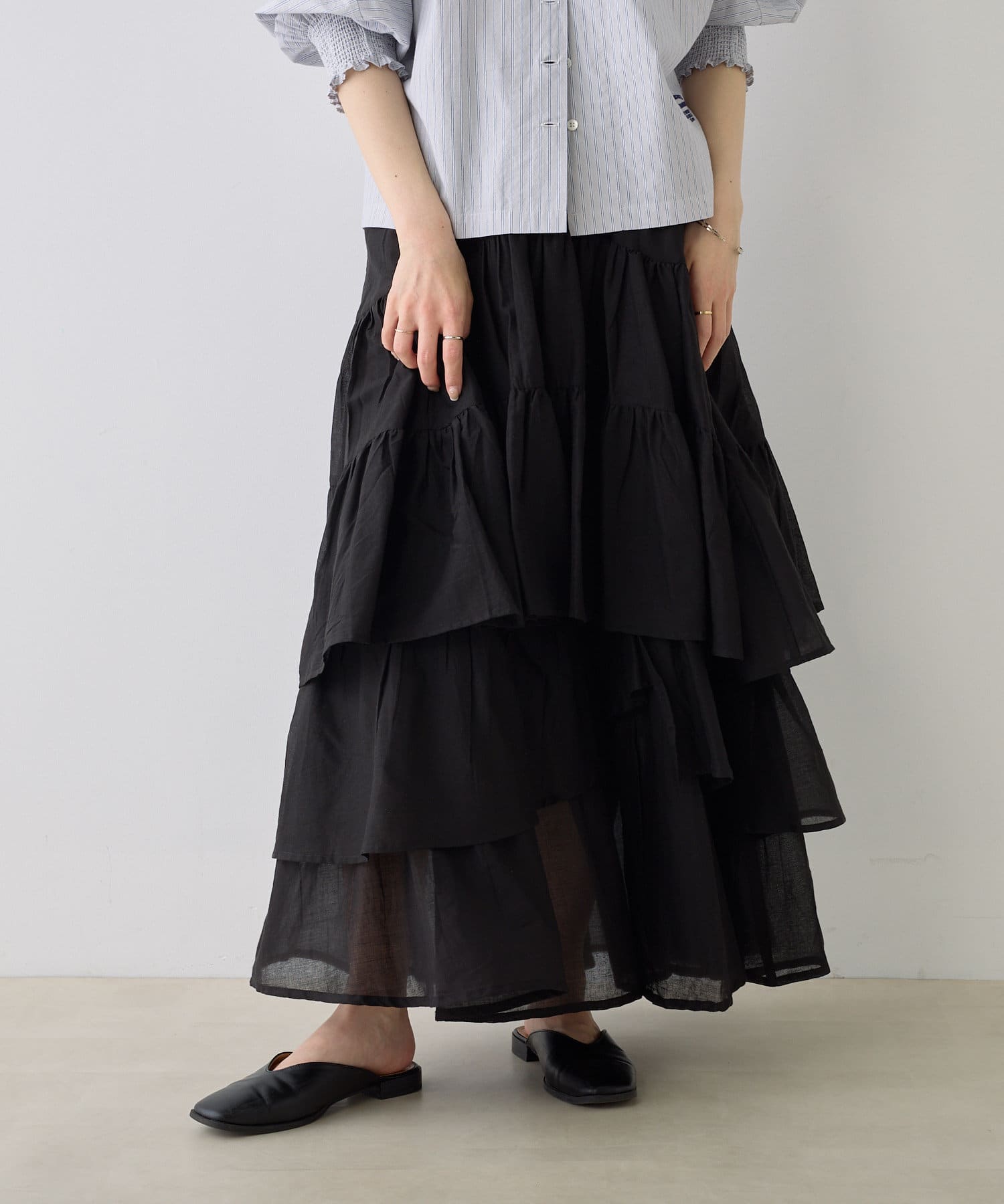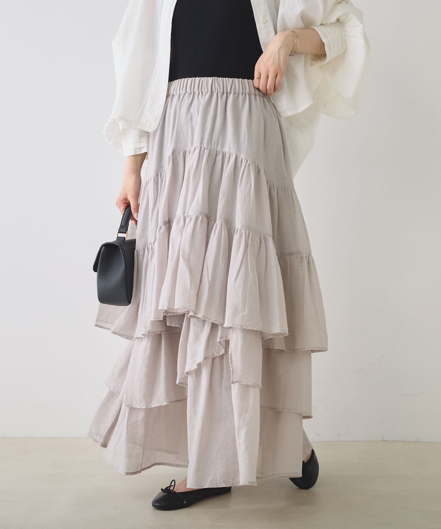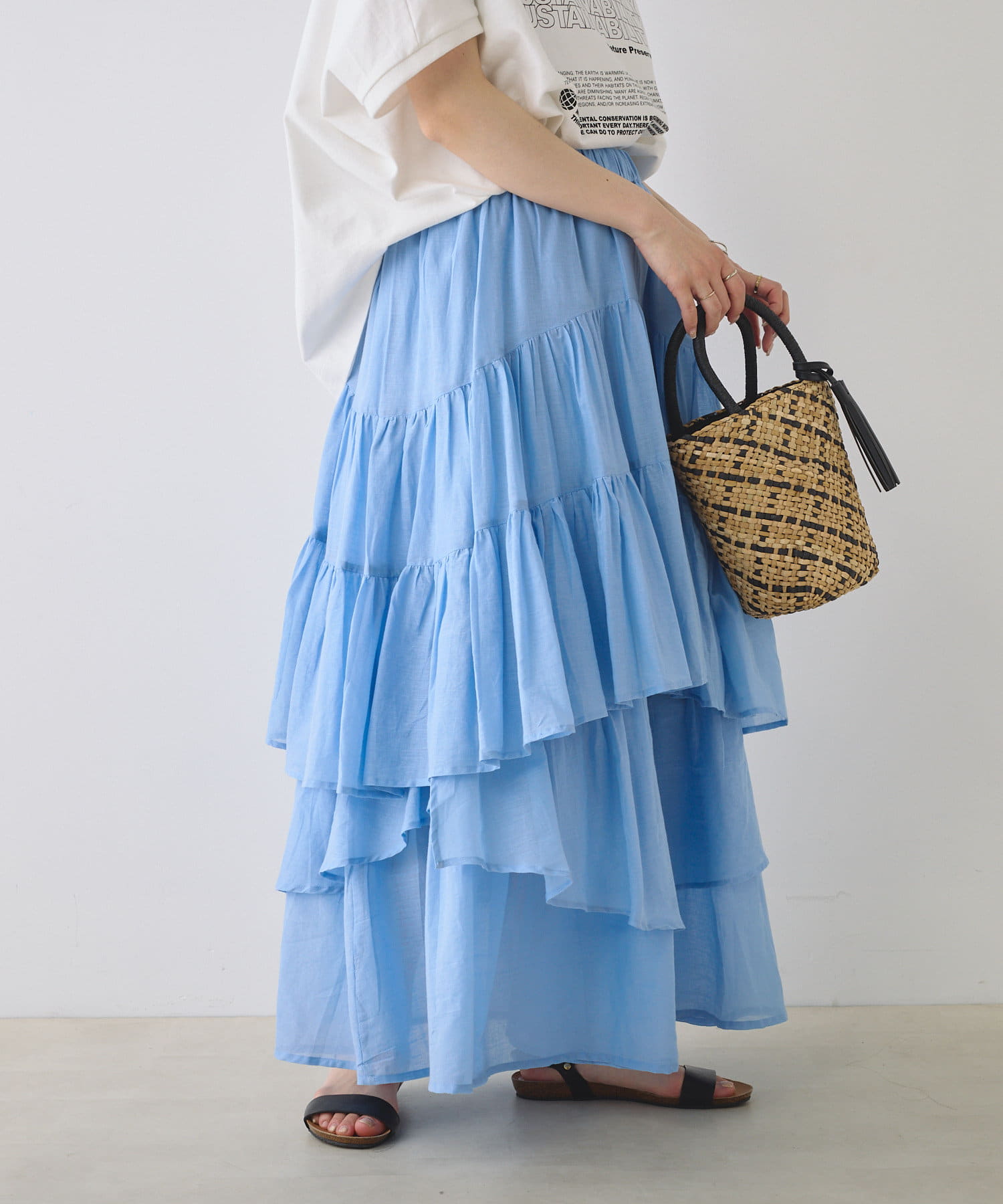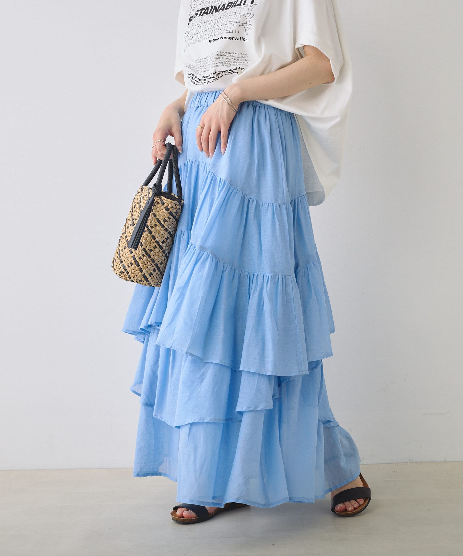 ボリュームがあるティアードスカートは、クロップド丈やコンパクトめなトップスとの相性が良いですが、