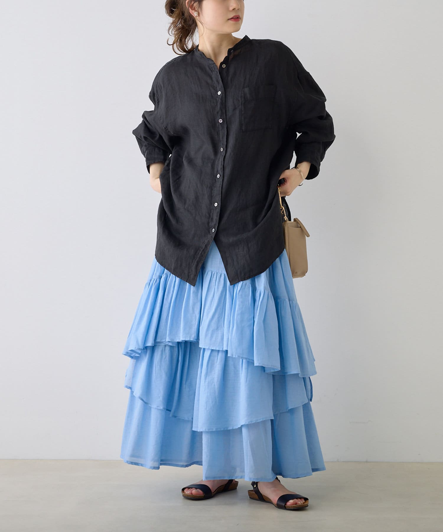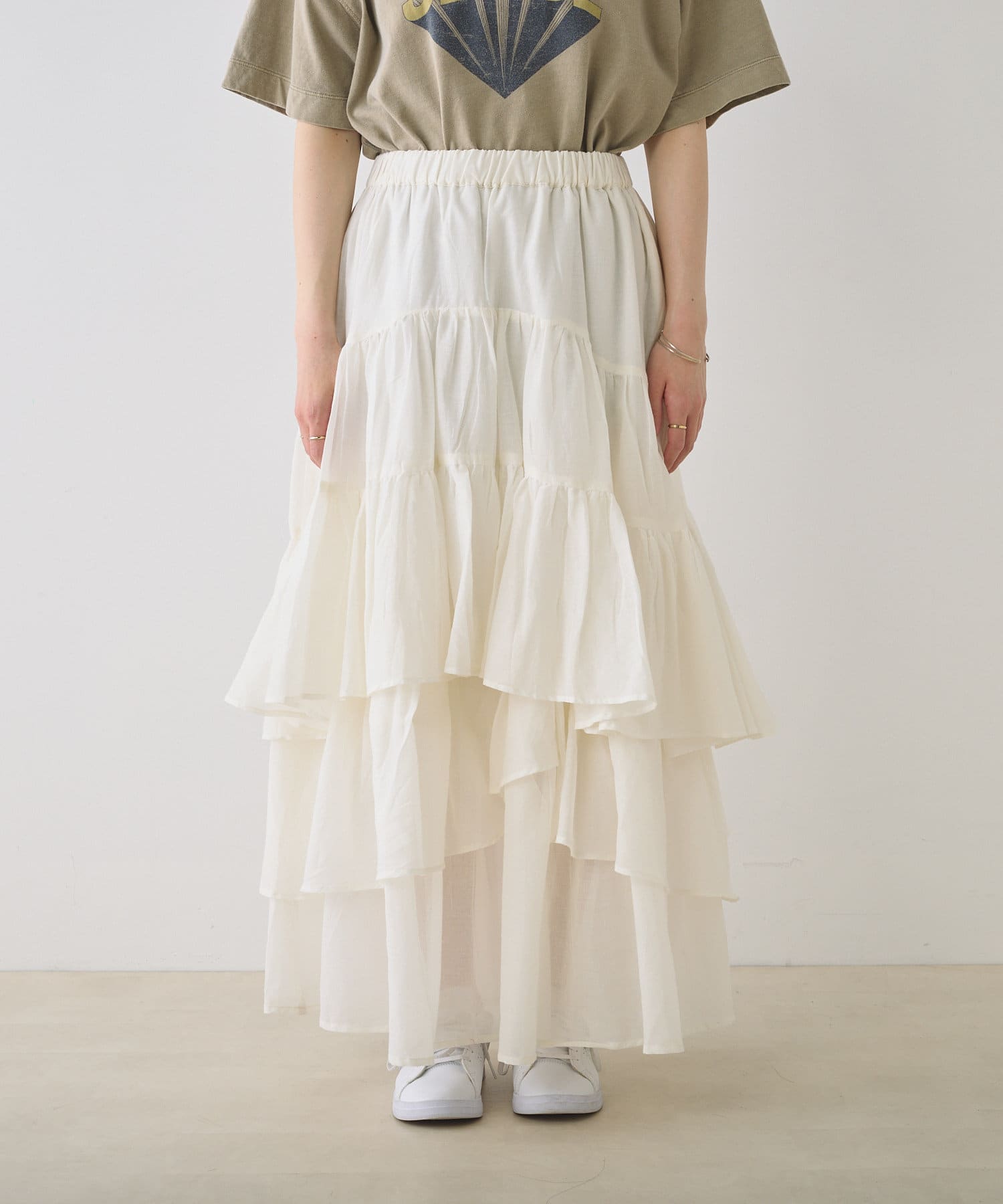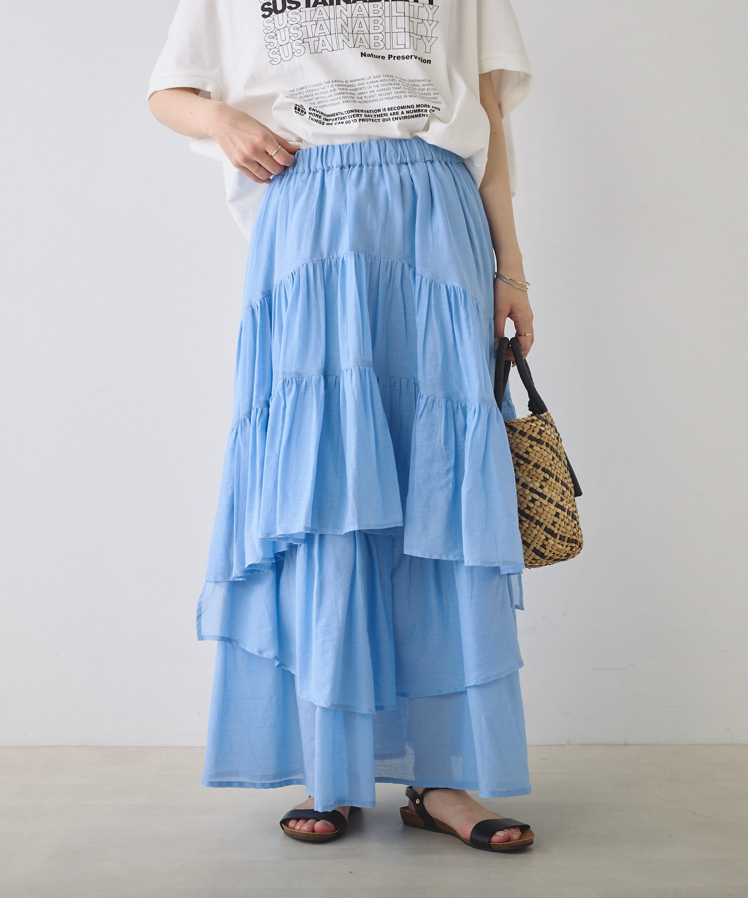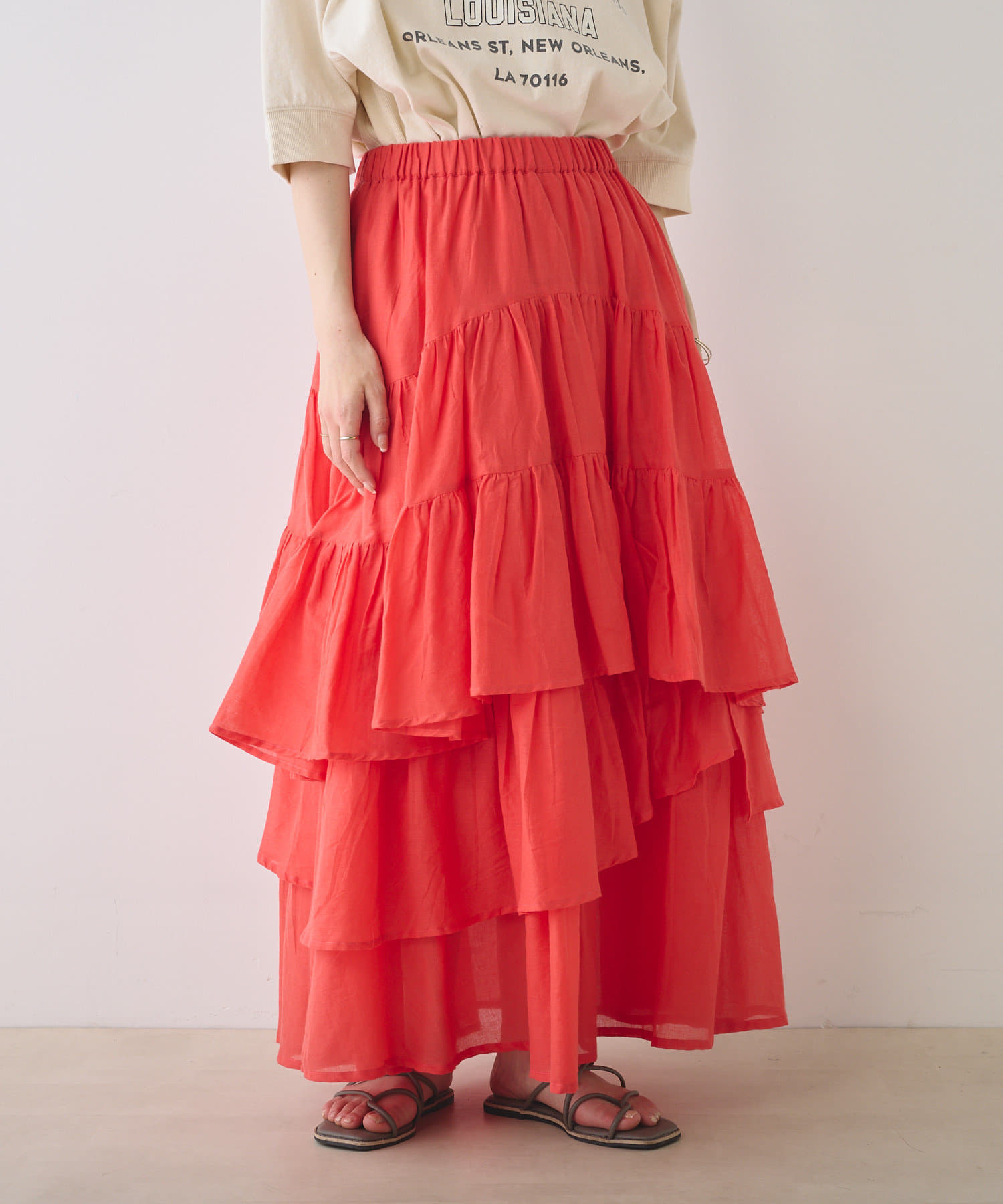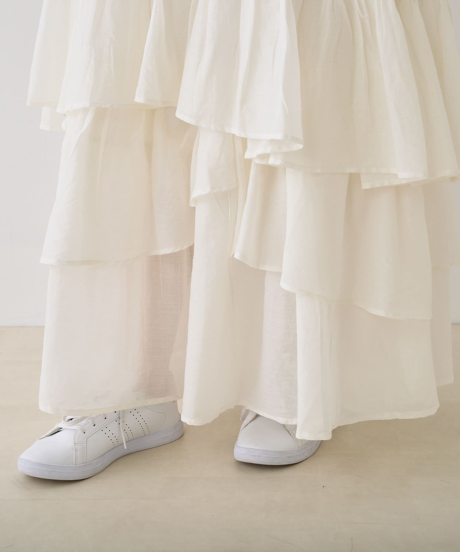 ボリュームがあるティアードスカートは、クロップド丈やコンパクトめなトップスとの相性が良いですが、