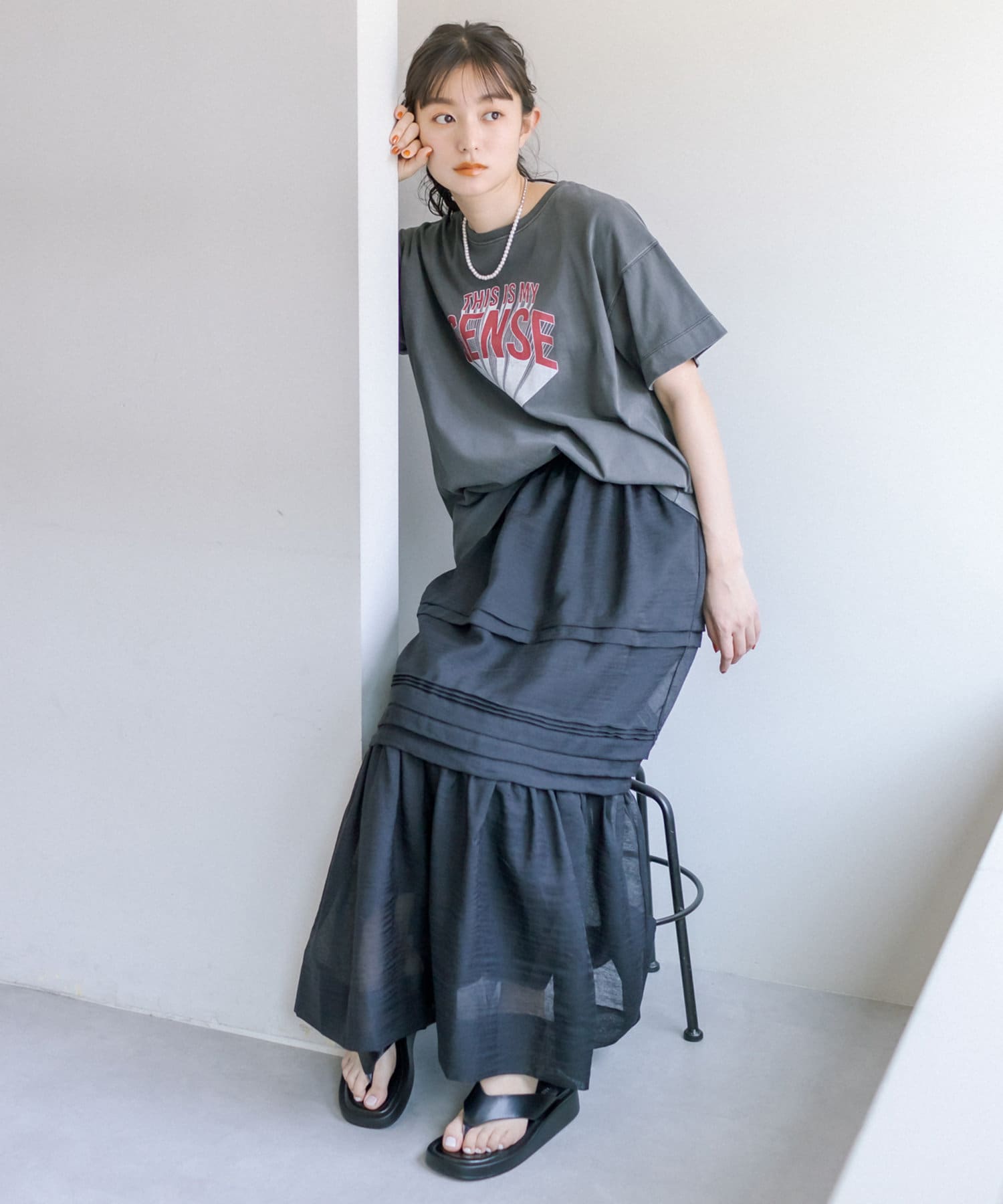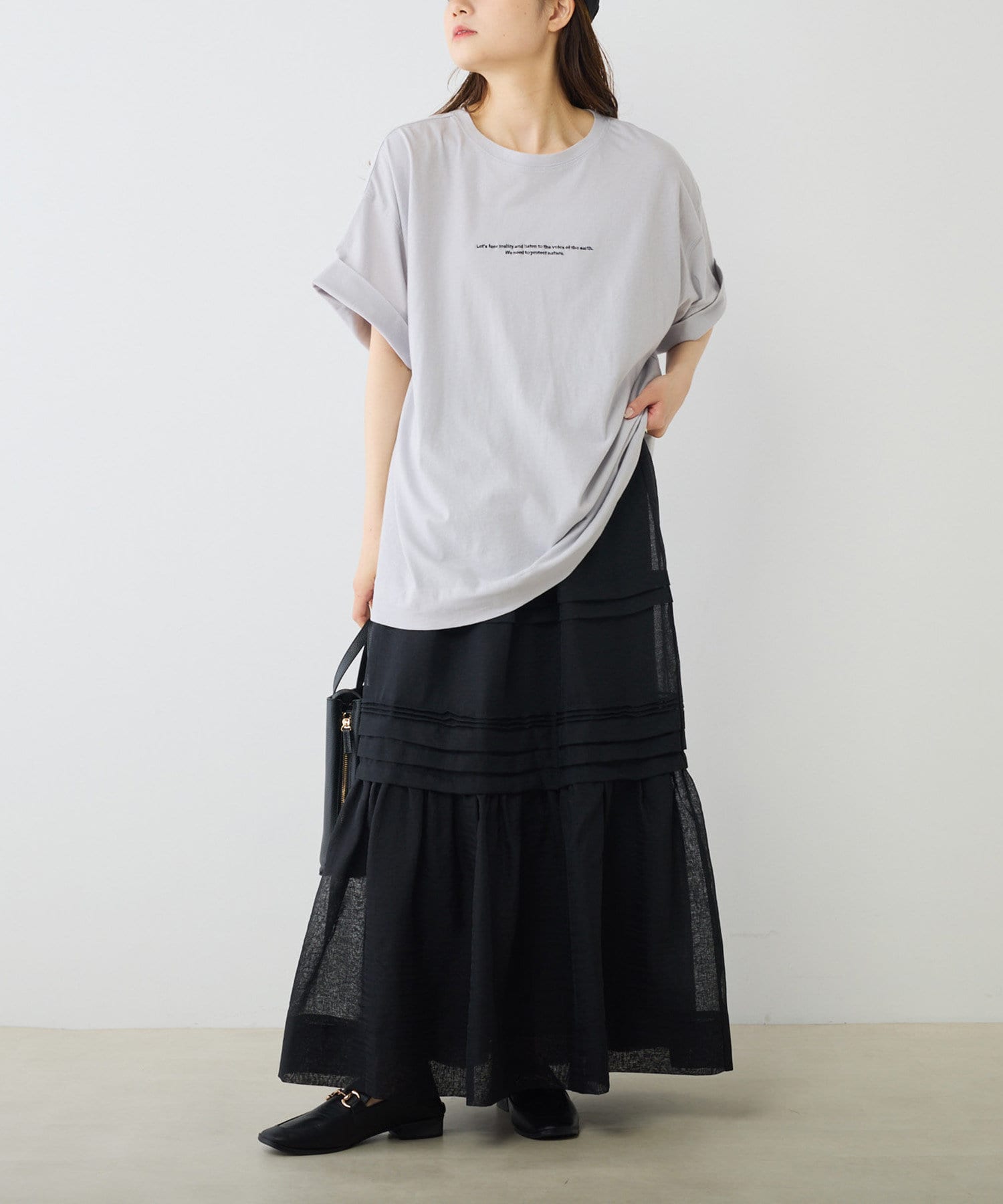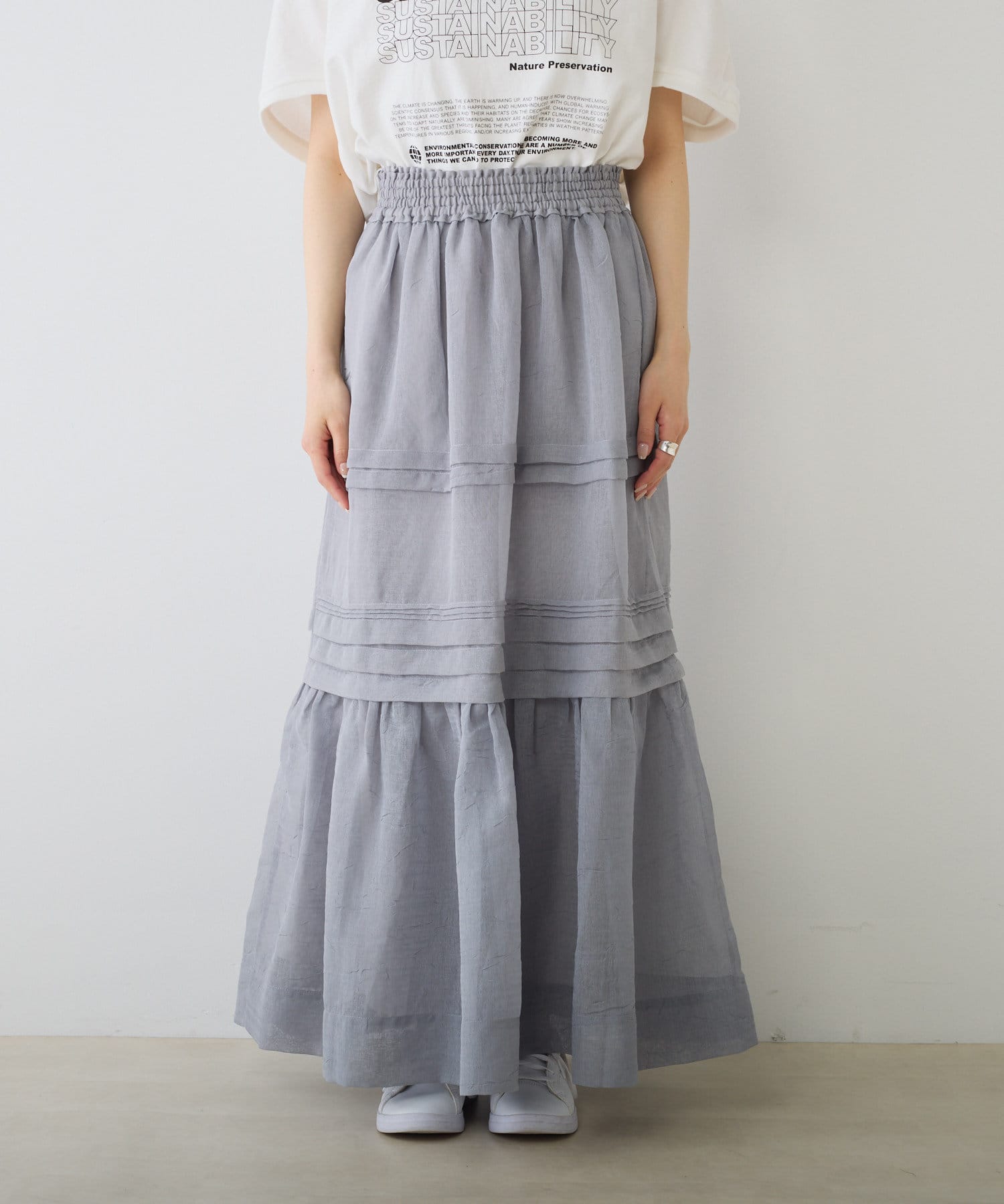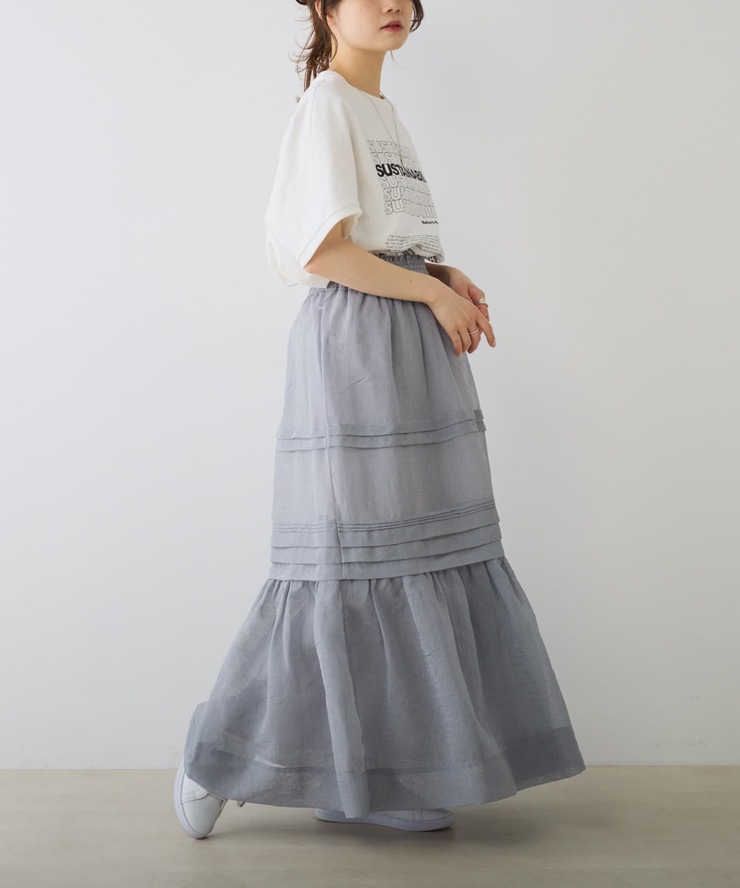 スウェットやTシャツなどのラフな合わせでもオーガンジー素材が女性らしさをプラス。