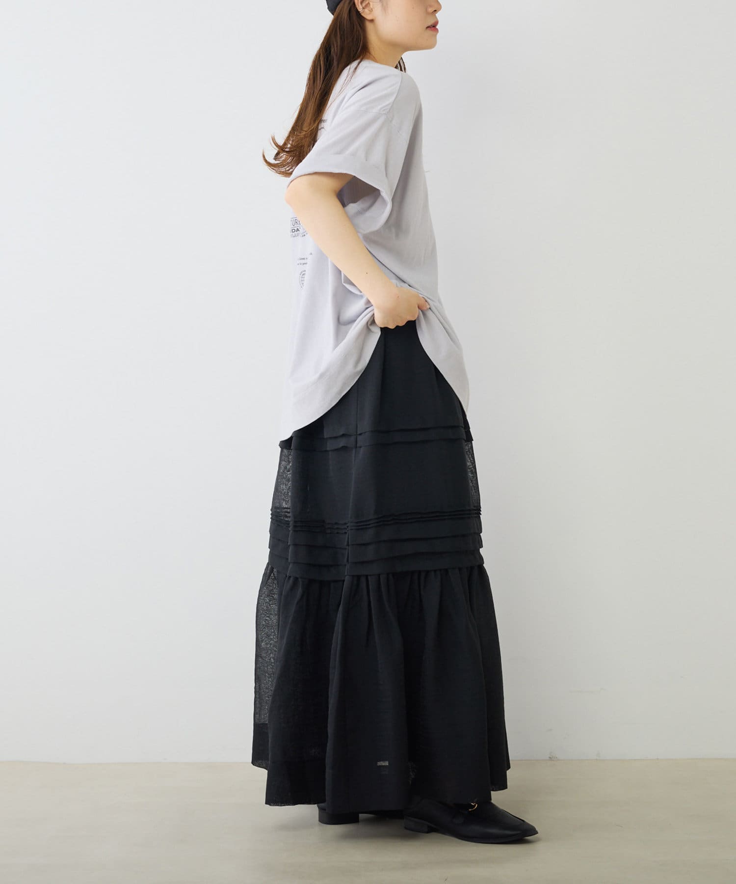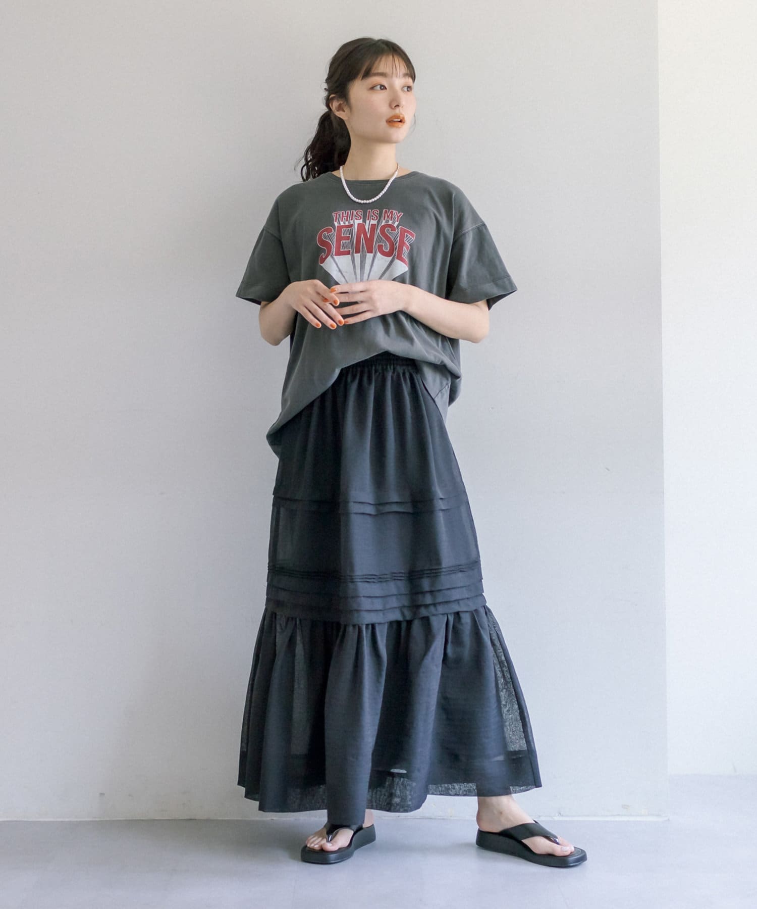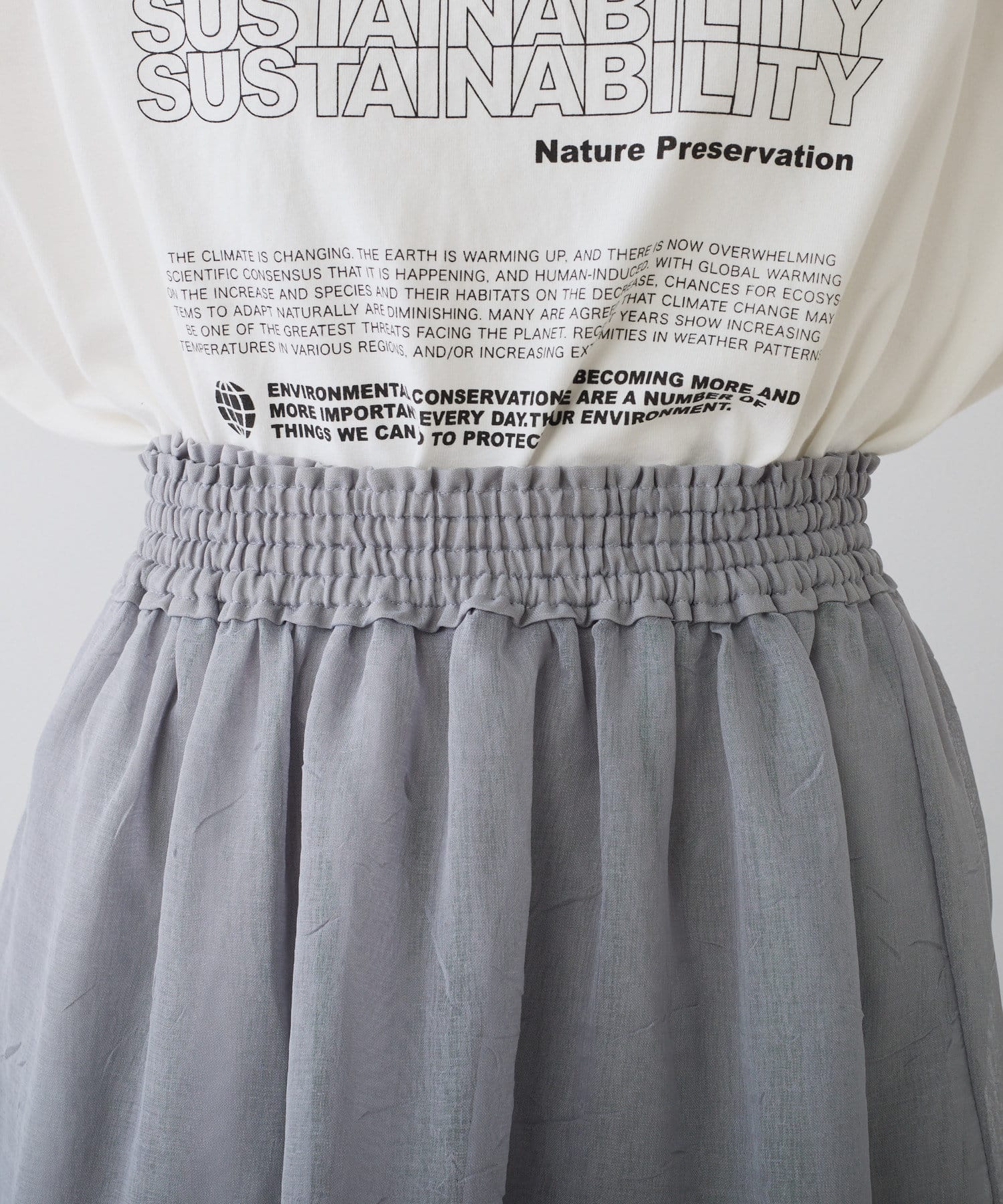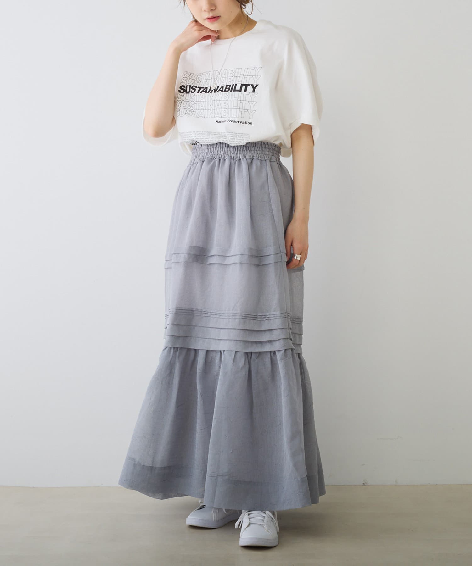 スウェットやTシャツなどのラフな合わせでもオーガンジー素材が女性らしさをプラス。