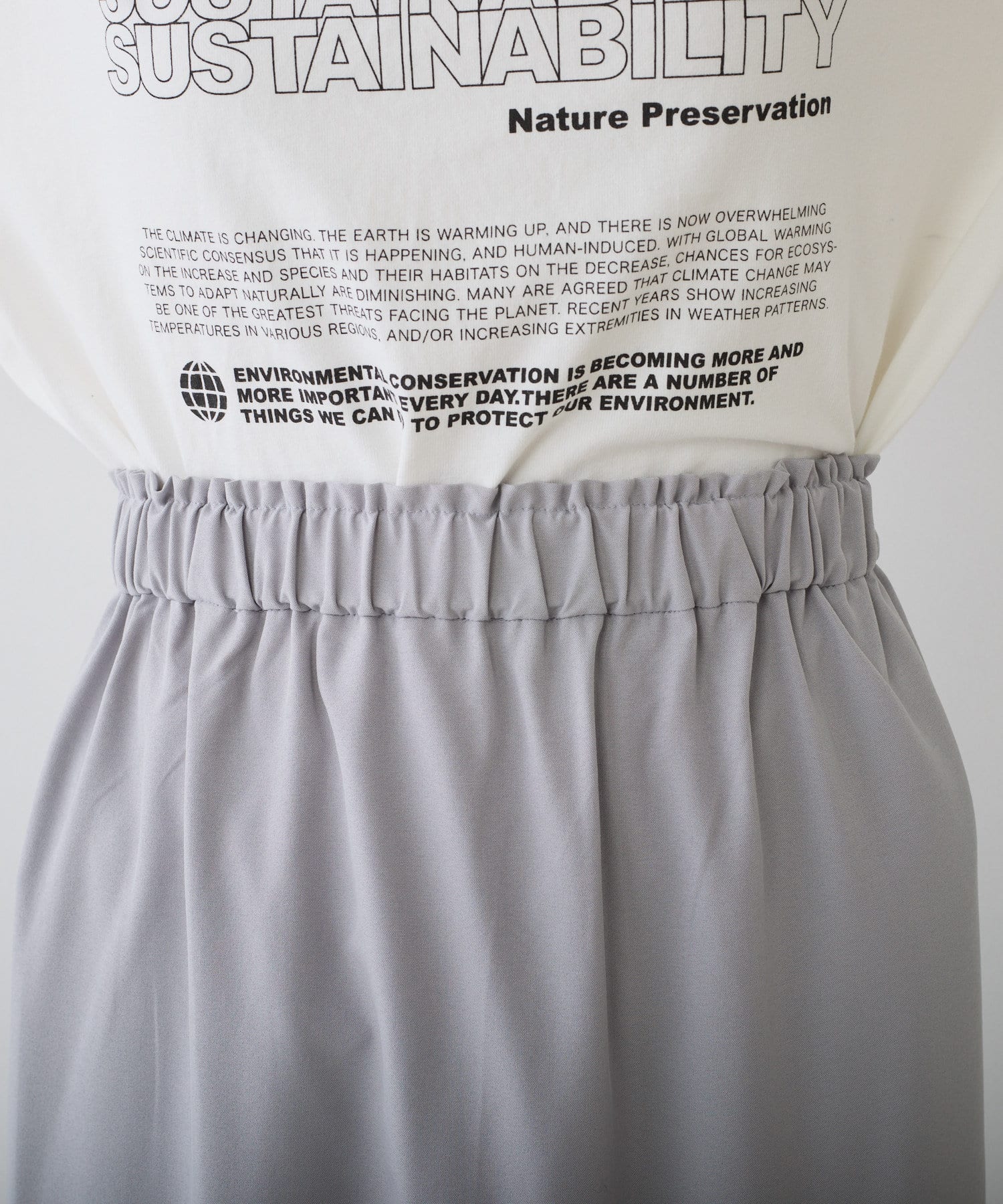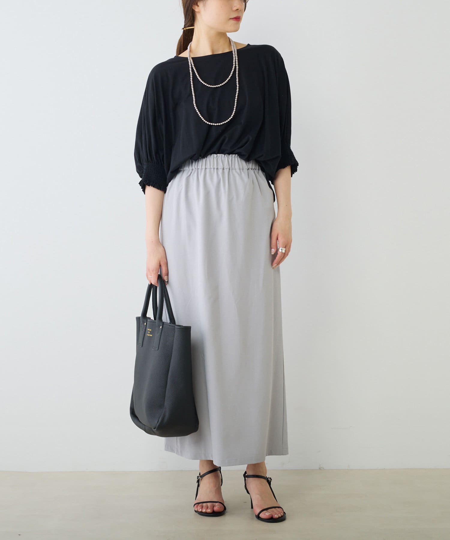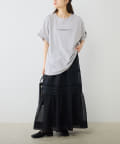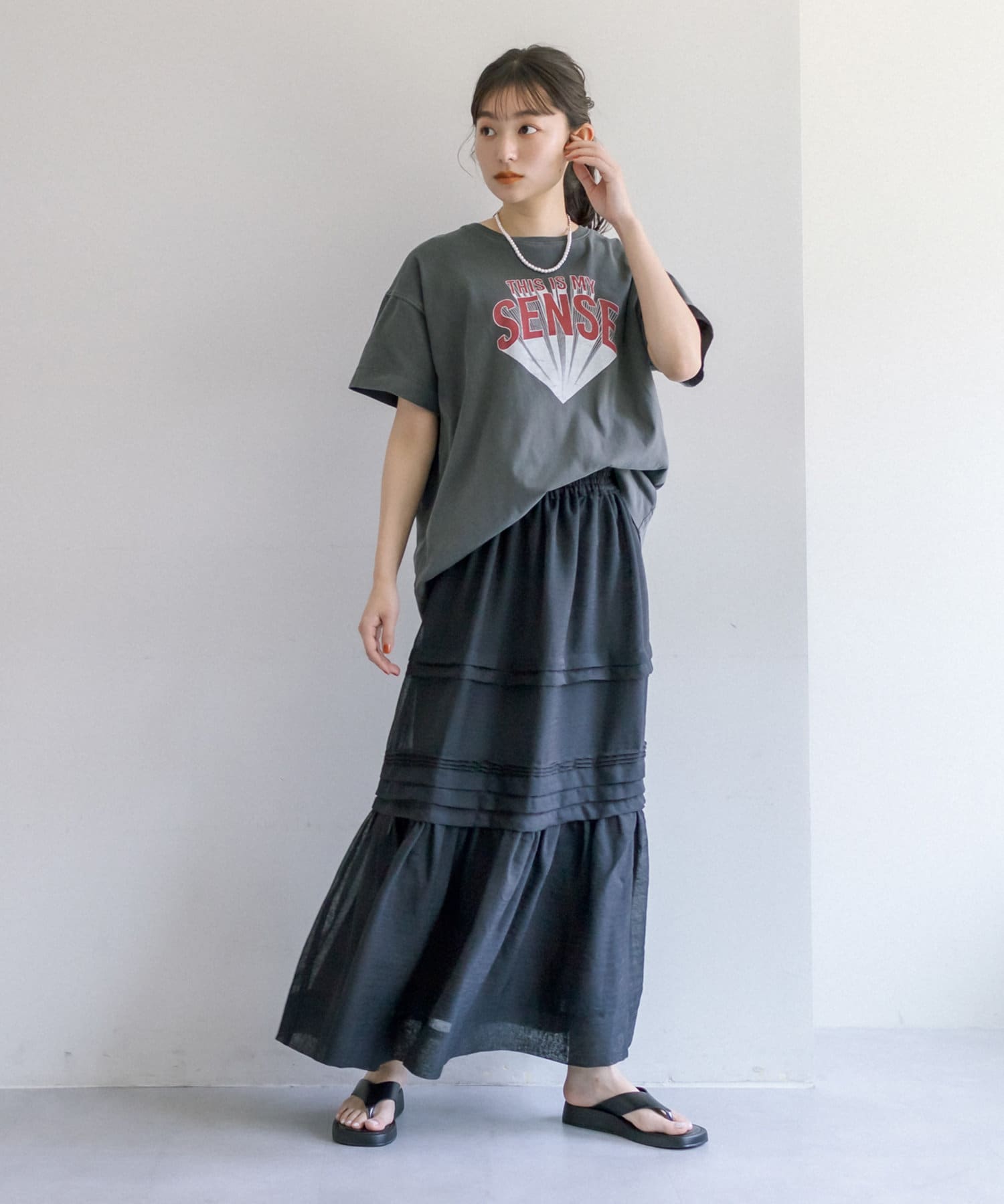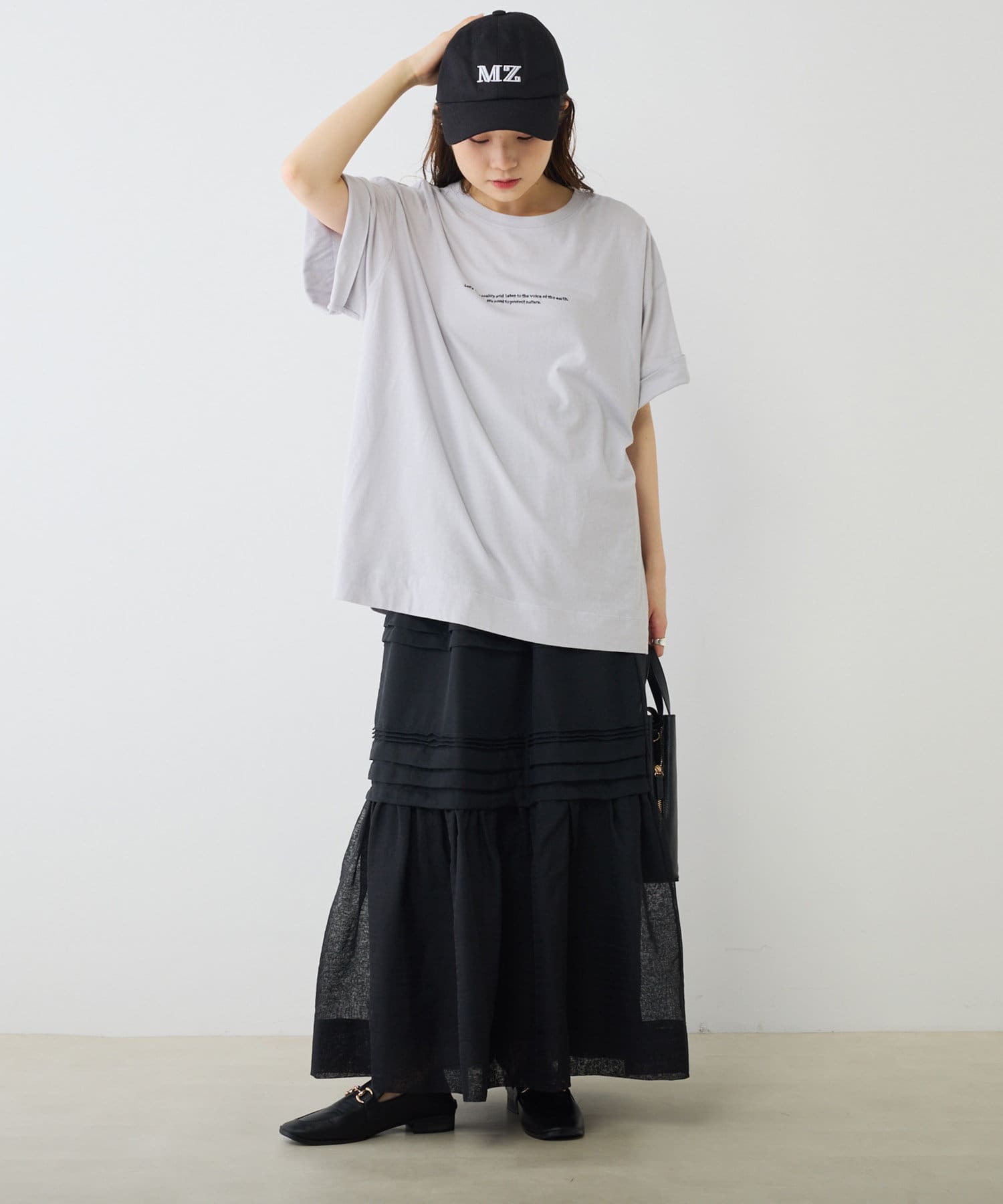スウェットやTシャツなどのラフな合わせでもオーガンジー素材が女性らしさをプラス。