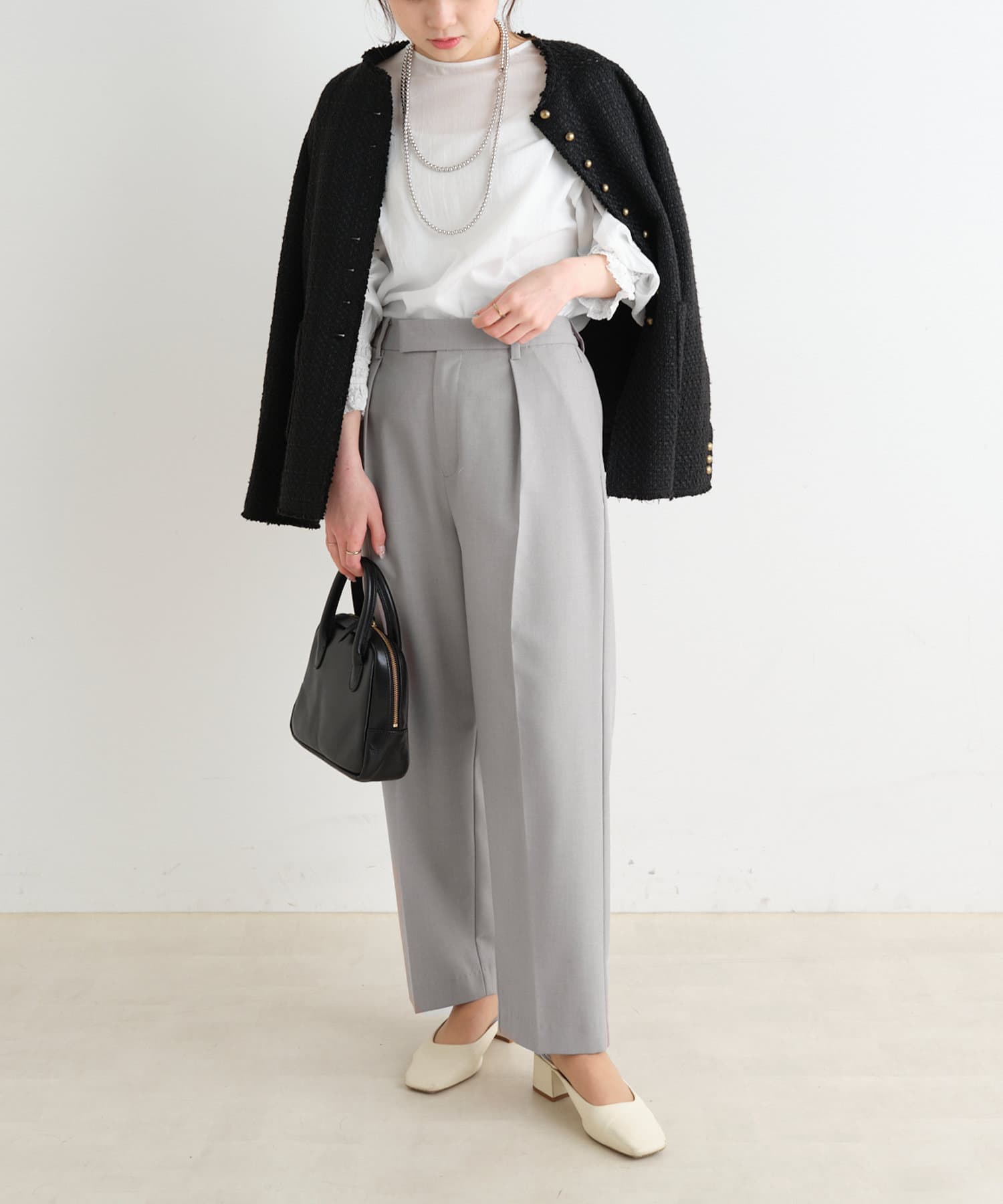 オフィススタイルやセレモニーにも着られる上品な生地感のスラックスパンツ。