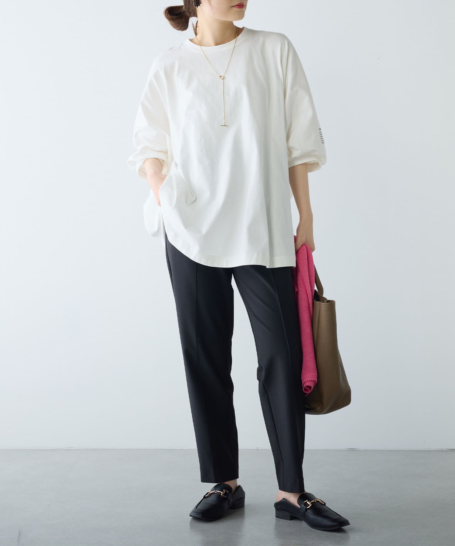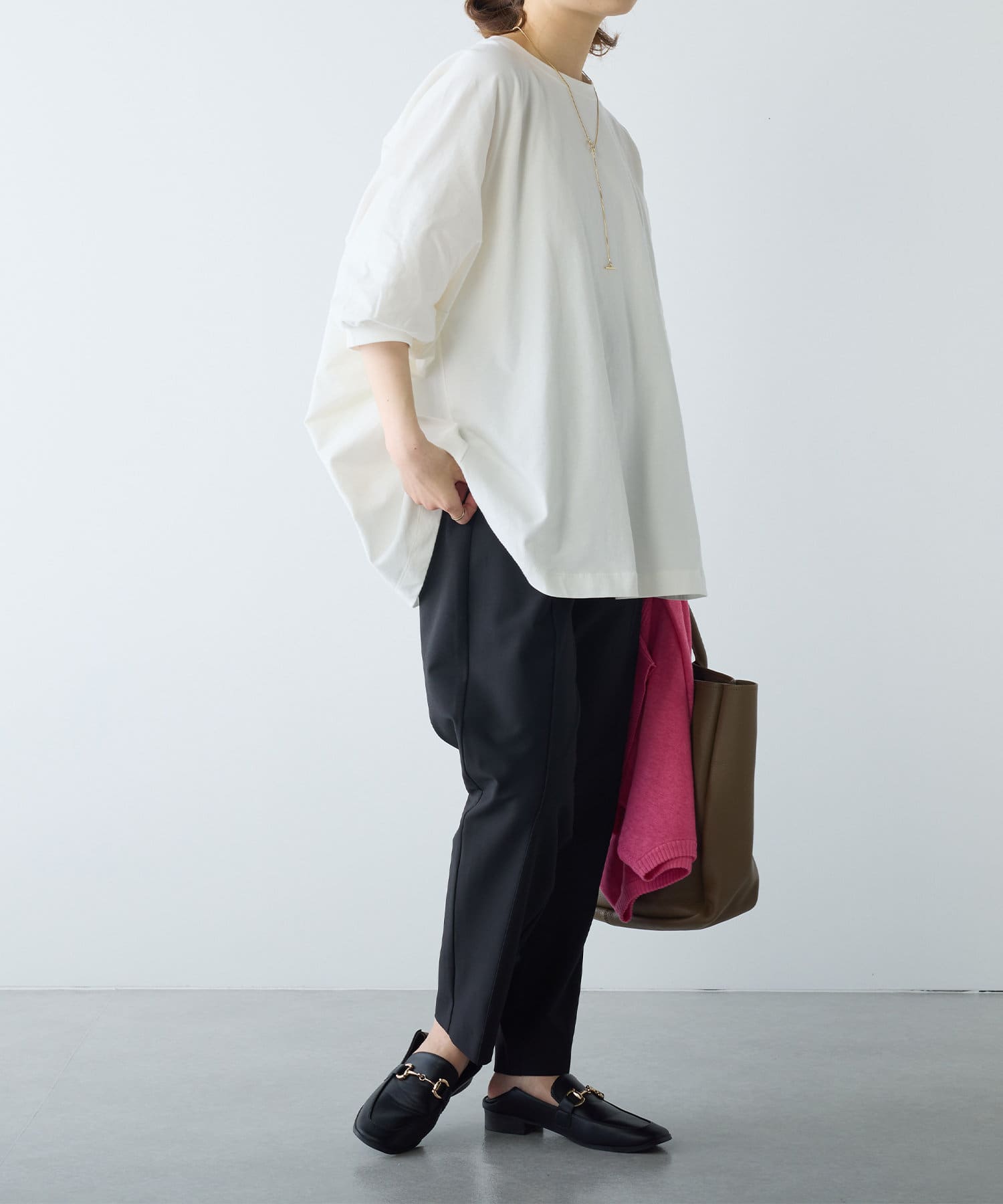 ニットやTシャツ、パーカーなどカジュアルなアイテムでも上品で大人っぽくまとまります。