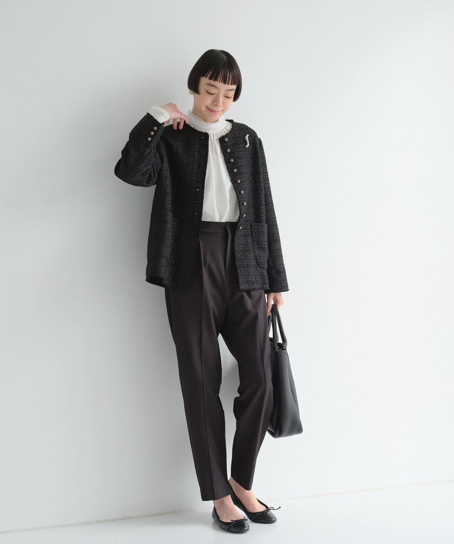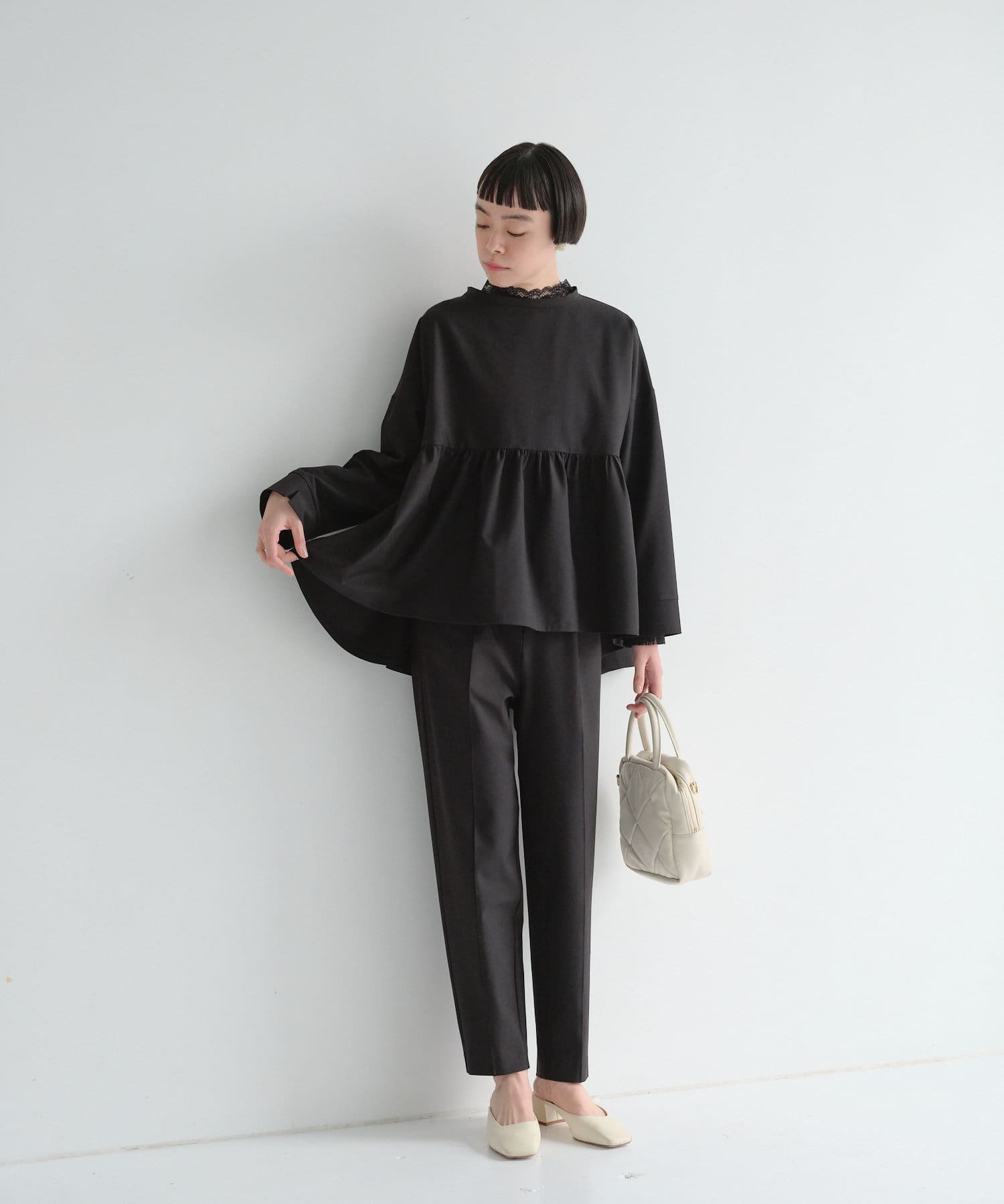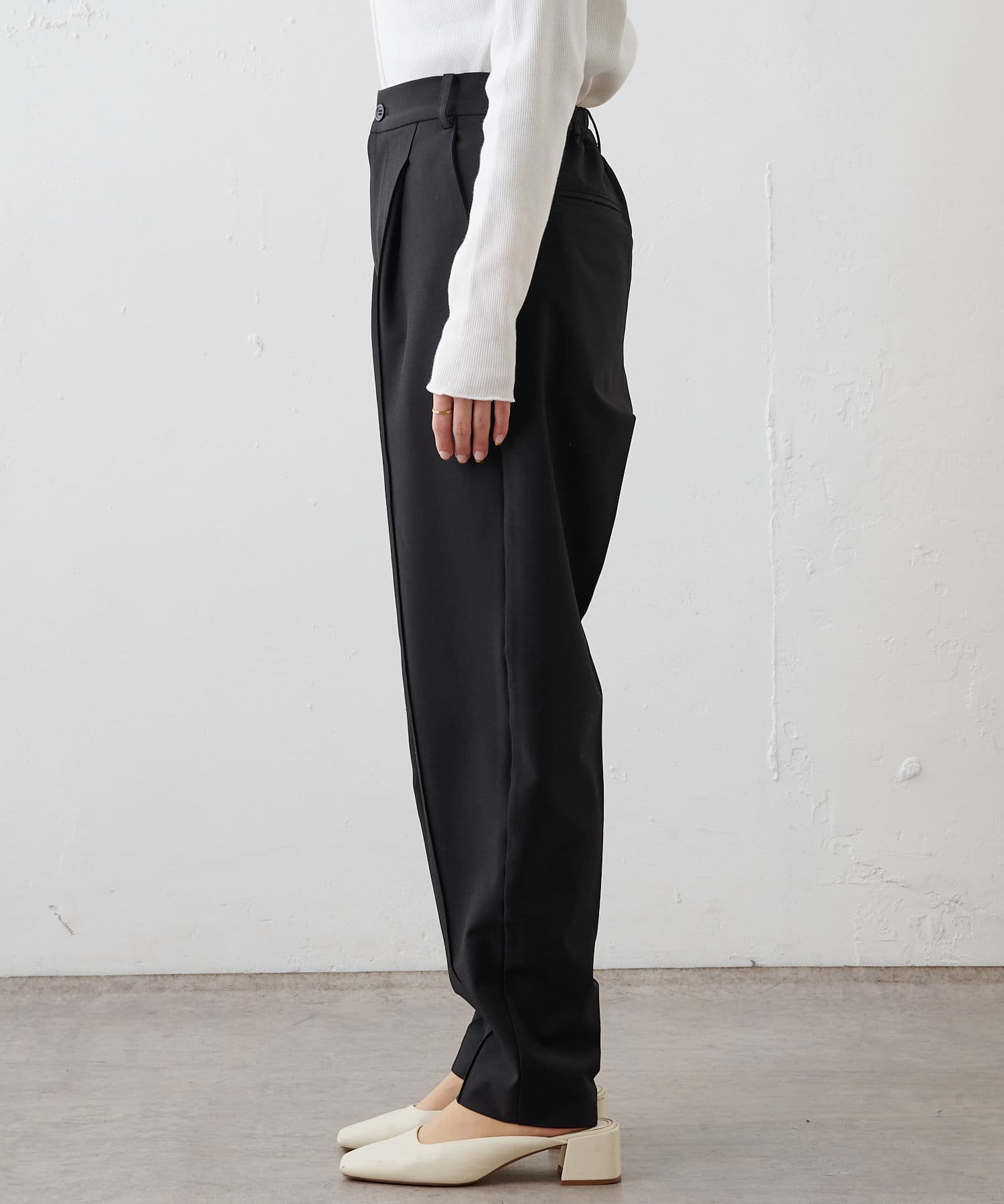 オケージョンにもお仕事着にもオススメのブラックです。セットアップでも単品でも使い回しがきくのでとても使い勝手がいいパンツです。