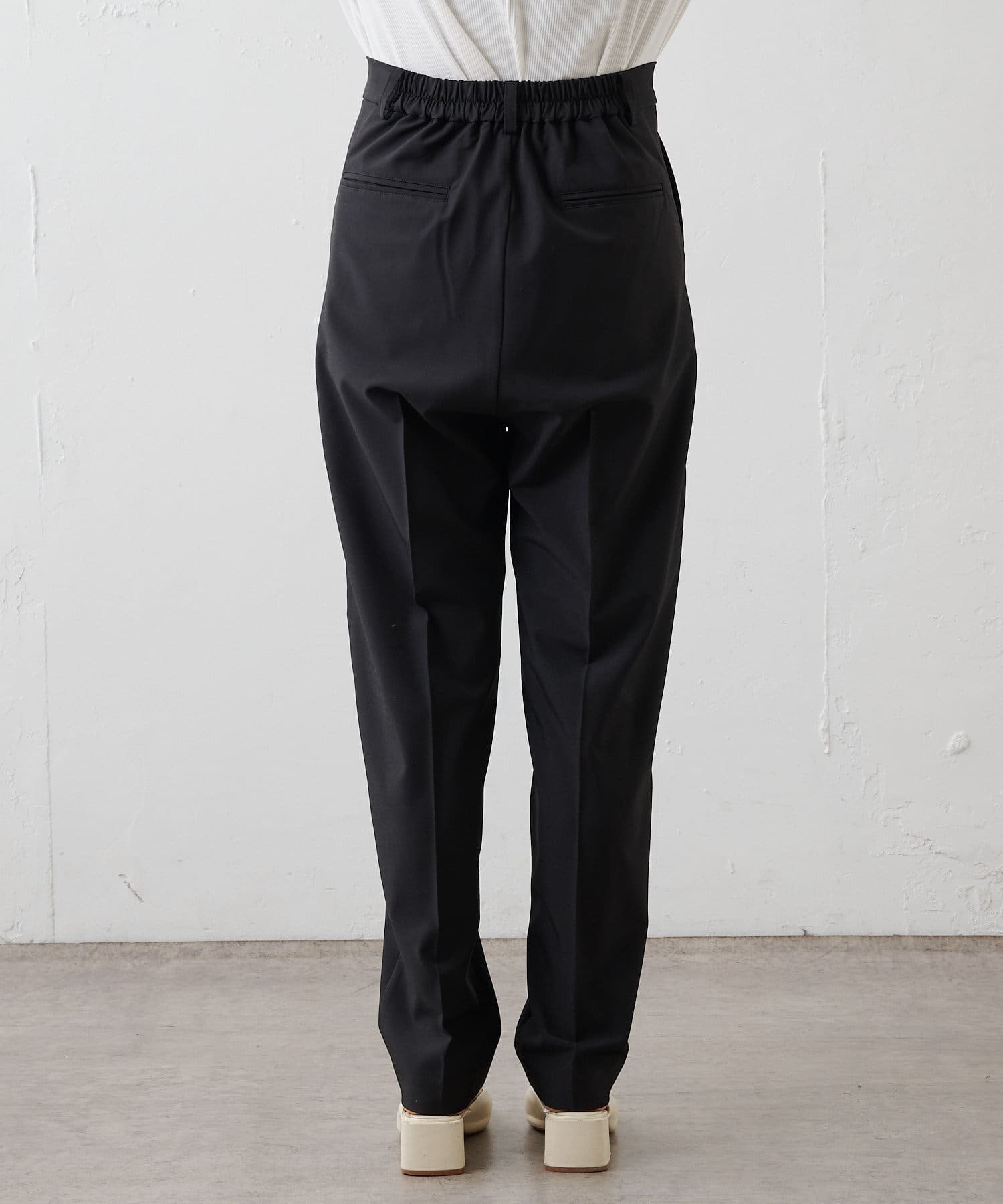 ウエストの後ろはゴム仕様で着脱しやすいだけでなく、締め付け感のないリラックスした穿き心地を実現。