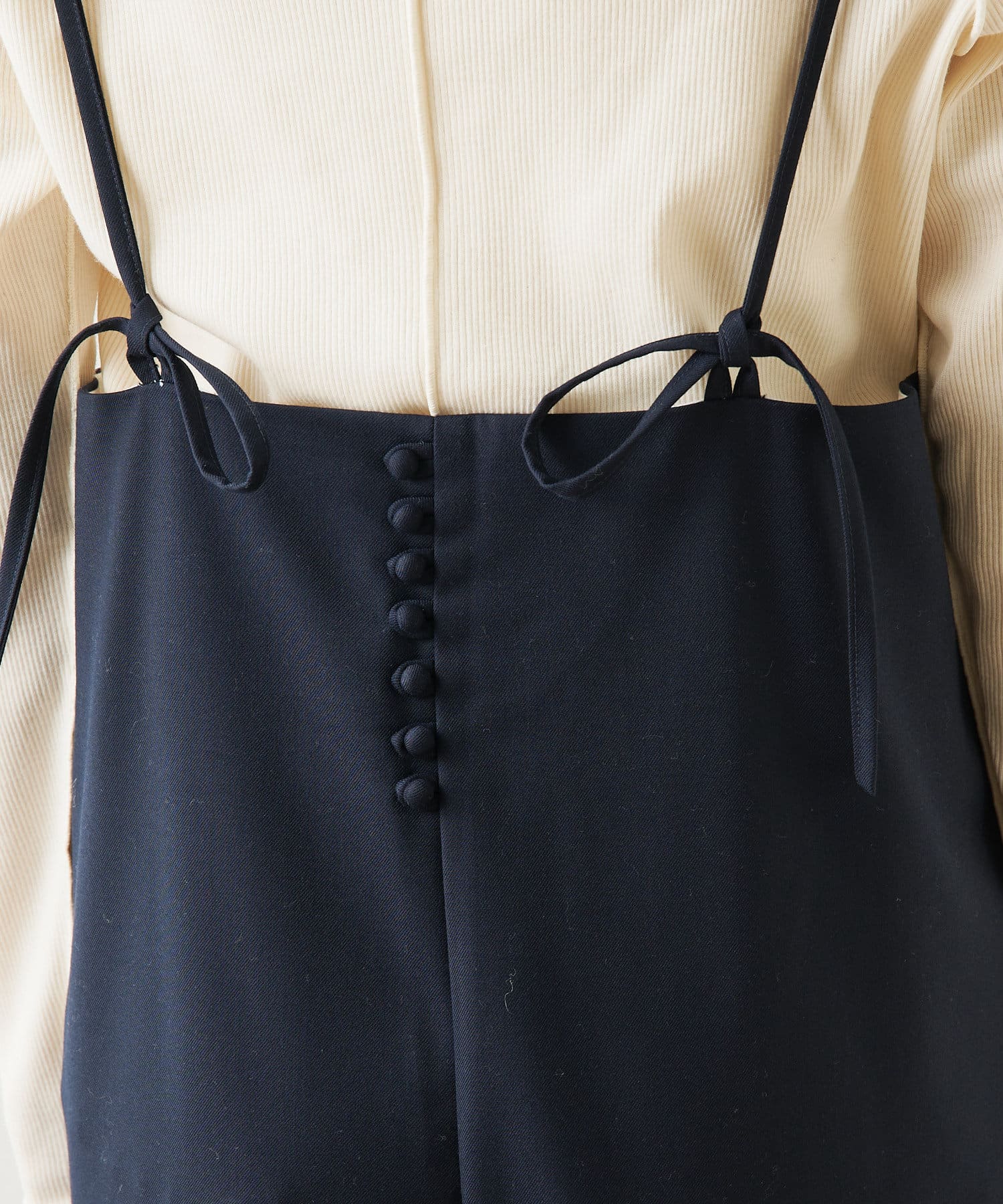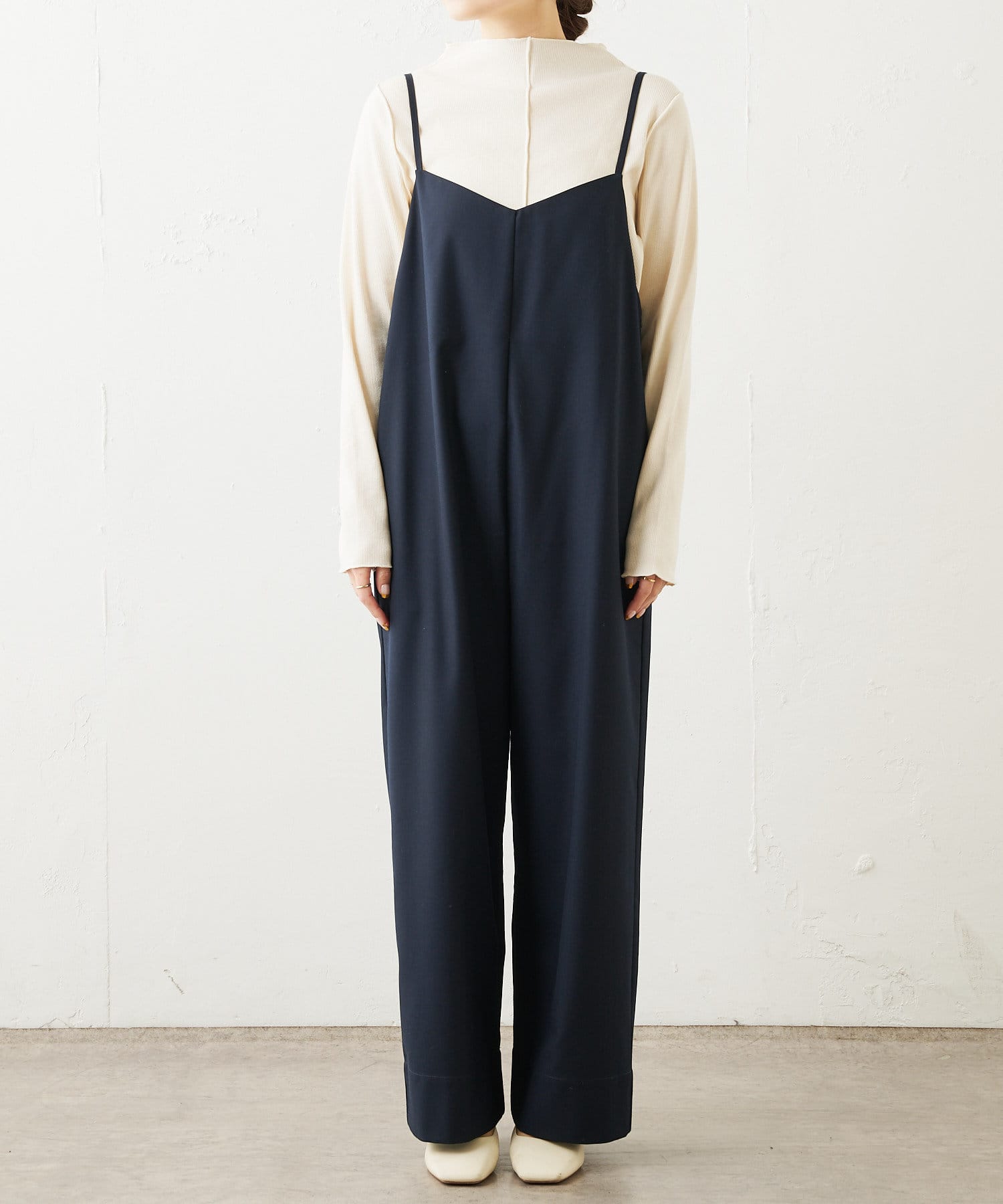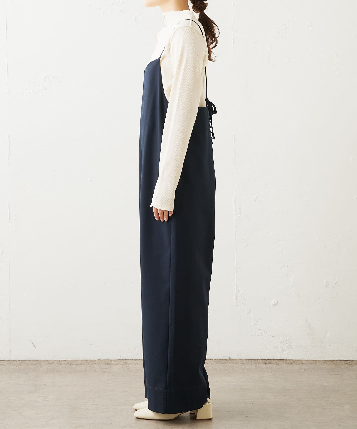 シンプルなデザインとワイドすぎない程よいシルエットで上品に着ていただけるサロペット。