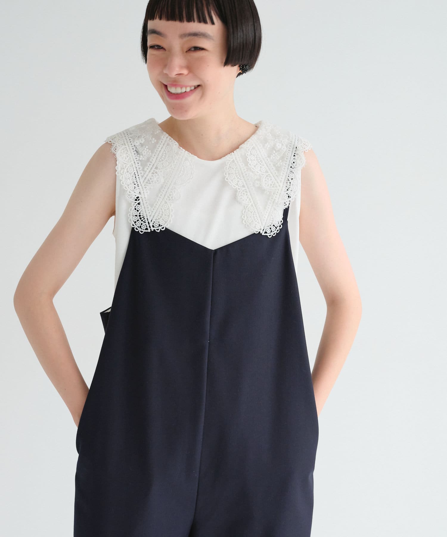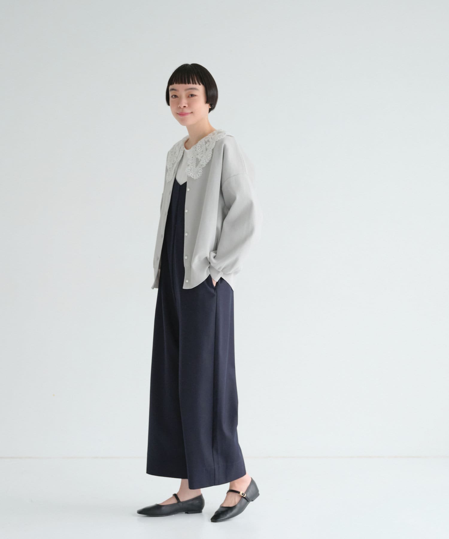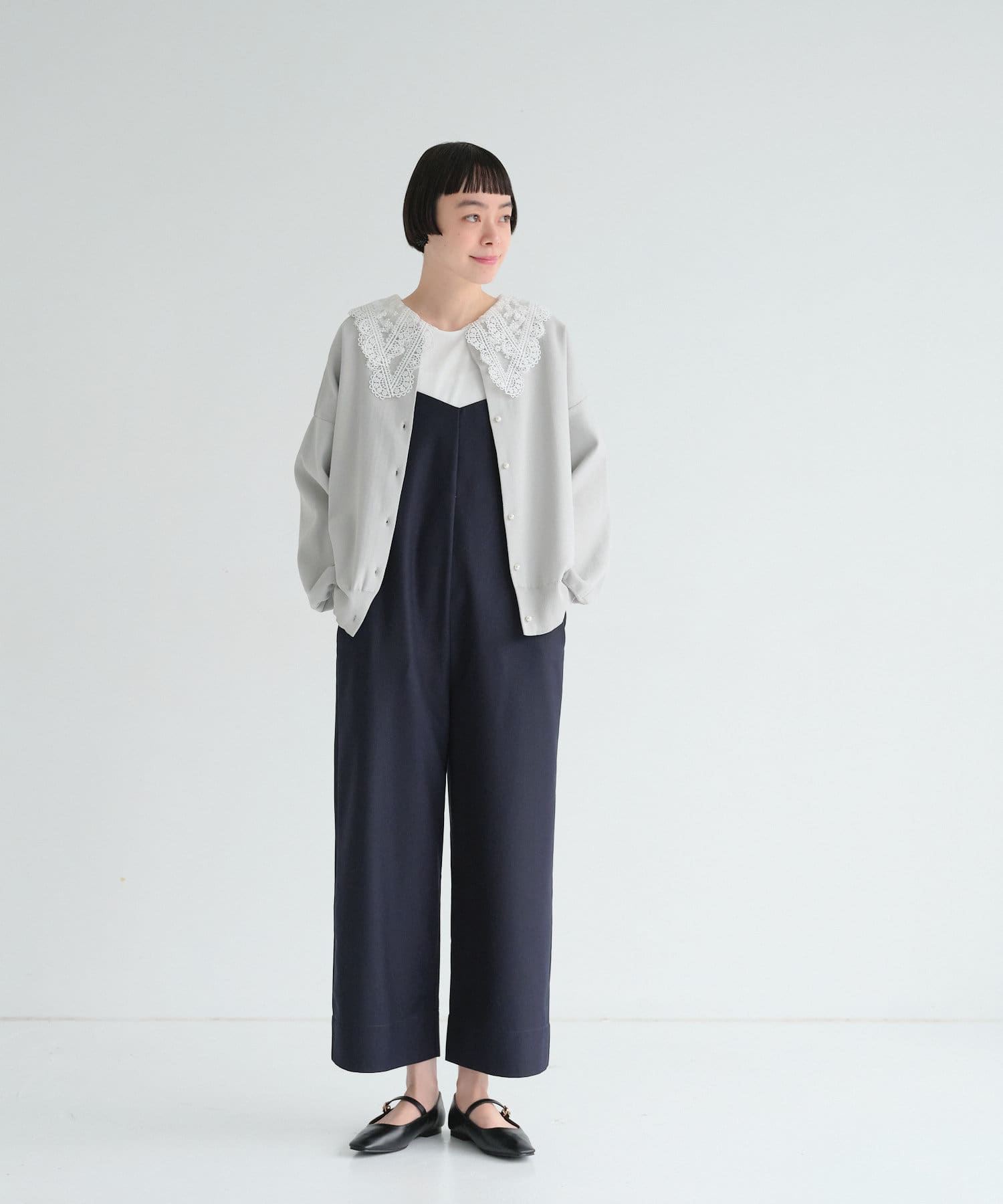 シンプルなデザインとワイドすぎない程よいシルエットで上品に着ていただけるサロペット。