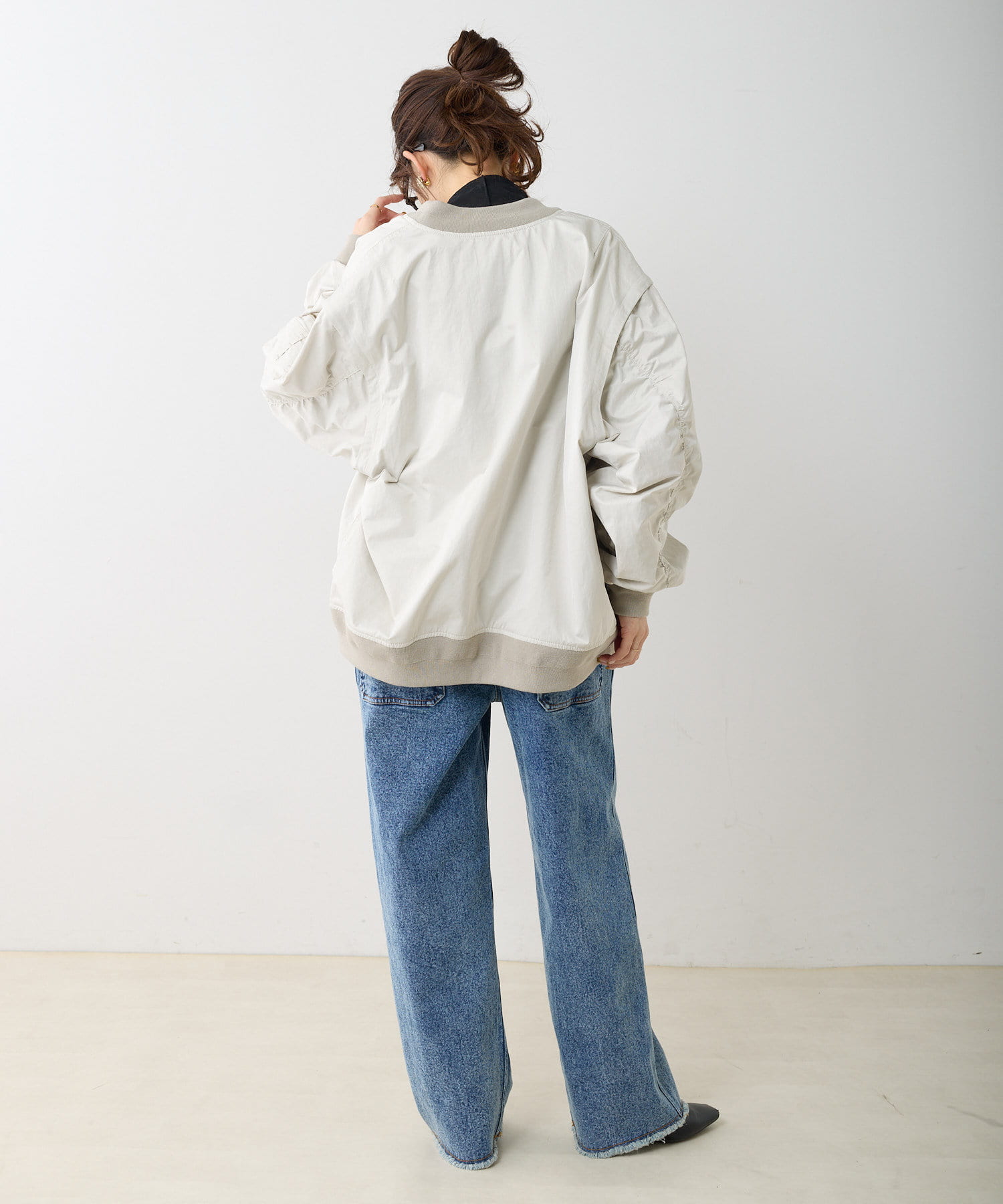 身幅にゆとりがあるので、中にスウェットやタートルネックをインできるのも嬉しいポイント。