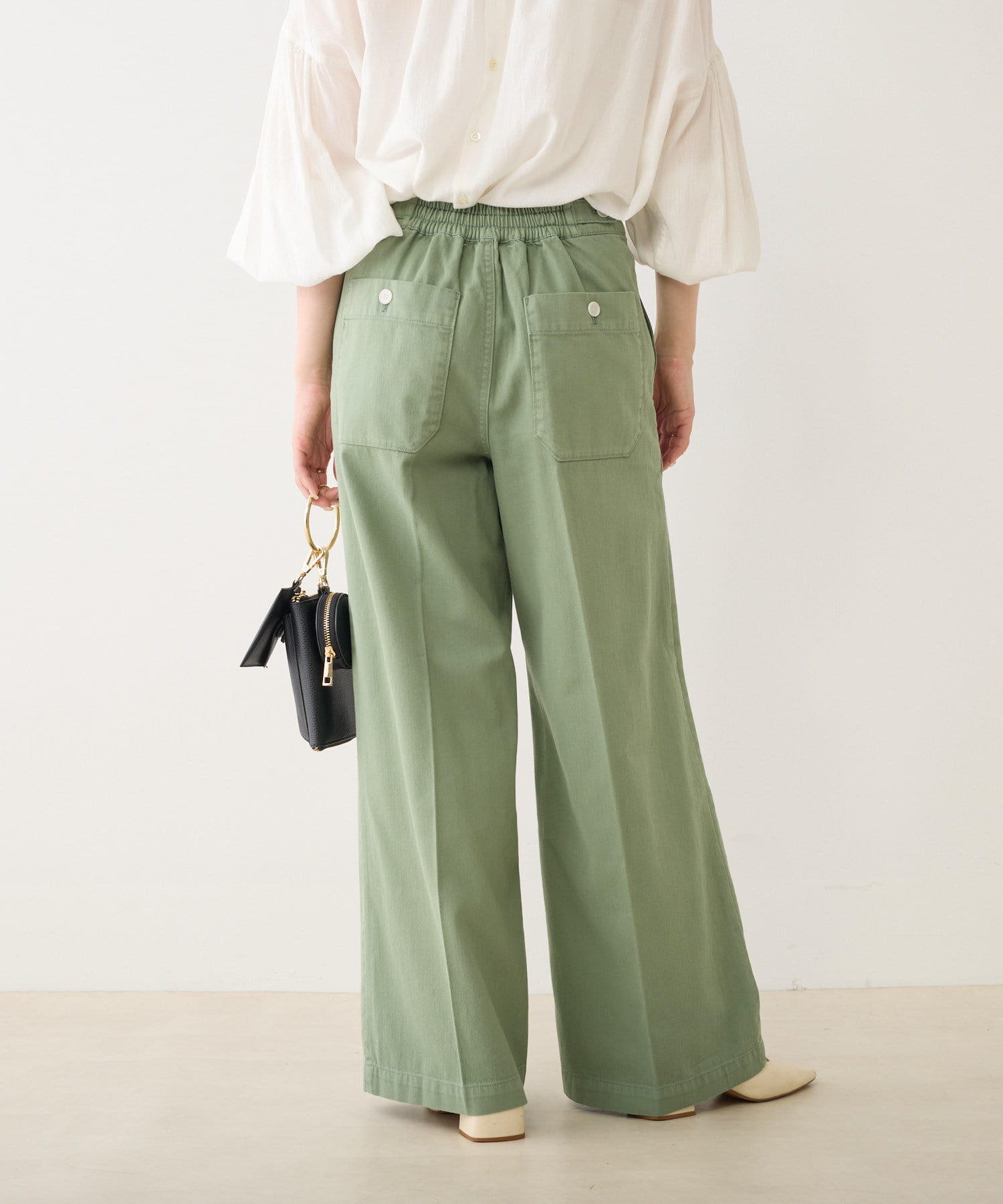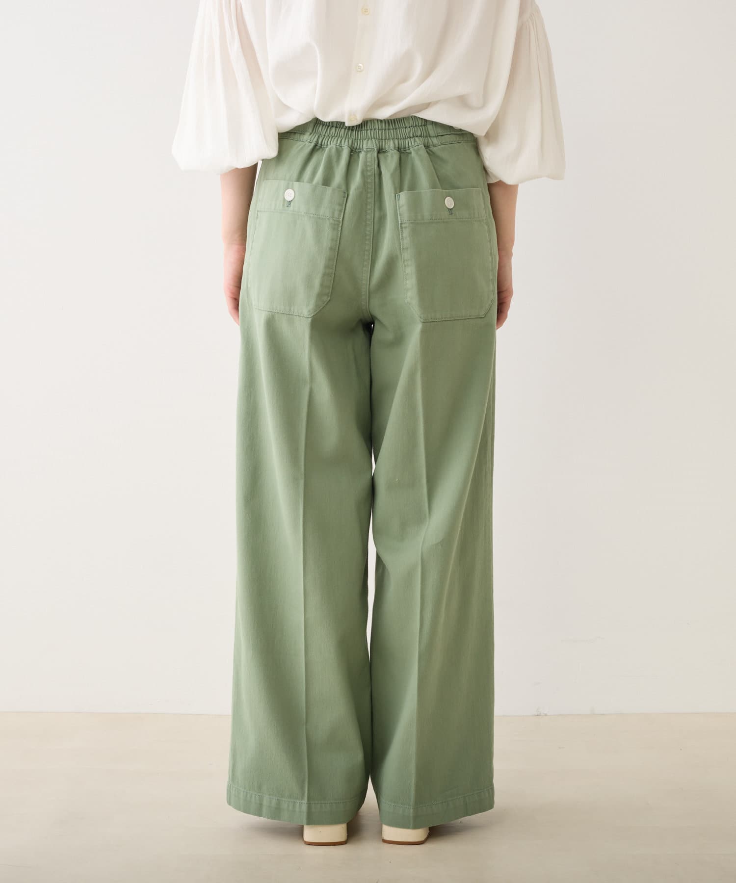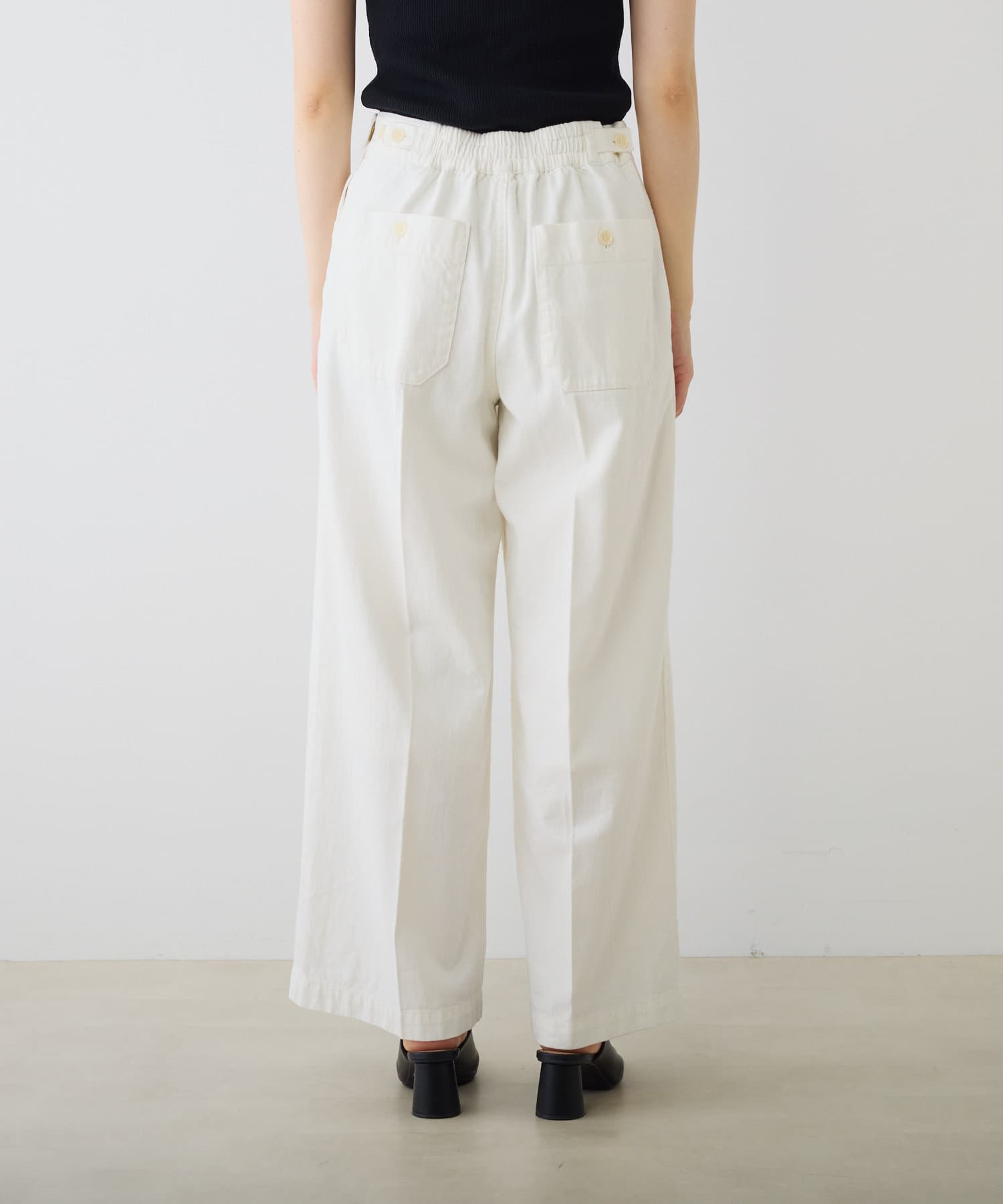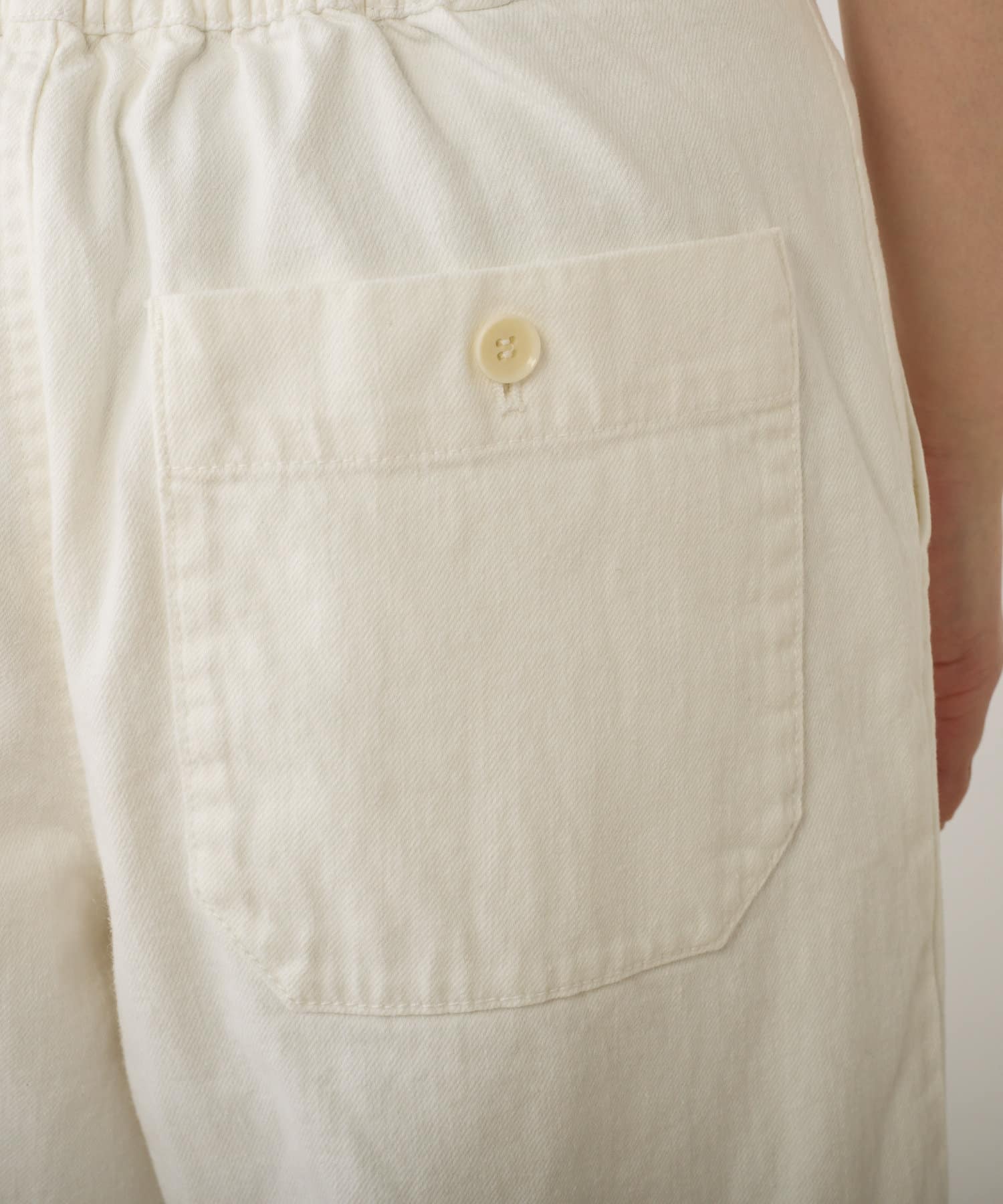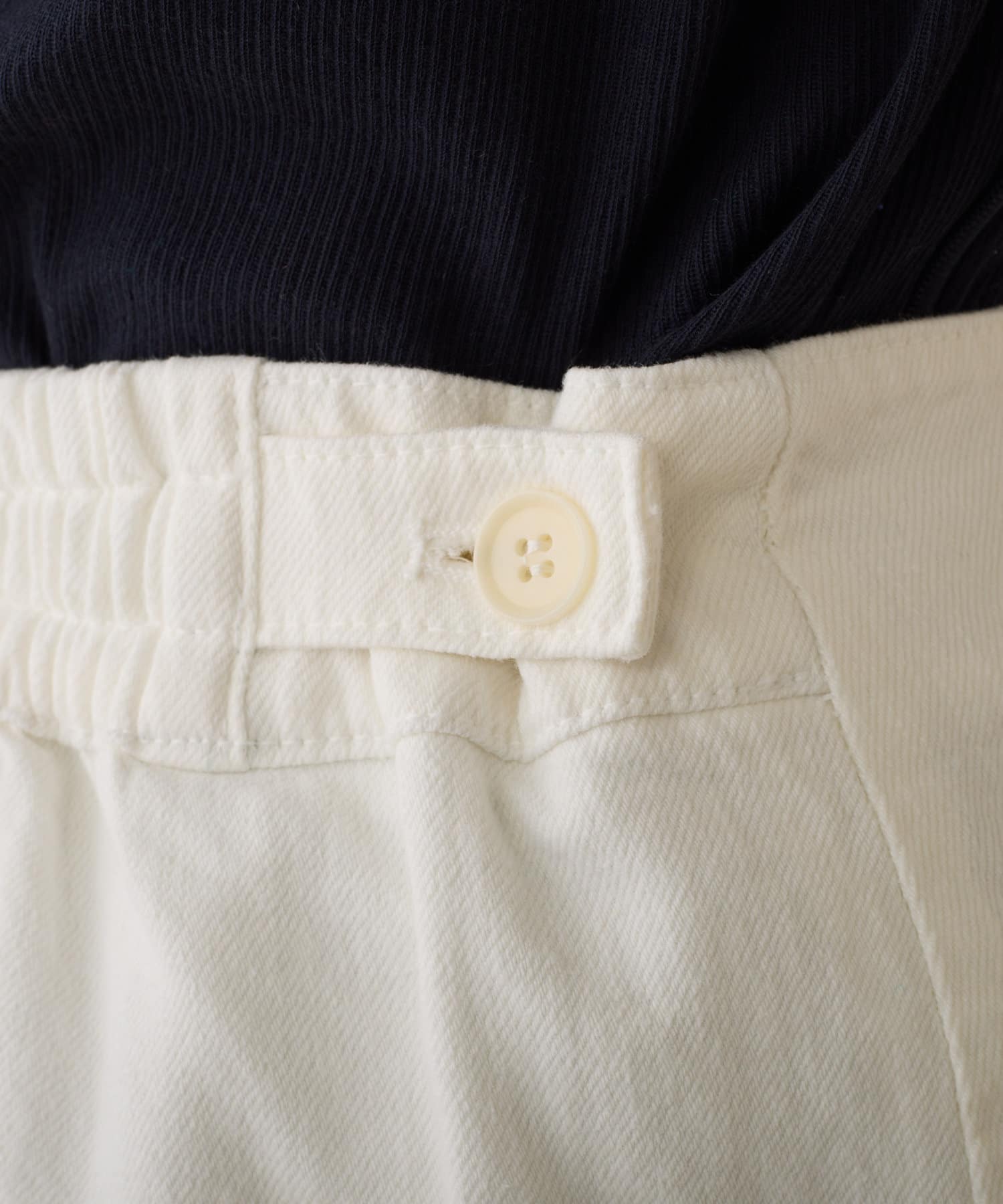 バックウエストはストレスフリーのゴム仕様。さらにサイドにボタンを配し、ウエスト調節が可能です。