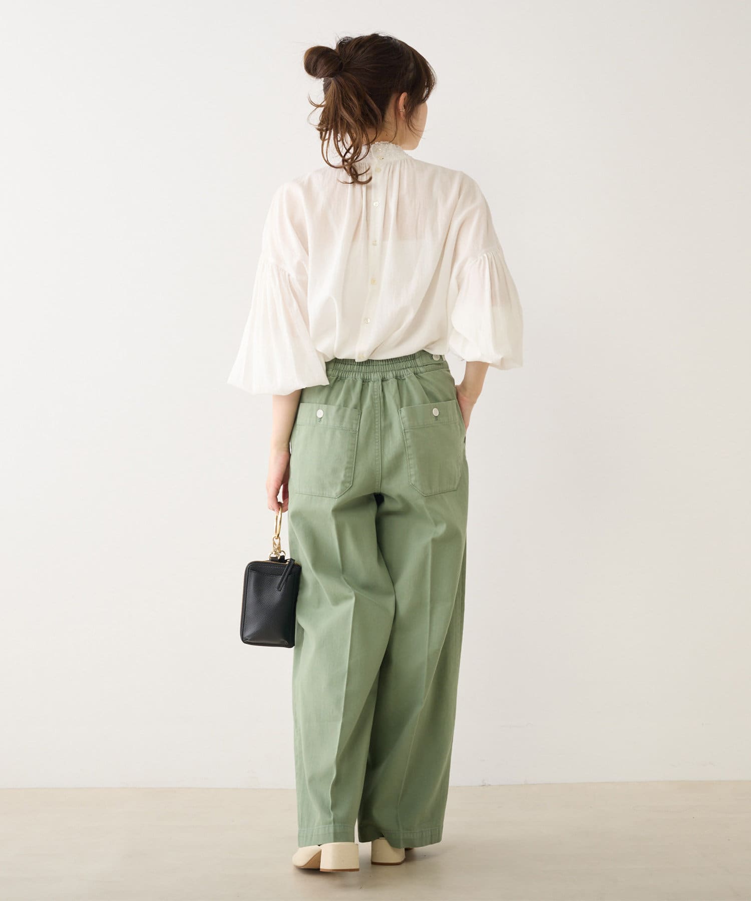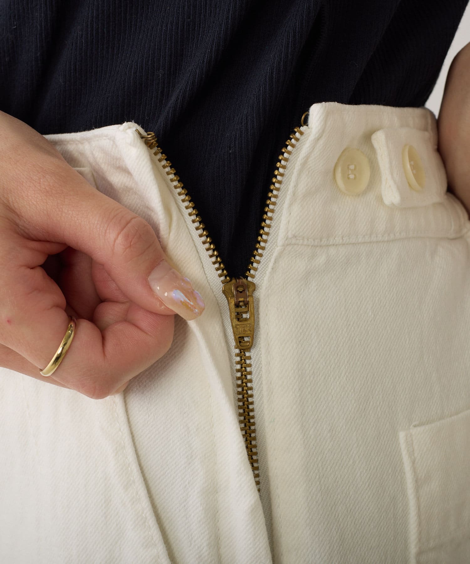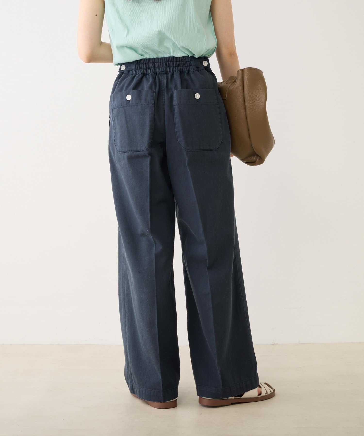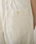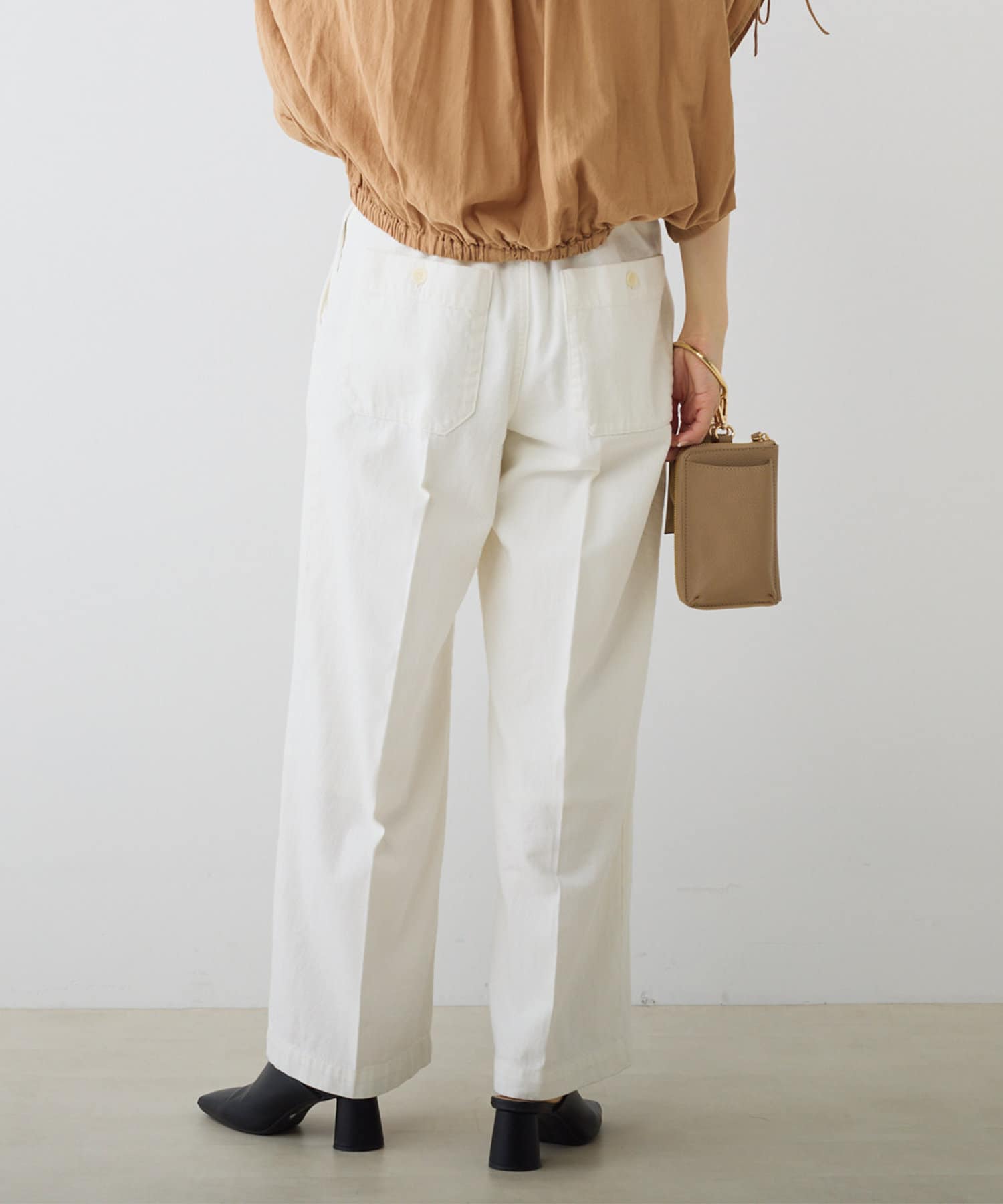 バックウエストはストレスフリーのゴム仕様。さらにサイドにボタンを配し、ウエスト調節が可能です。