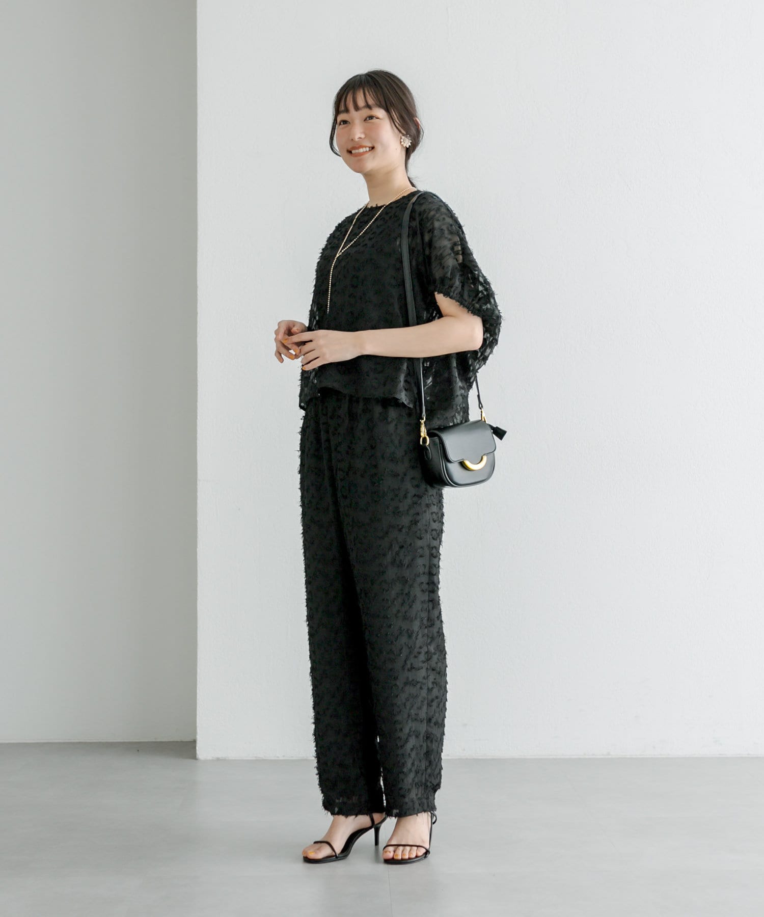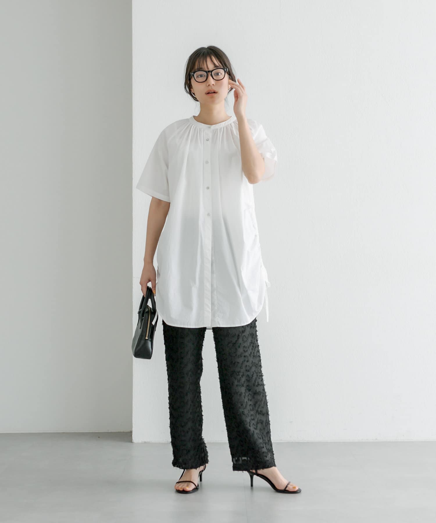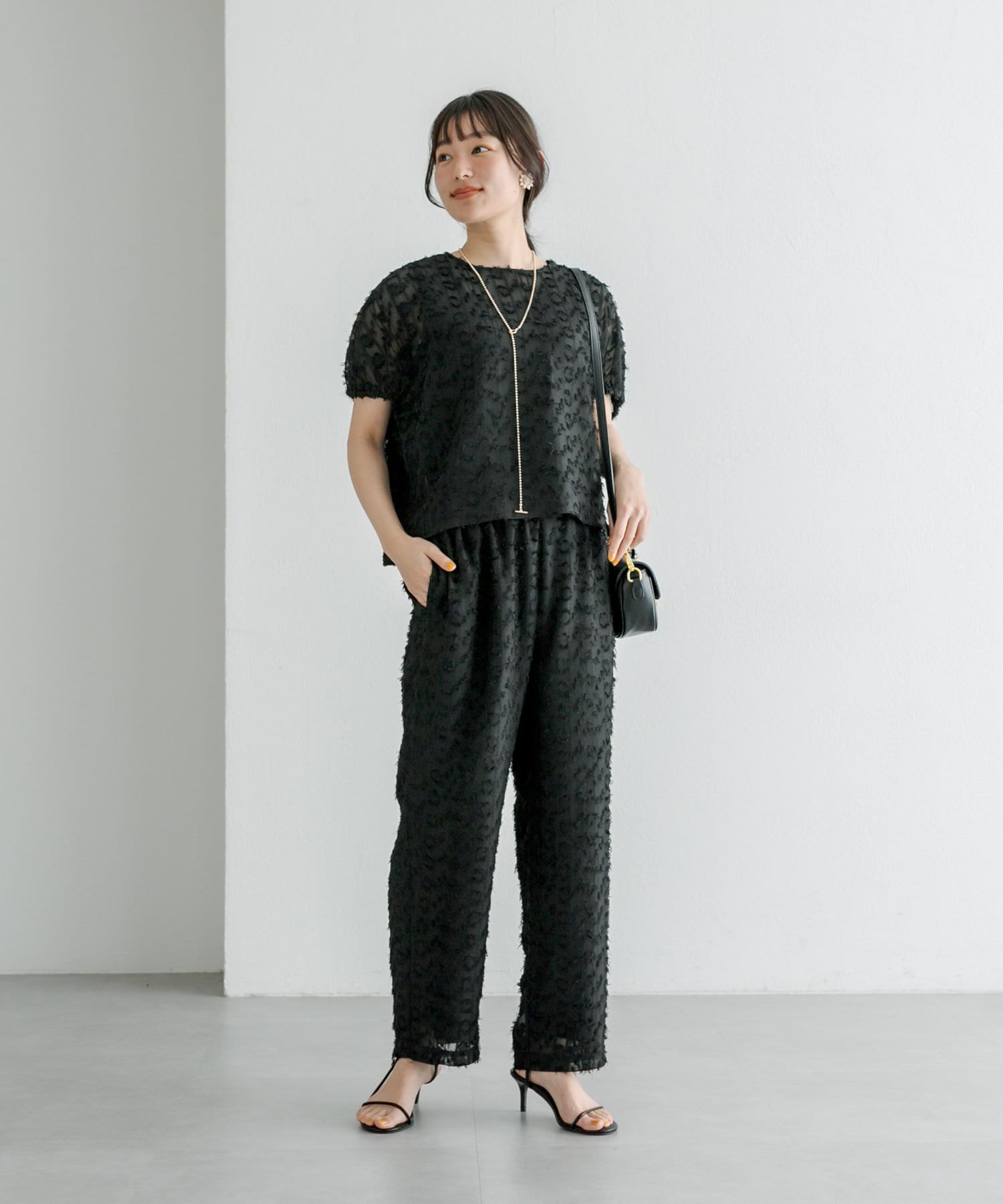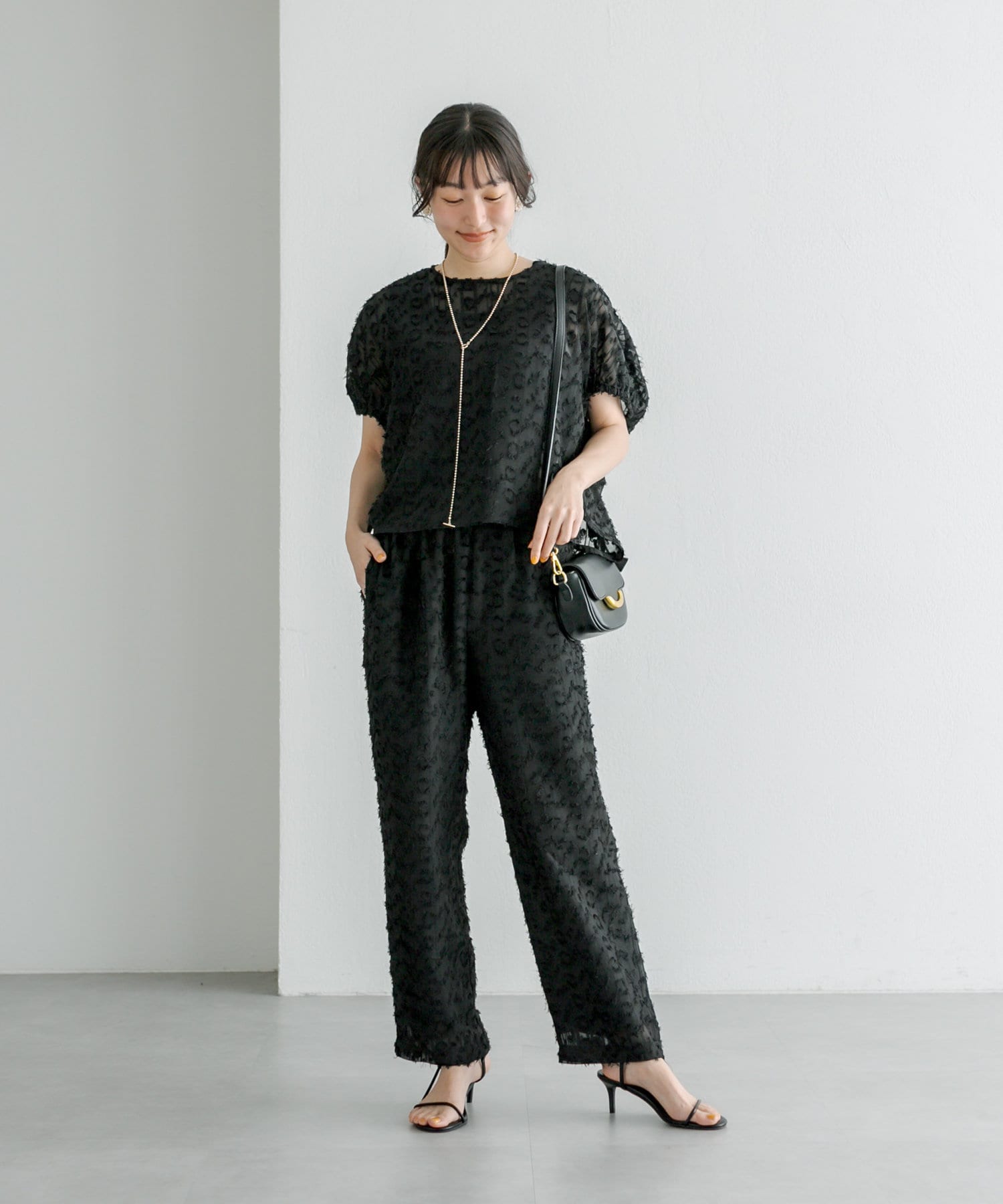 同生地のブラウスと合わせて、セットアップとして着用してもオシャレです。