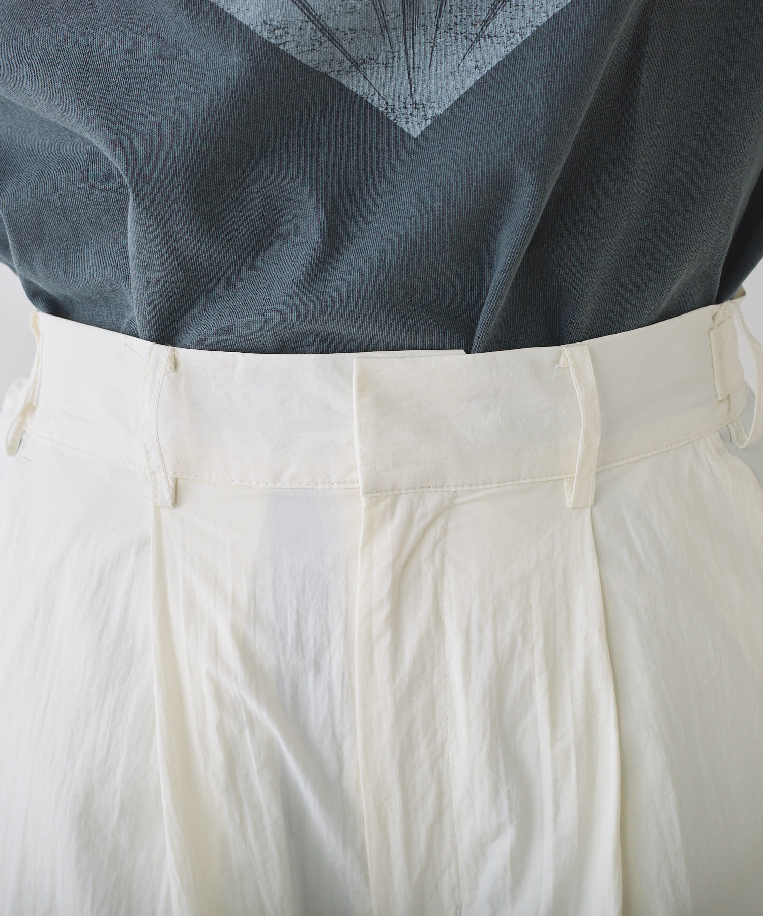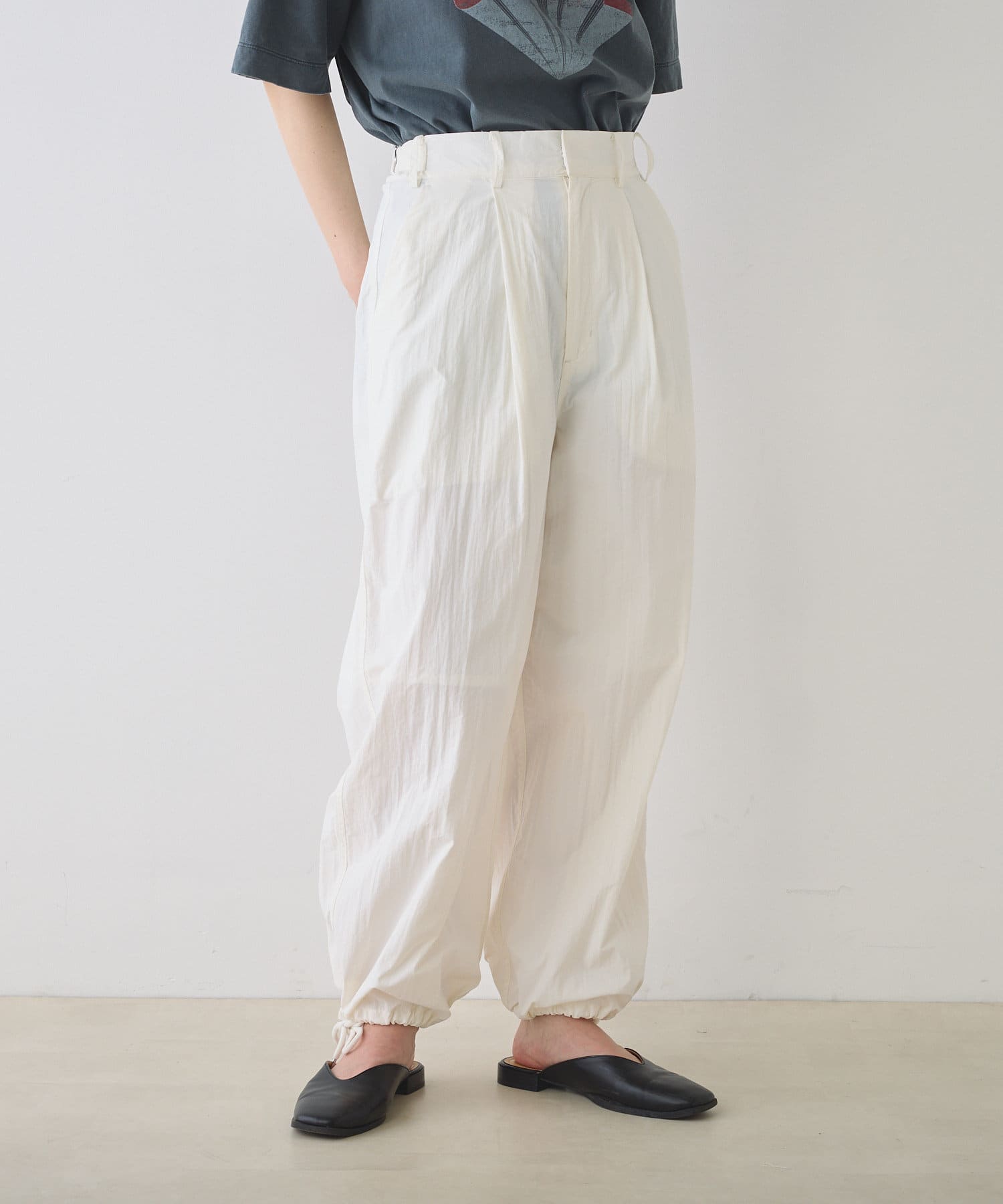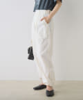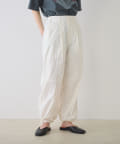 フロントにタックを入れることで太もも周りにゆとりが生まれ、脚のラインを拾わないのが嬉しいポイント◎