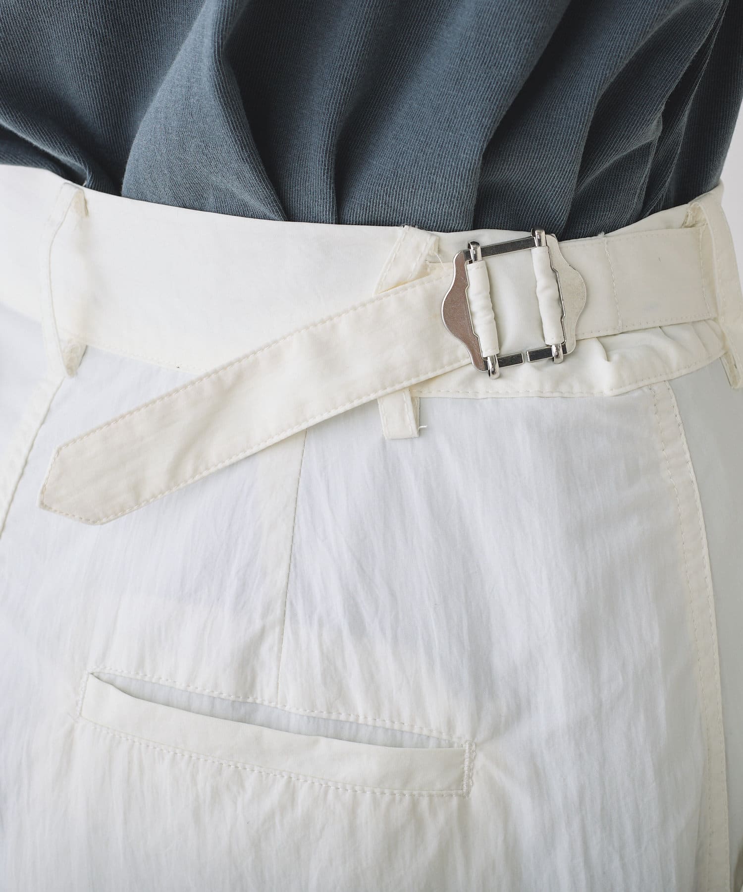 ウエストの両サイドにはベルトを配し、多少のサイズ調整が可能に。