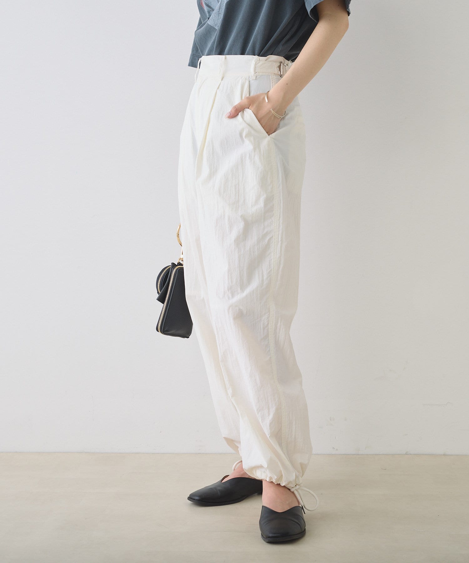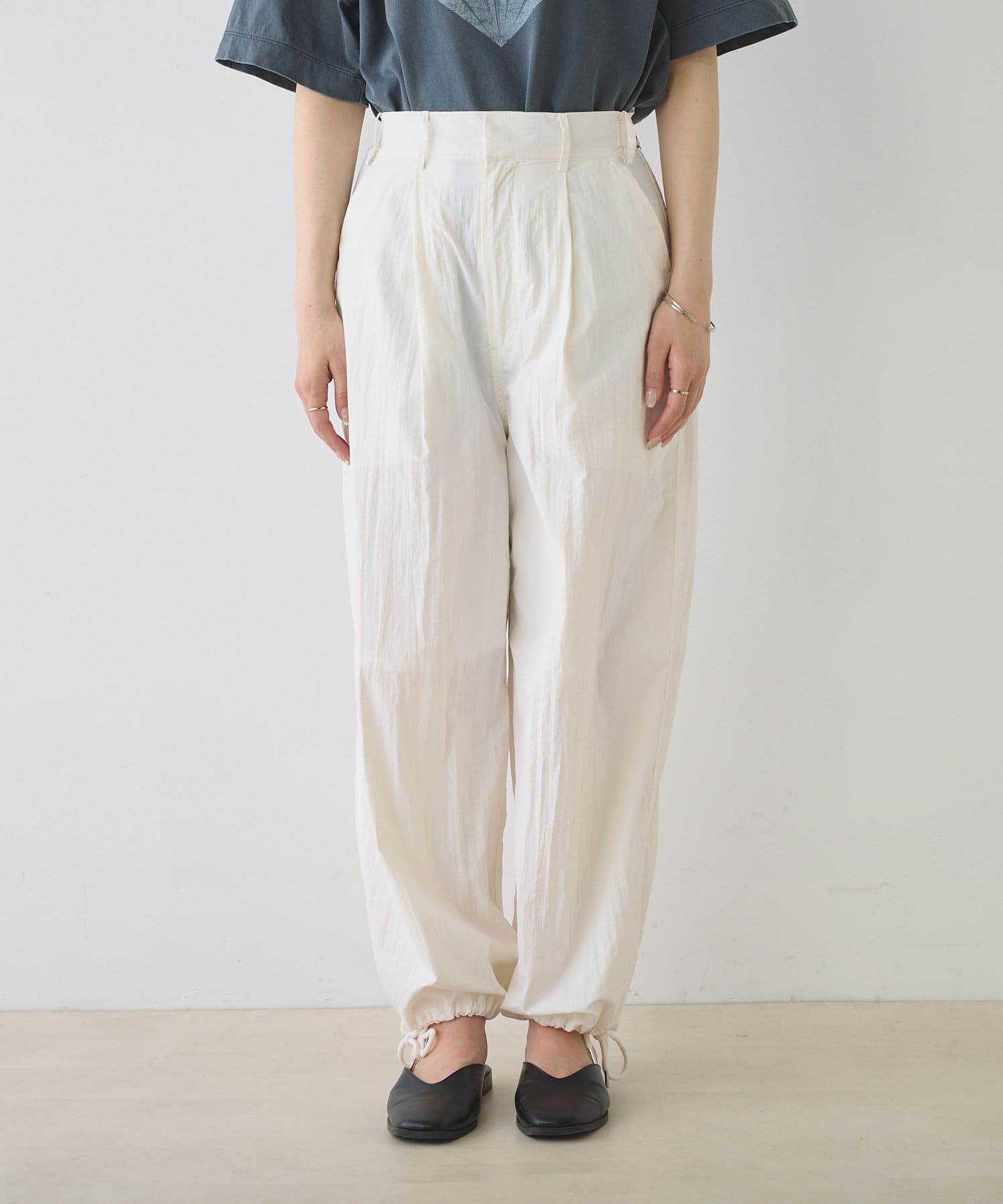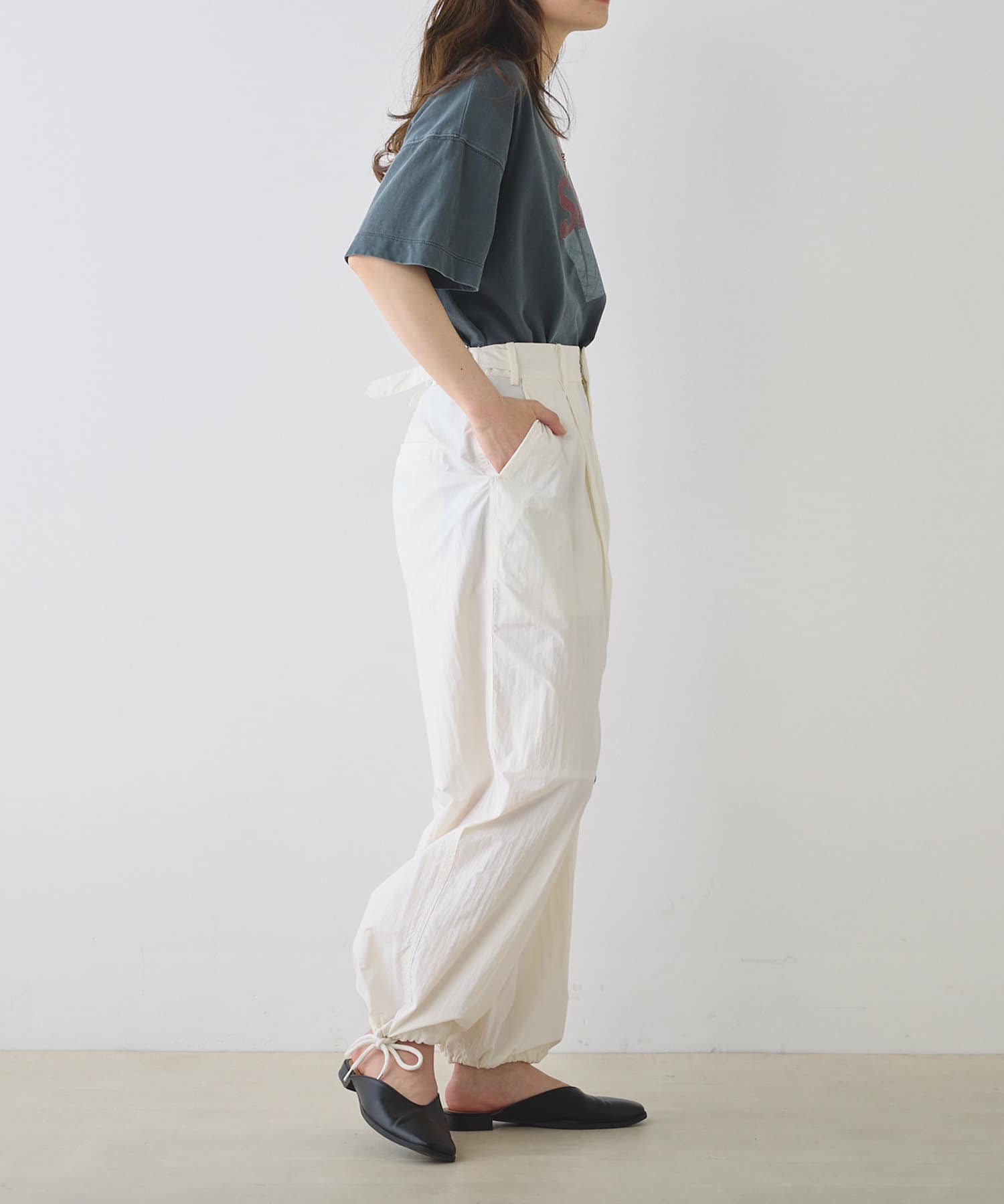 シャリ感のある薄手のナイロン生地で軽やかな穿き心地を叶えるパラシュートパンツ。