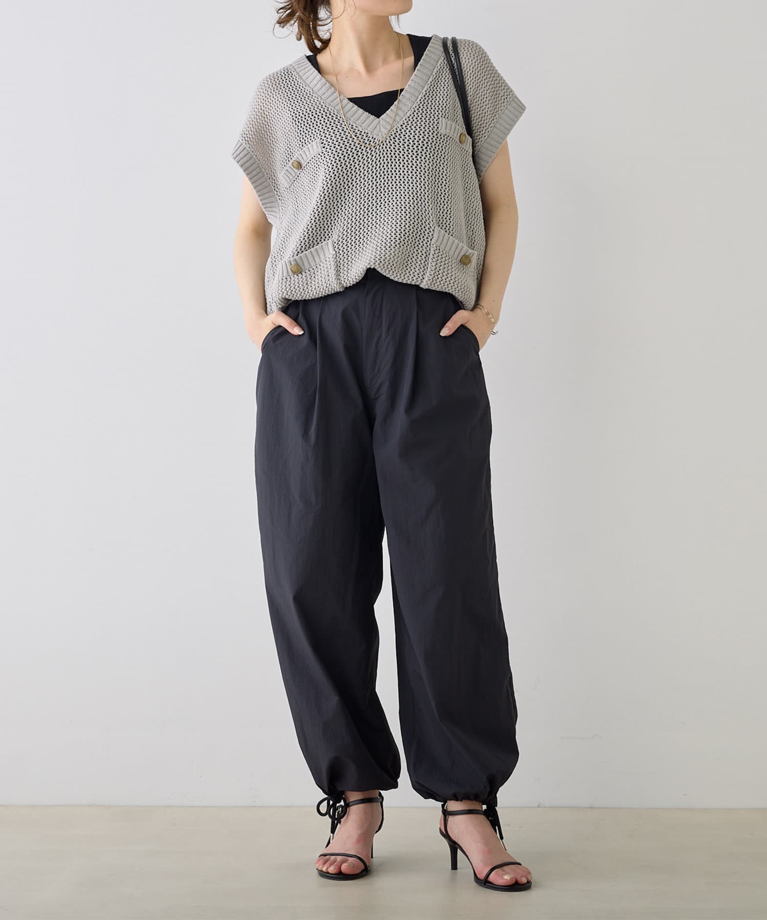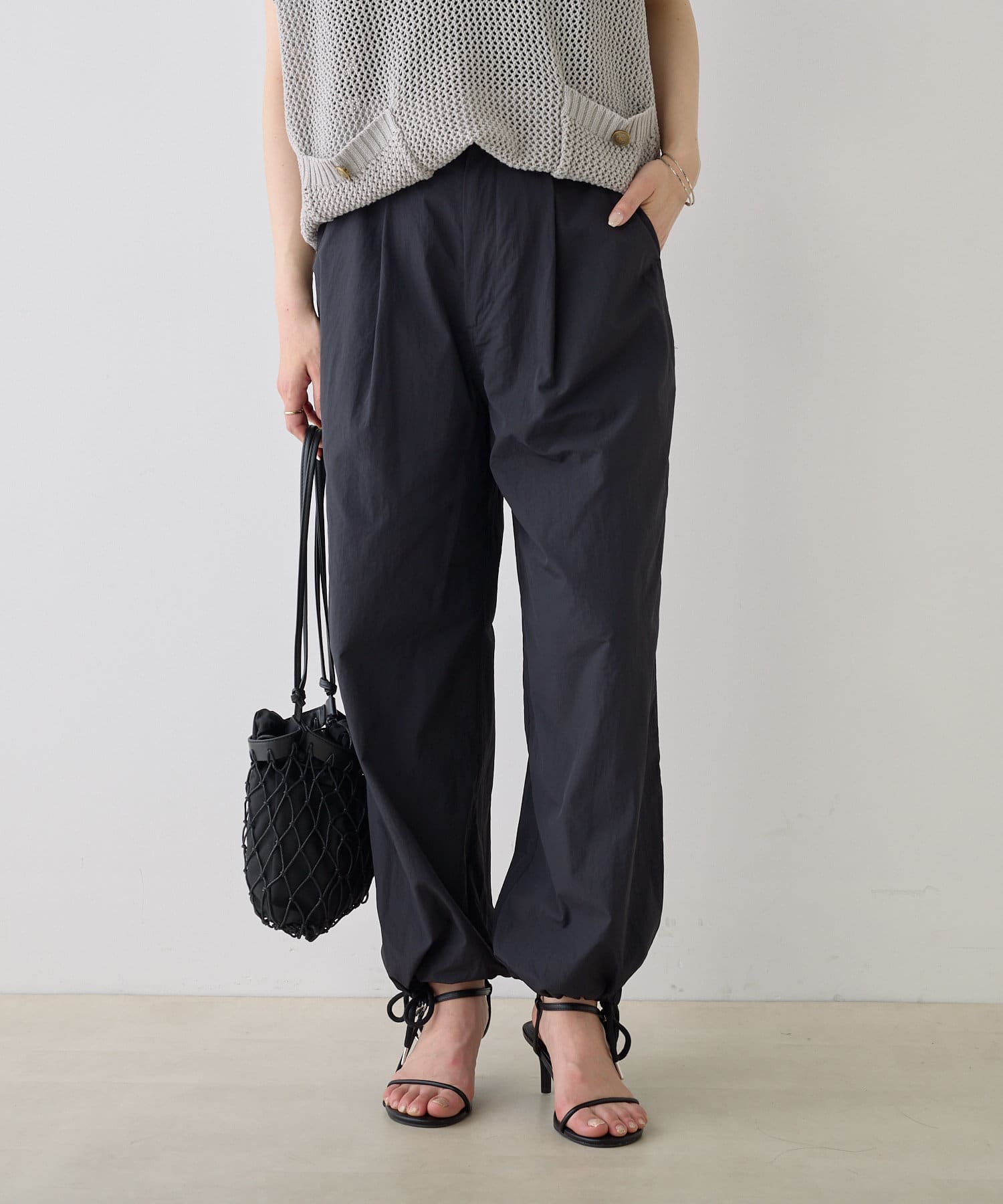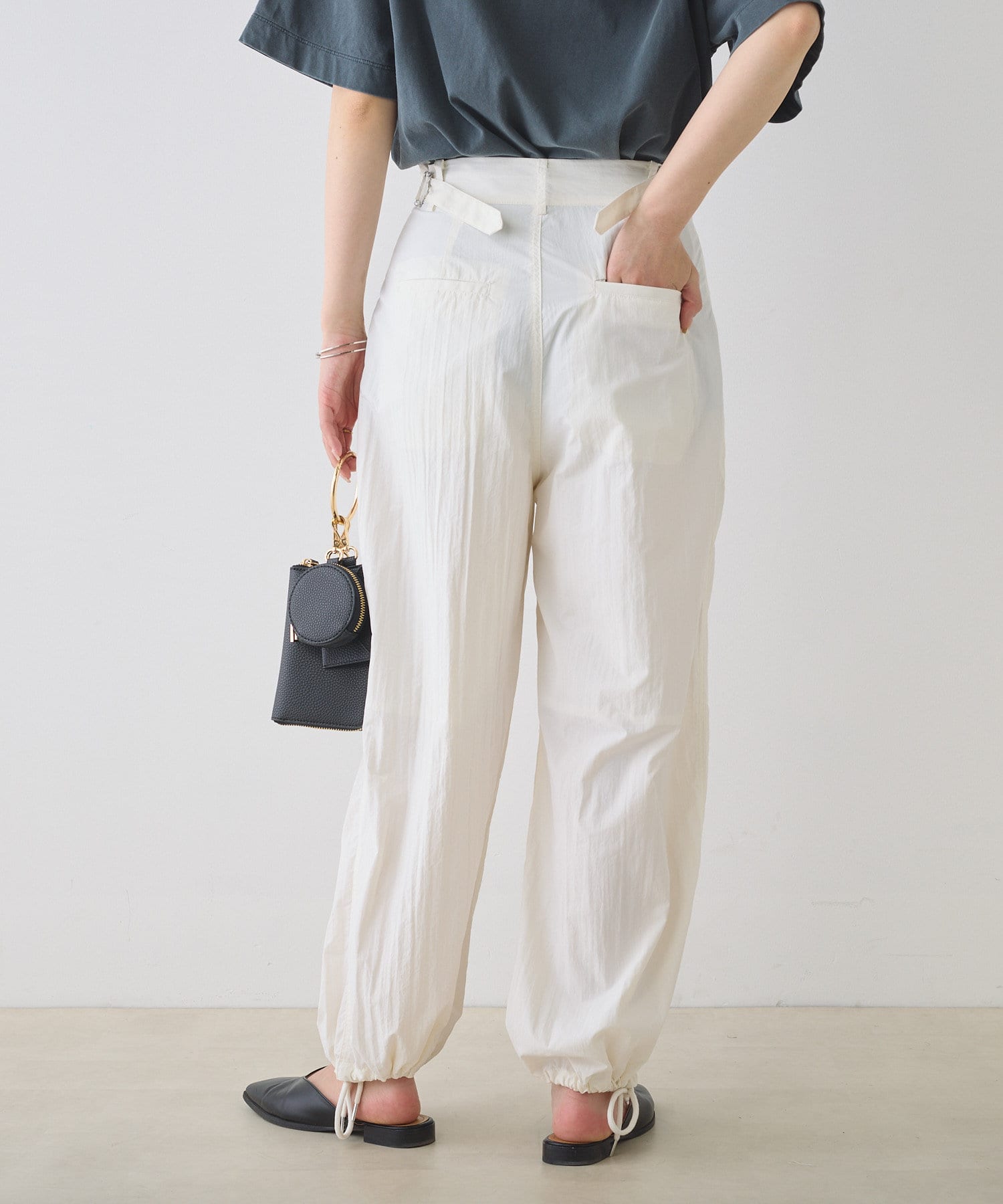 シャリ感のある薄手のナイロン生地で軽やかな穿き心地を叶えるパラシュートパンツ。
