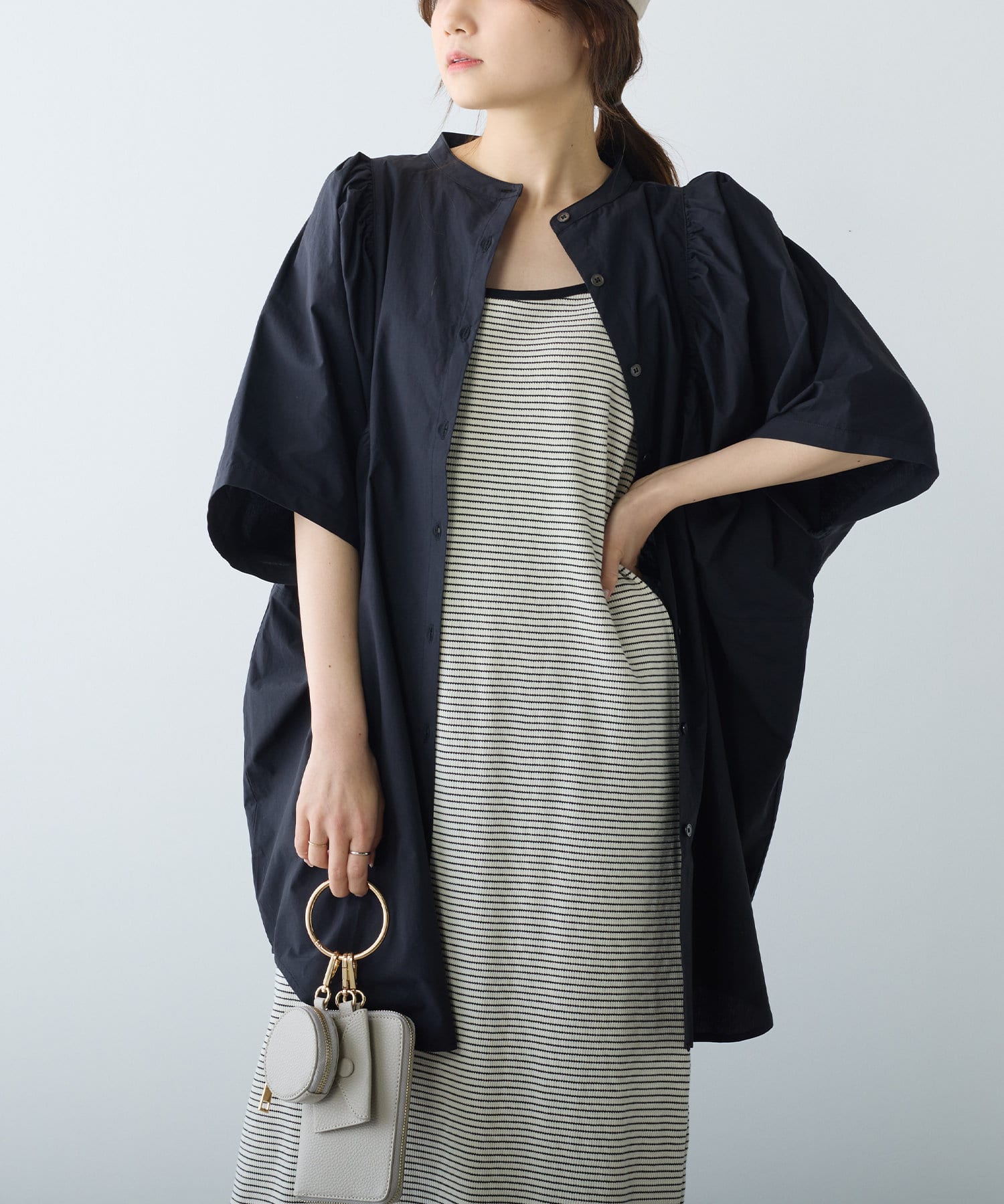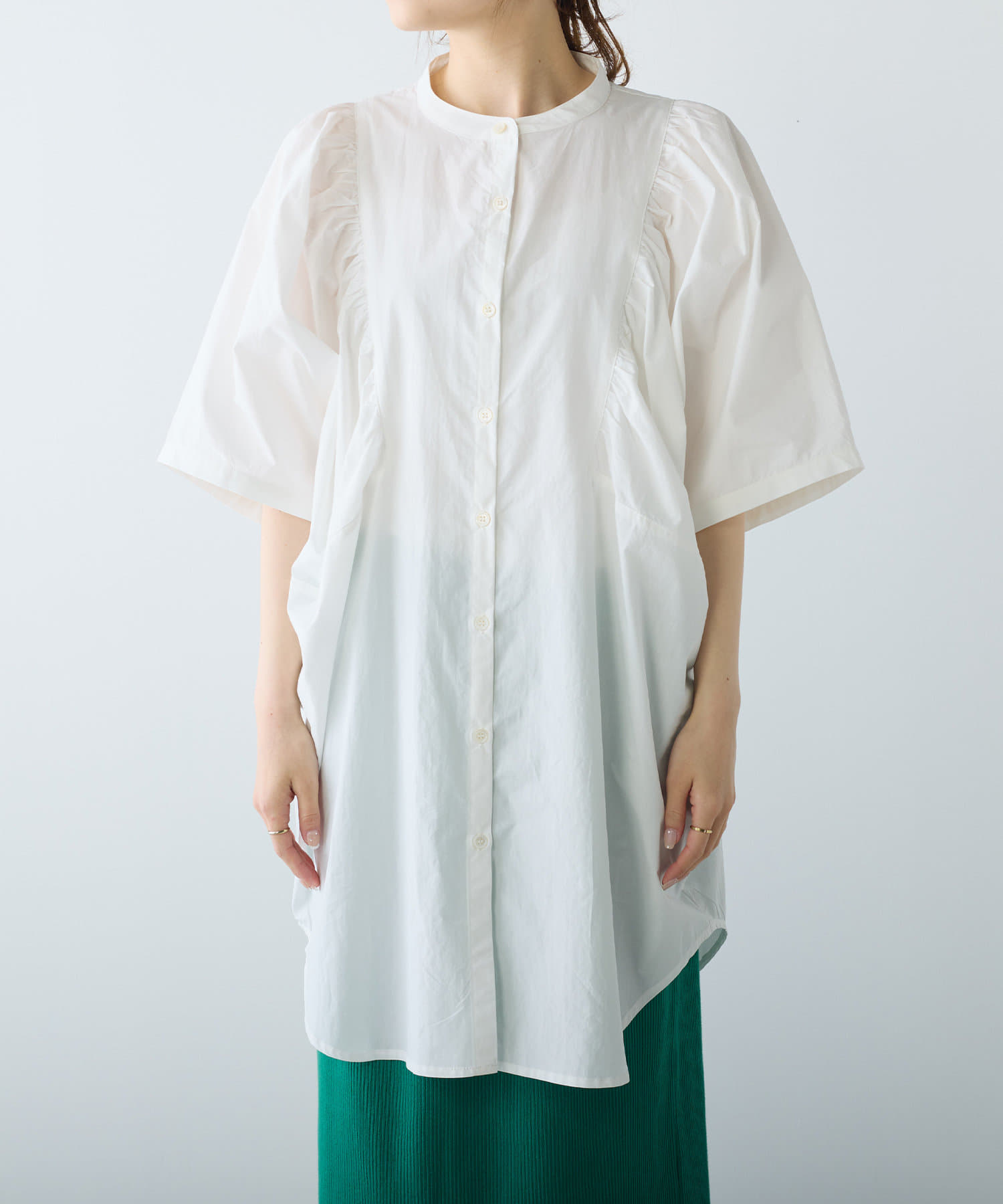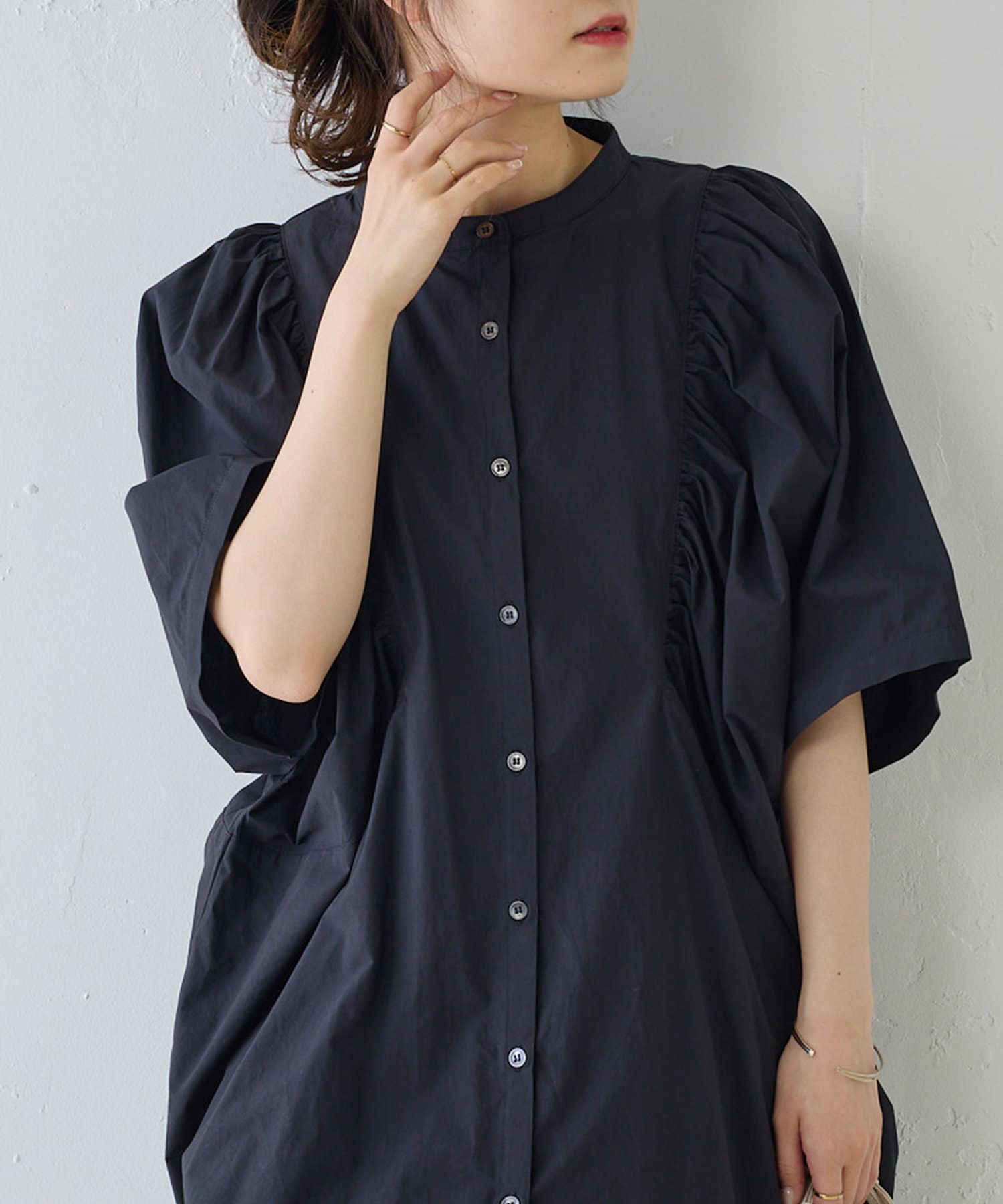 フロントデザインは、バンドカラーに均一に並んだボタンがパリッと清潔感のある雰囲気を演出。