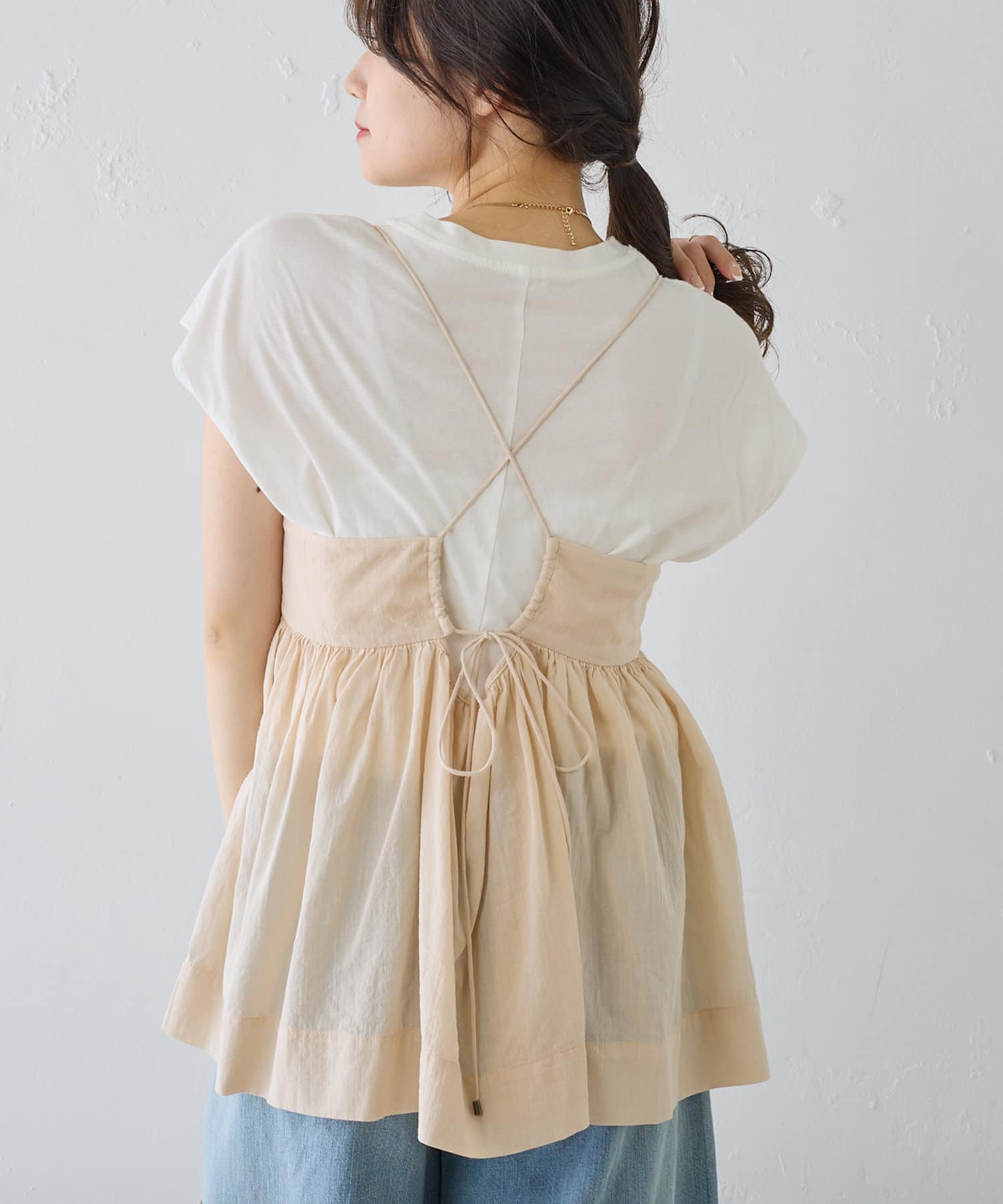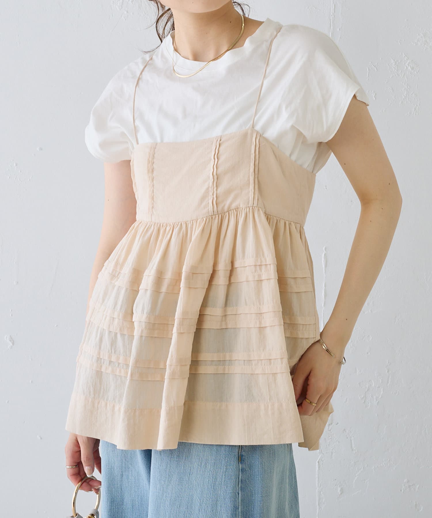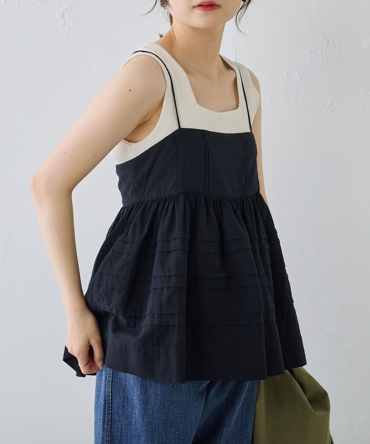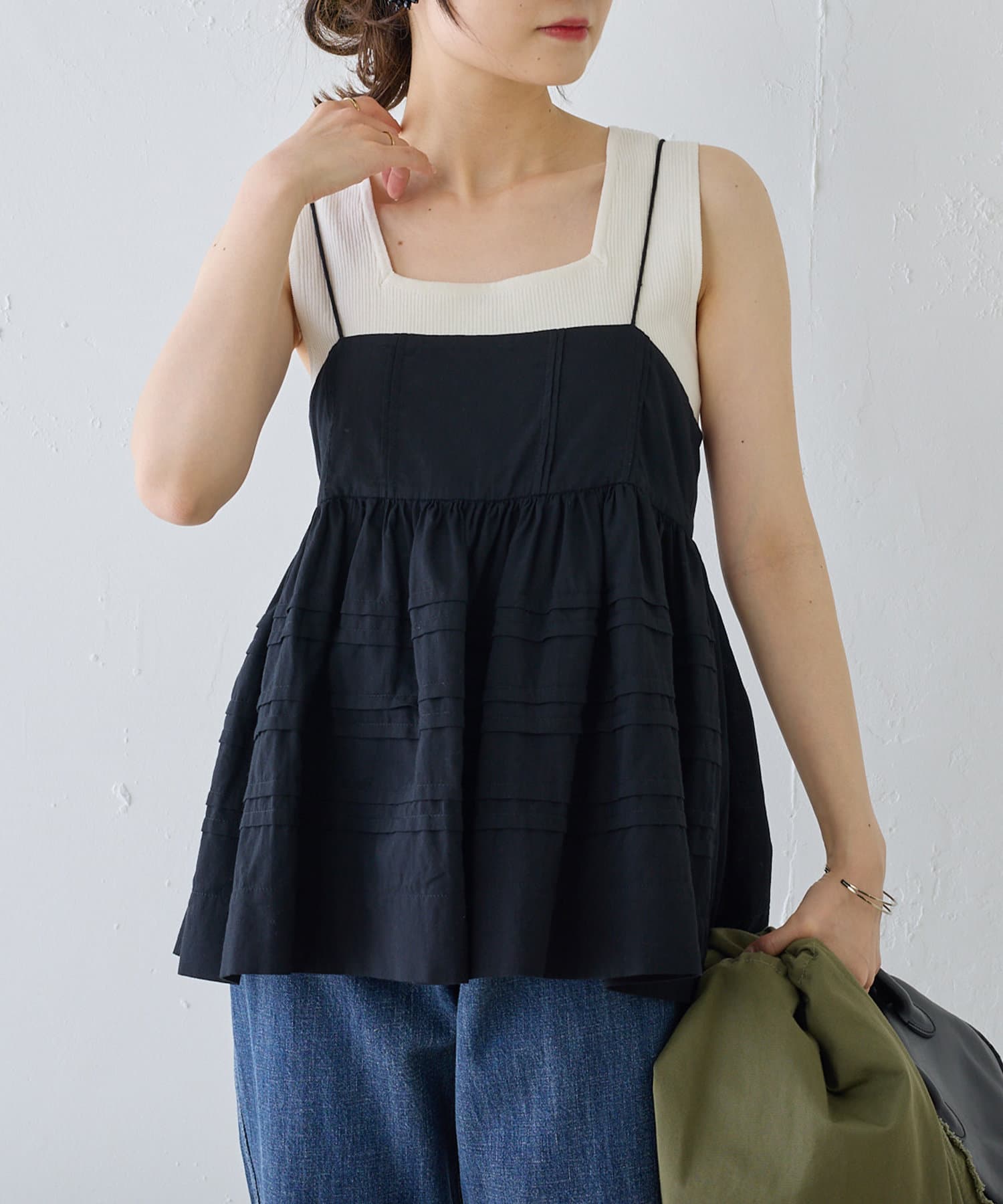 胸下から広がるフレアなラインで、女性らしい雰囲気をアップさせてくれるペプラムキャミブラウス。