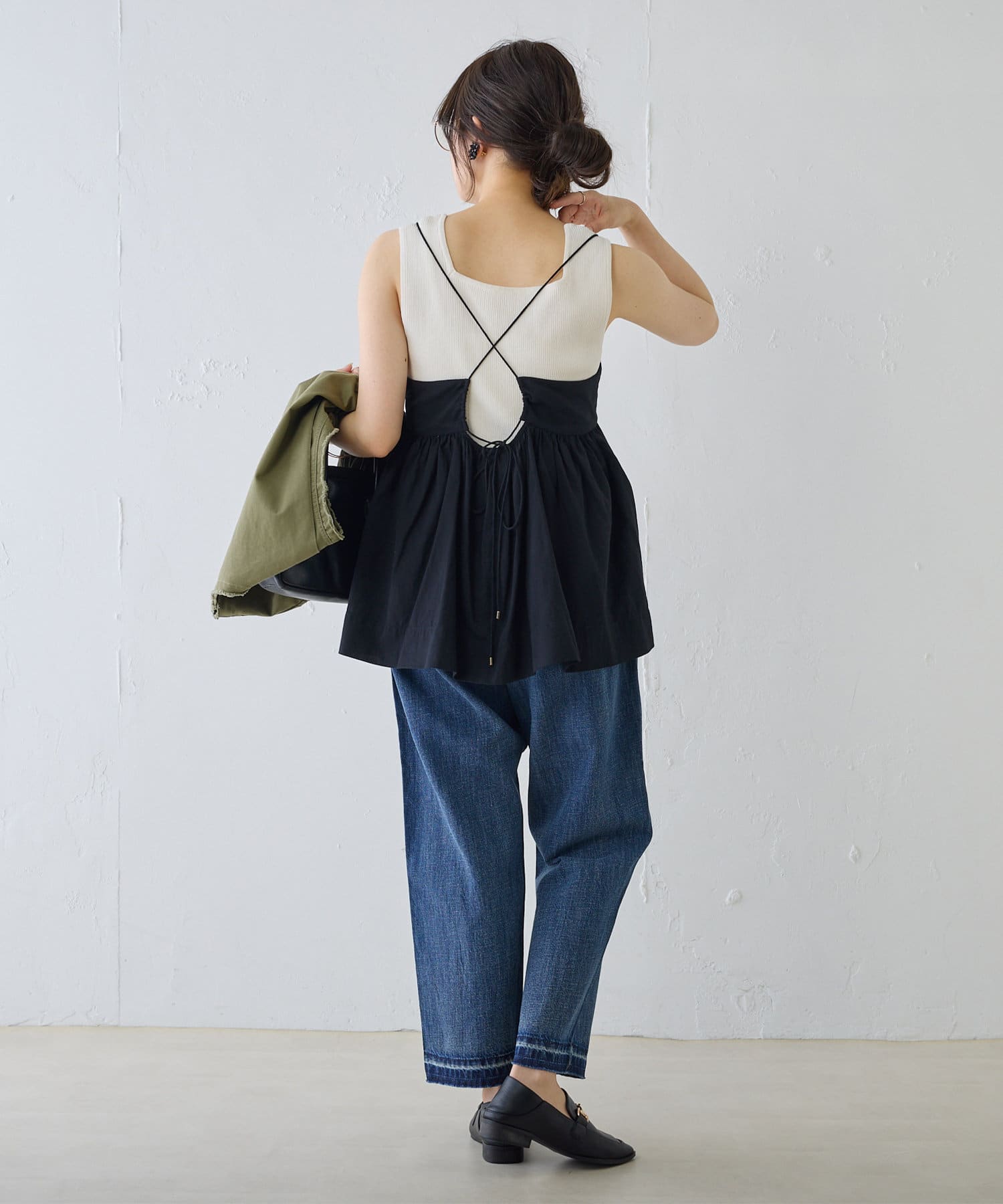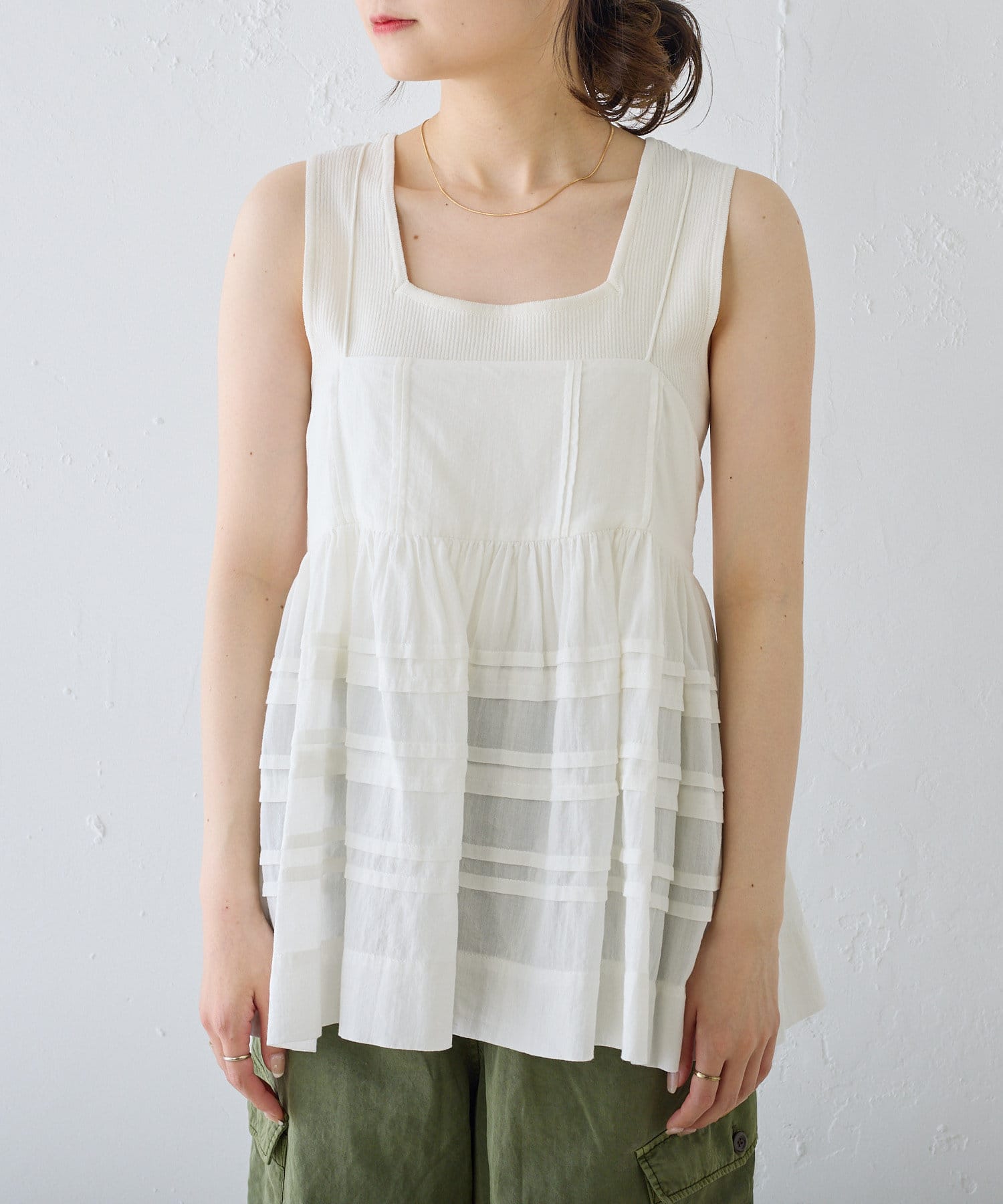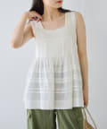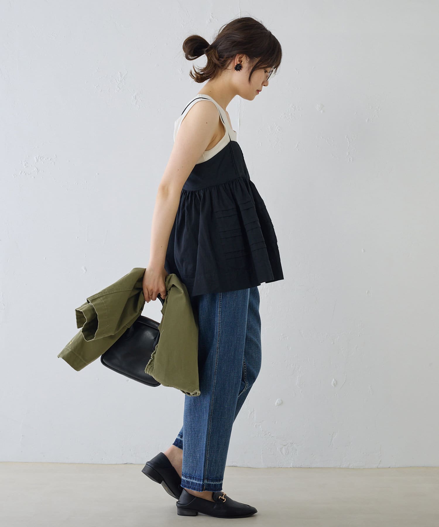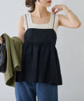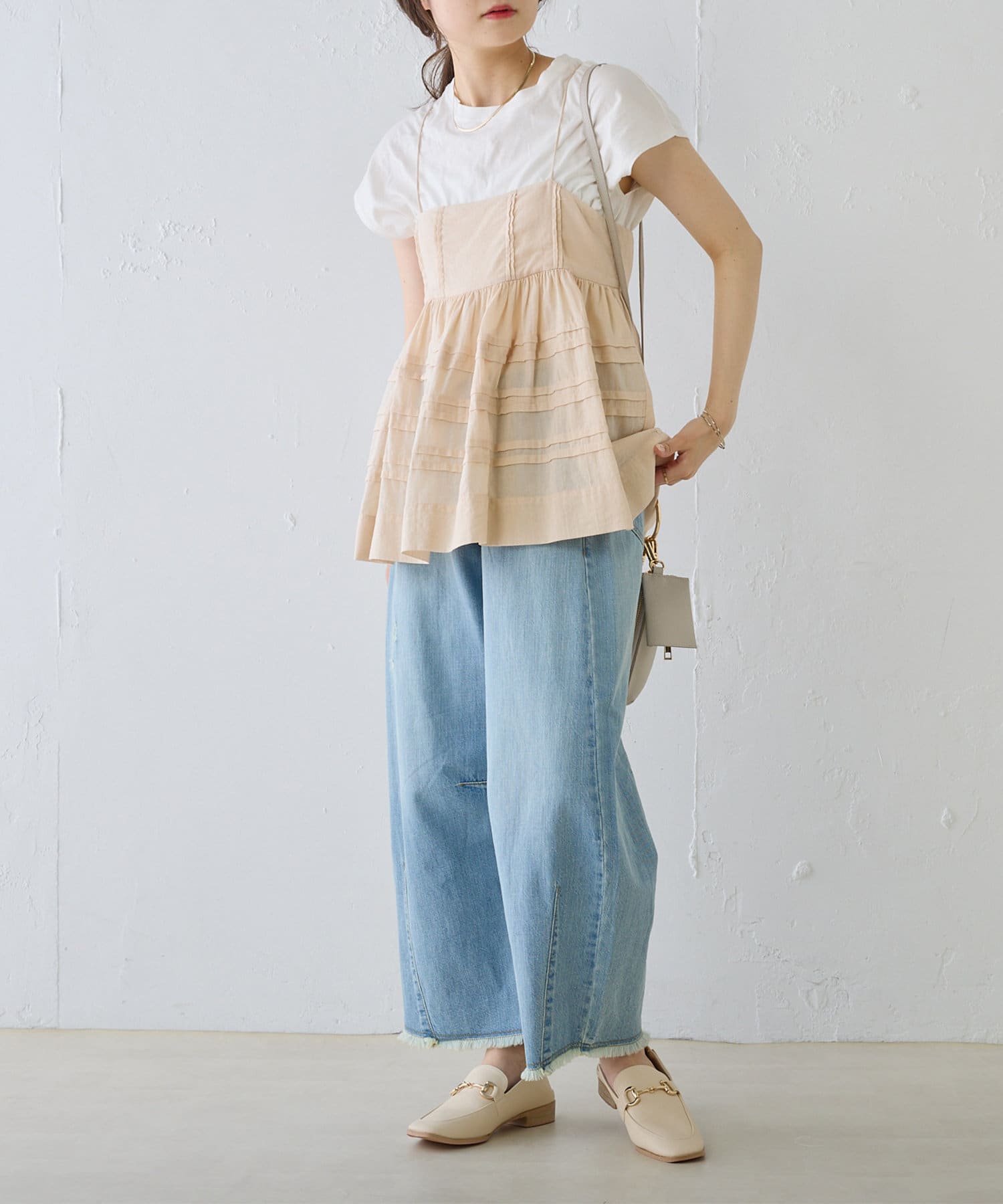 胸下から広がるフレアなラインで、女性らしい雰囲気をアップさせてくれるペプラムキャミブラウス。