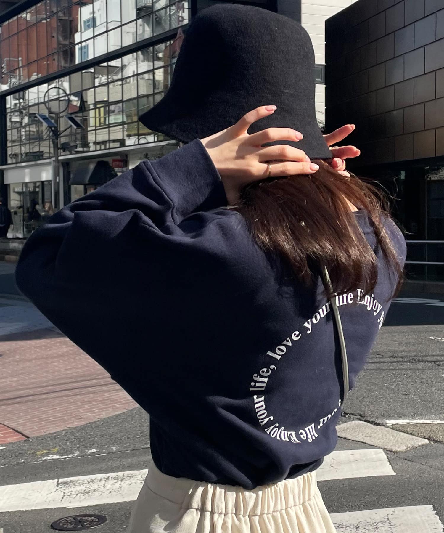 胸元に入った「My favorite things」とバックに入った「Enjoy your life、love your life」は自分自身を鼓舞できるようなメッセージ性を持たせ、着ているだけで気分が上がるようなデザインに仕上げました。