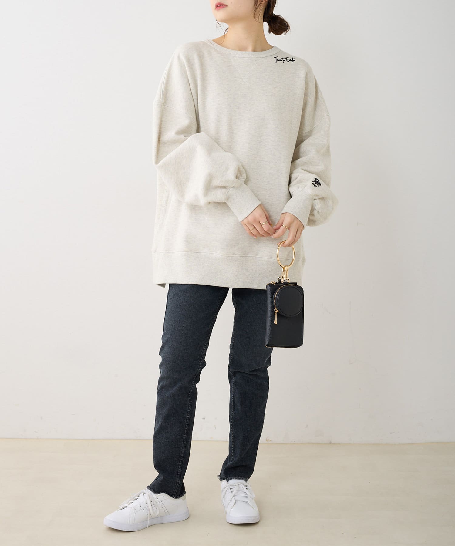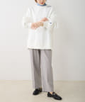 ビッグシルエットとドロップショルダーが華奢見えし、女性らしさをプラス。