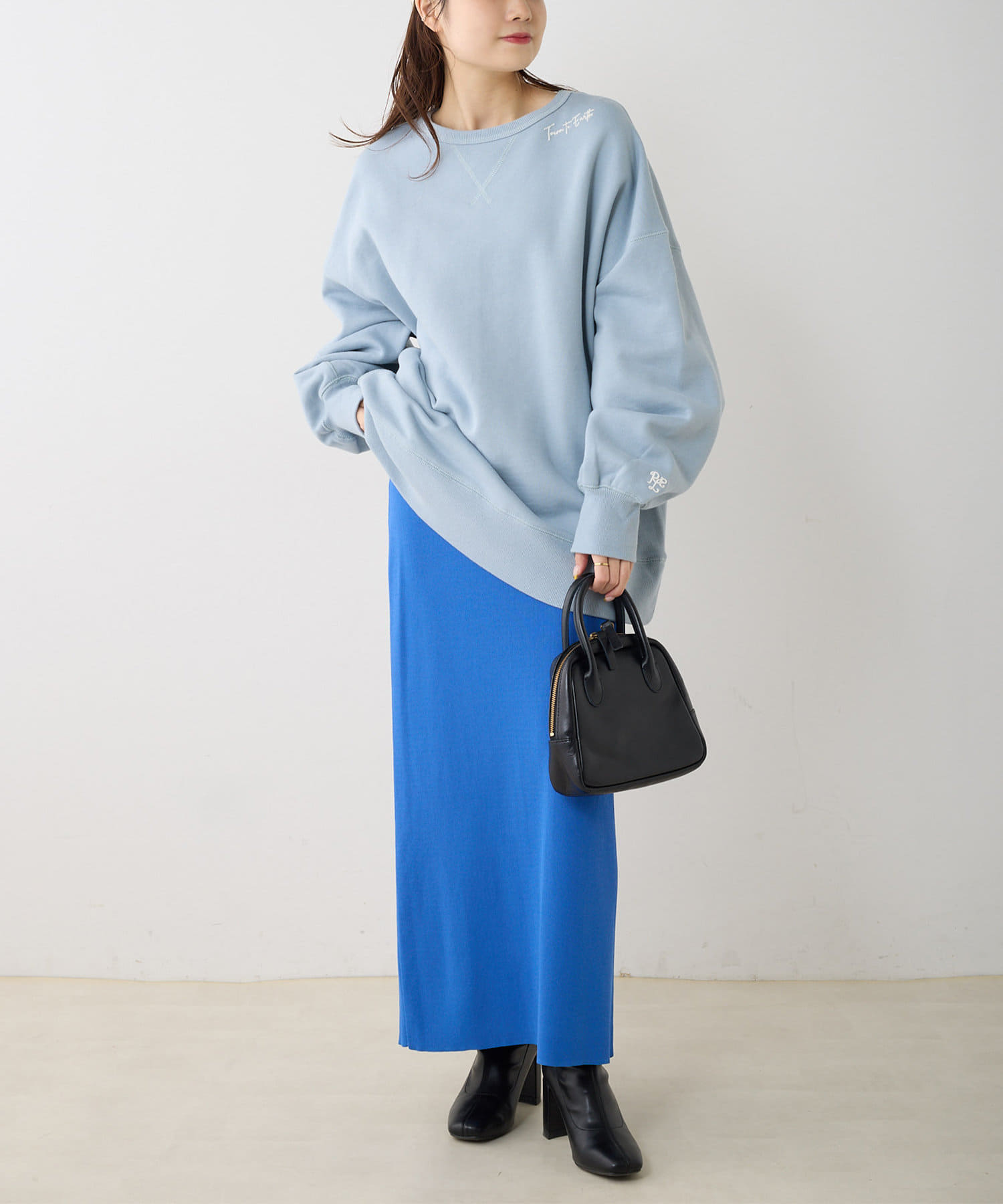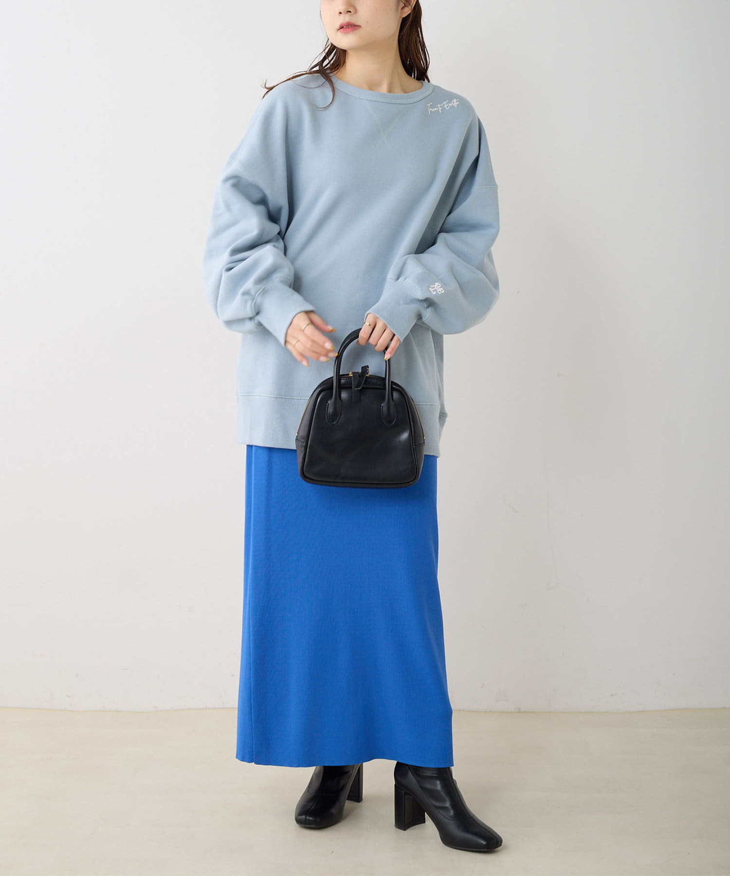 ボトムスはナロースカートやスキニーパンツなど、すっきりとしたシルエットのアイテムを合わせるとバランスが良くなります。
