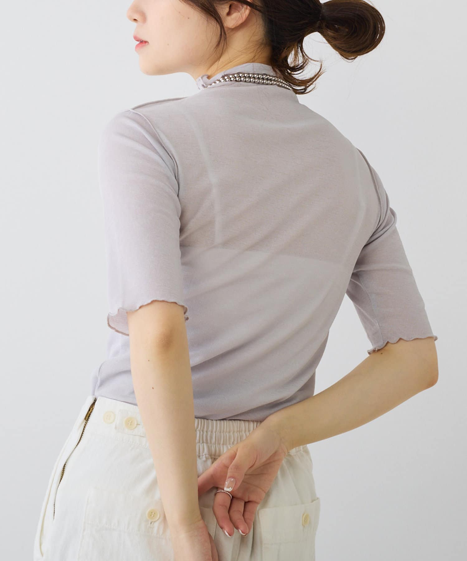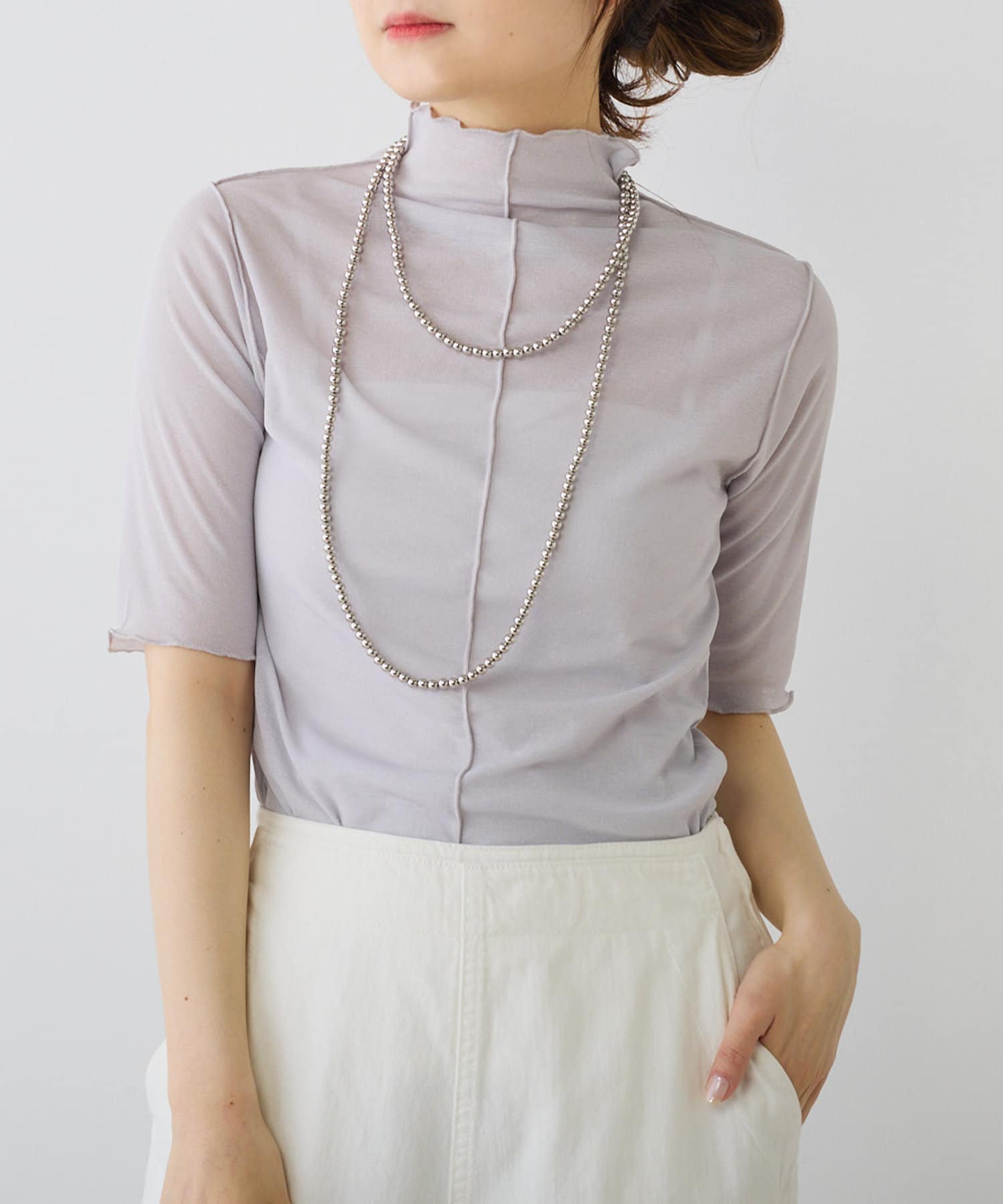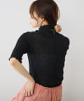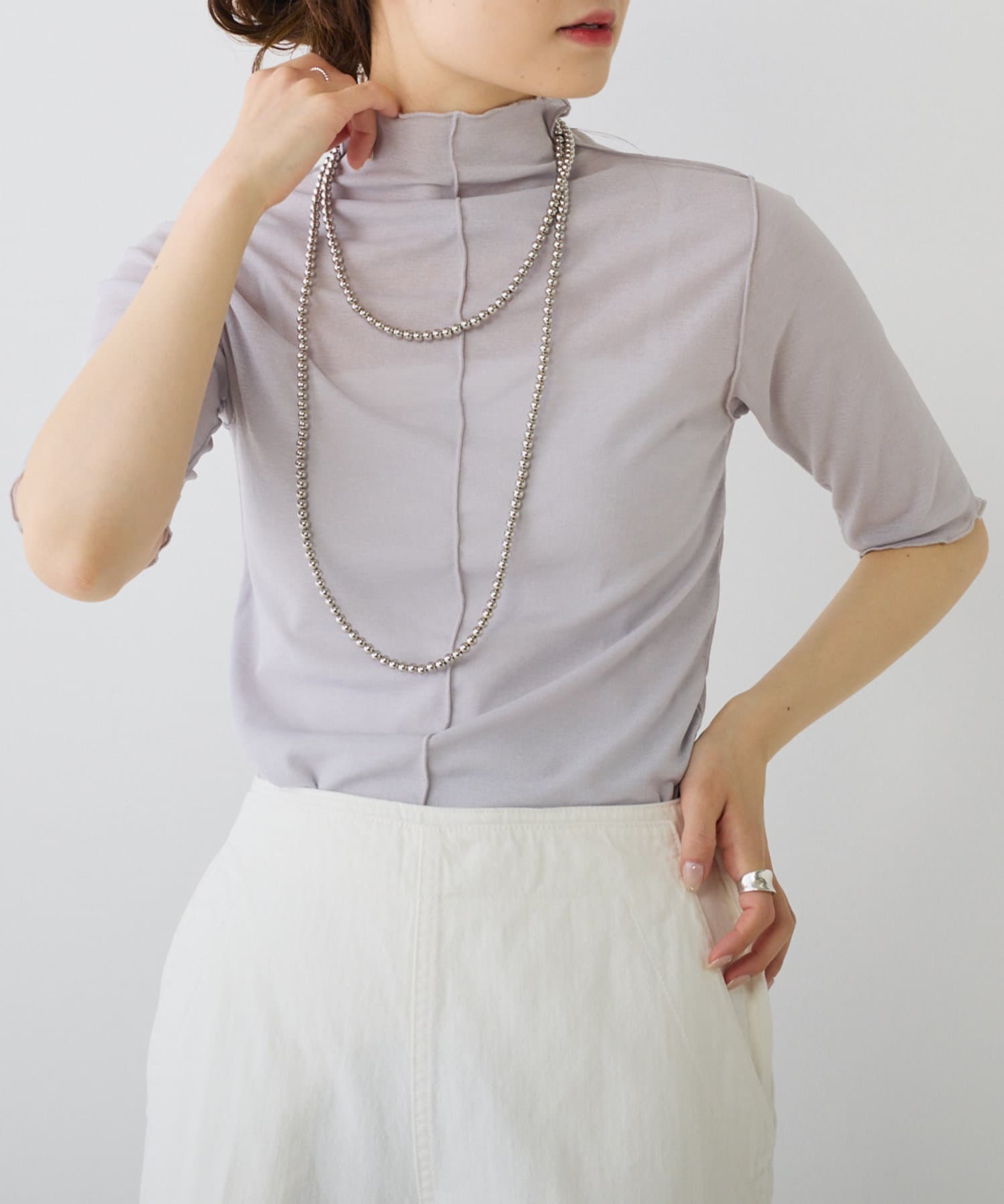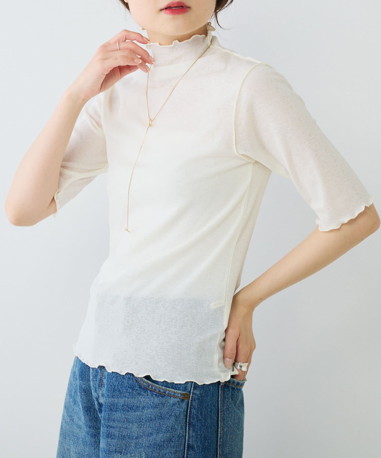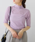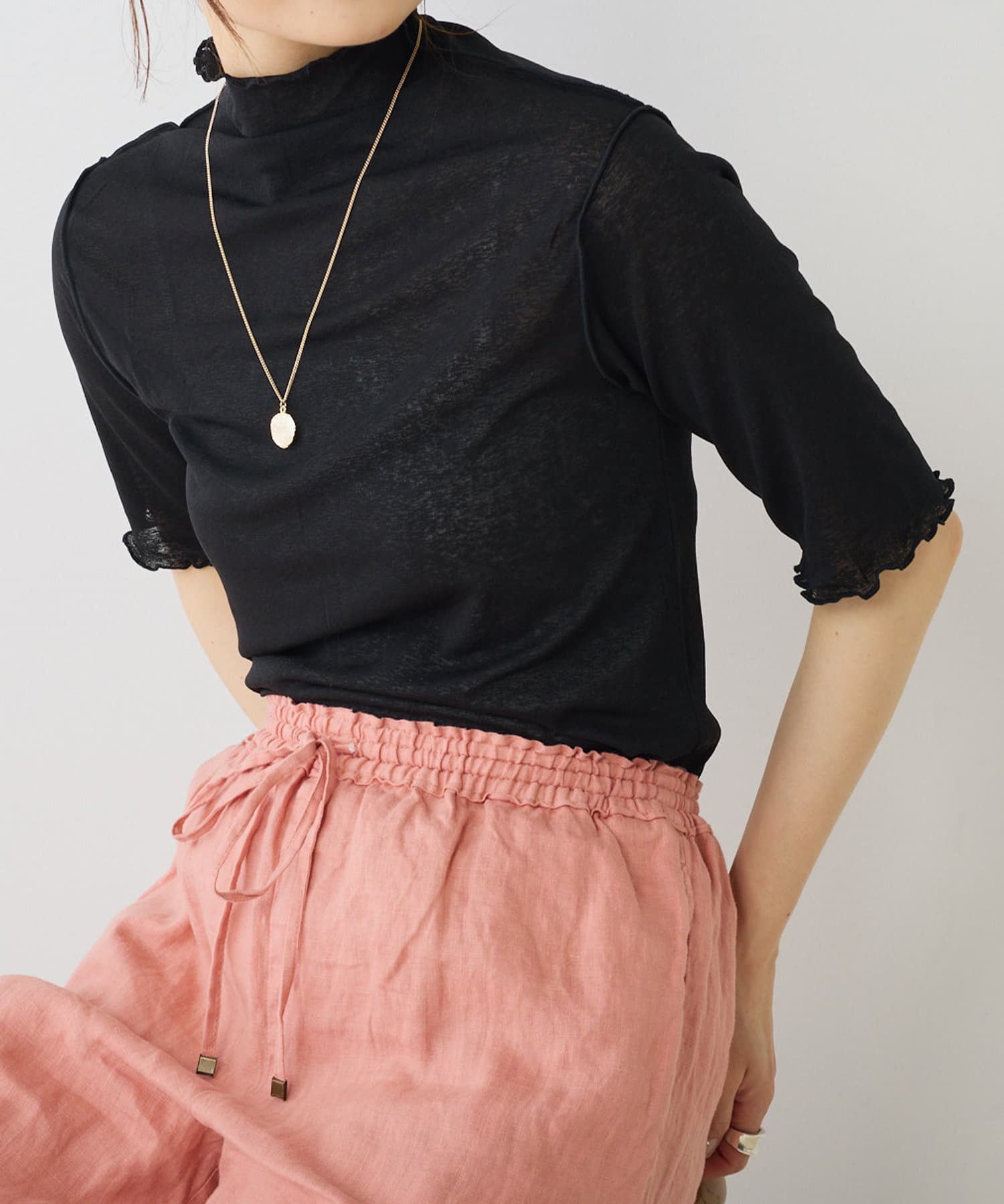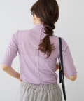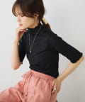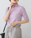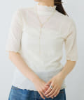 詰まりすぎていないプチハイネックにハーフスリーブが、ラフに大人っぽく着こなすことができます。