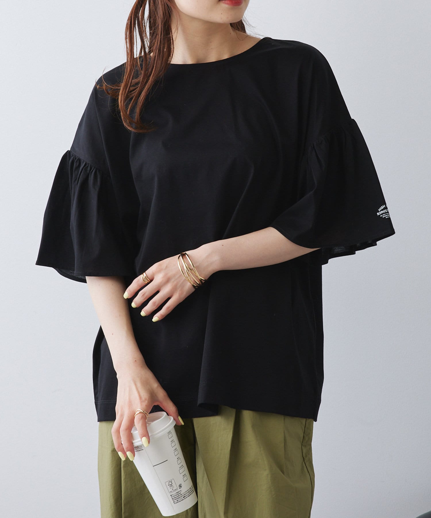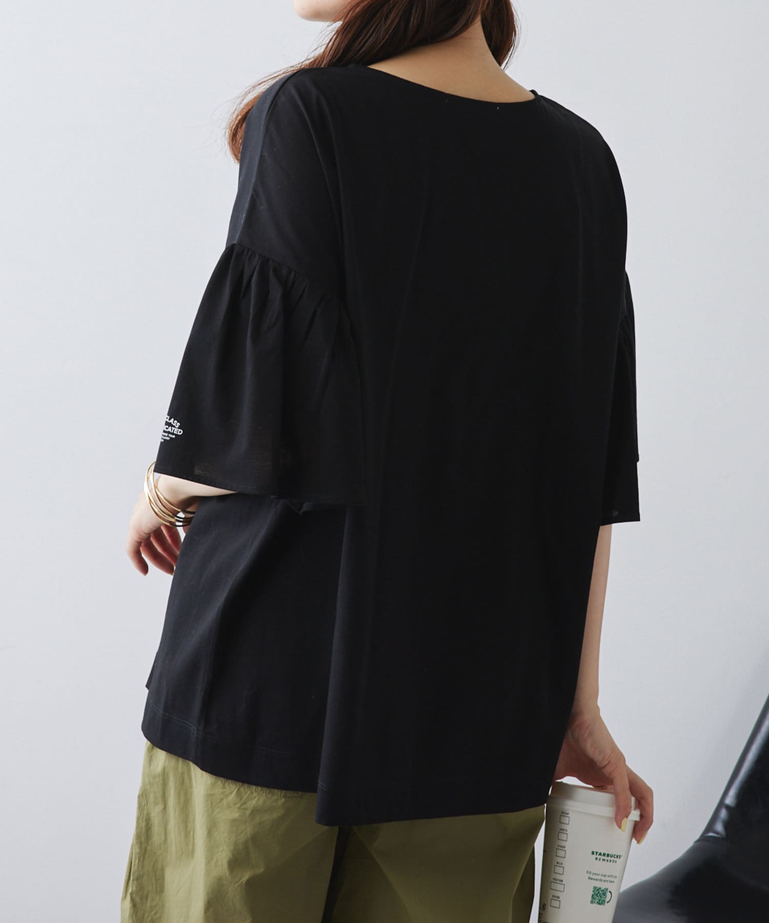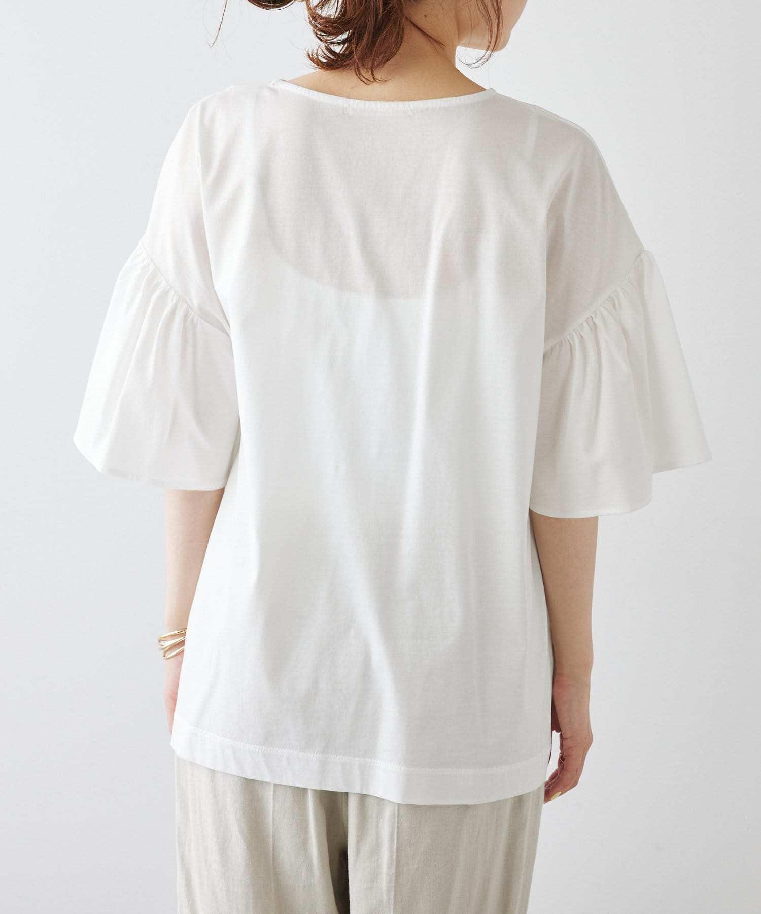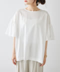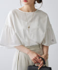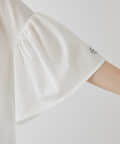 シンプルな身頃に華やかなフリル袖が目を惹く一枚。