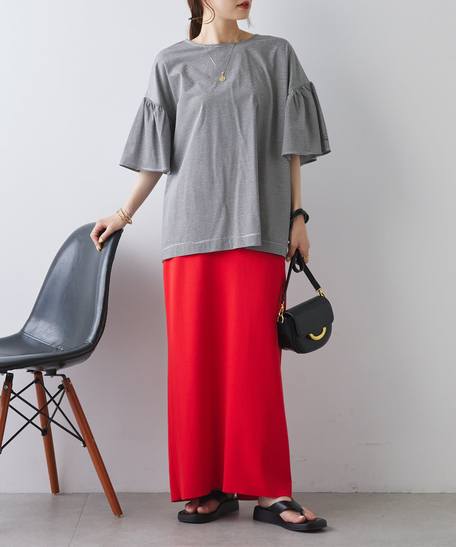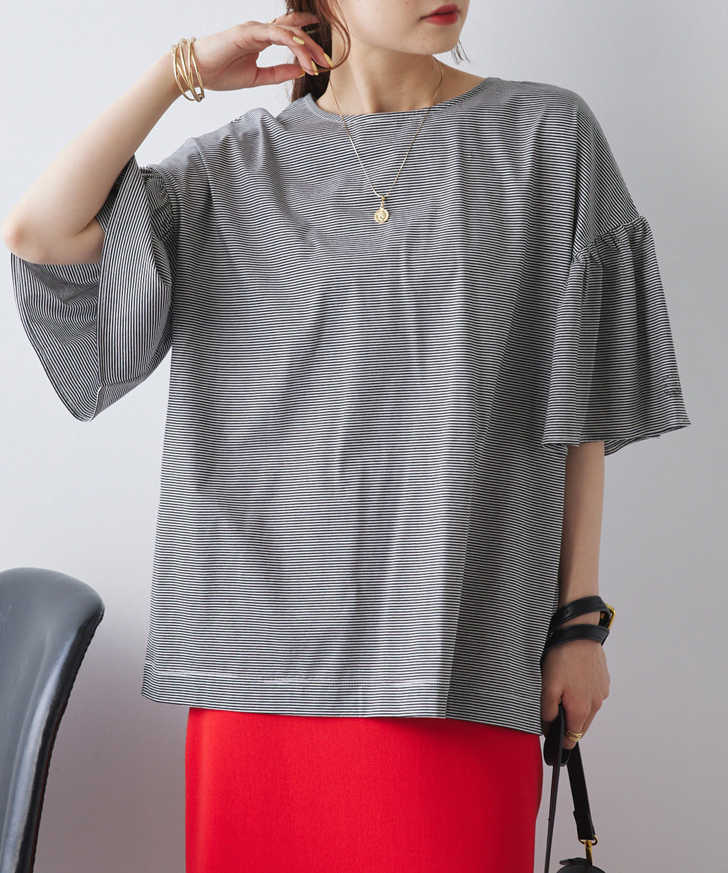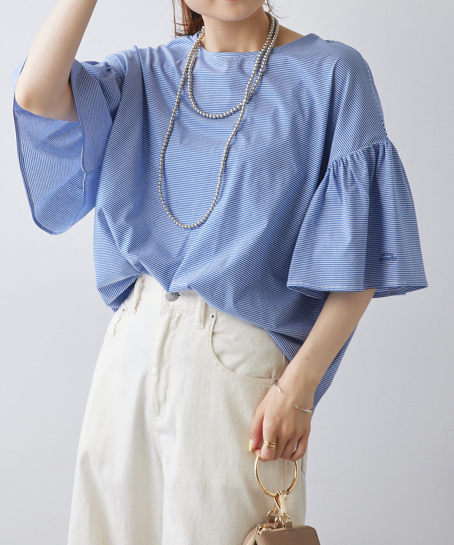 シンプルな身頃に華やかなフリル袖が目を惹く一枚。