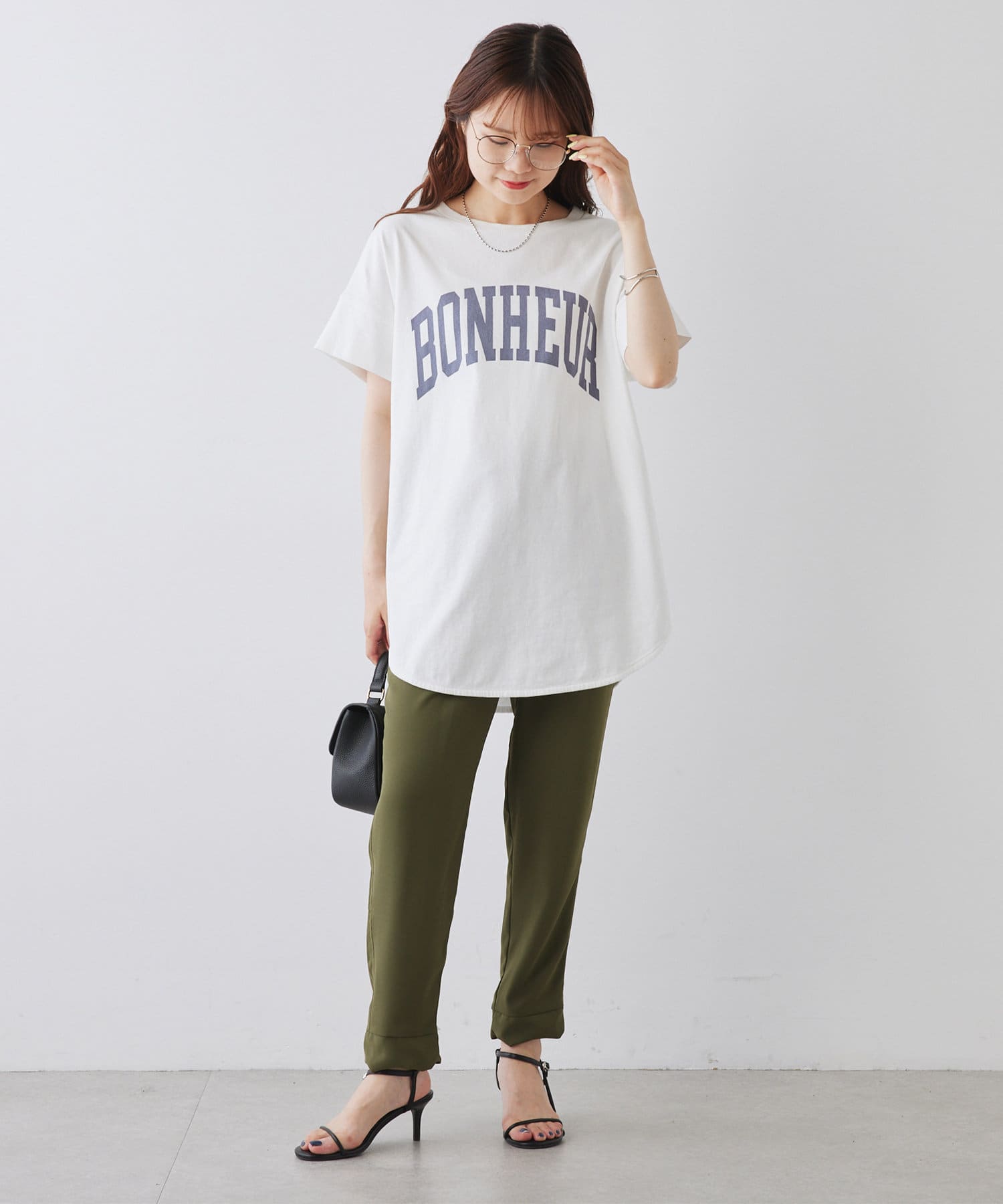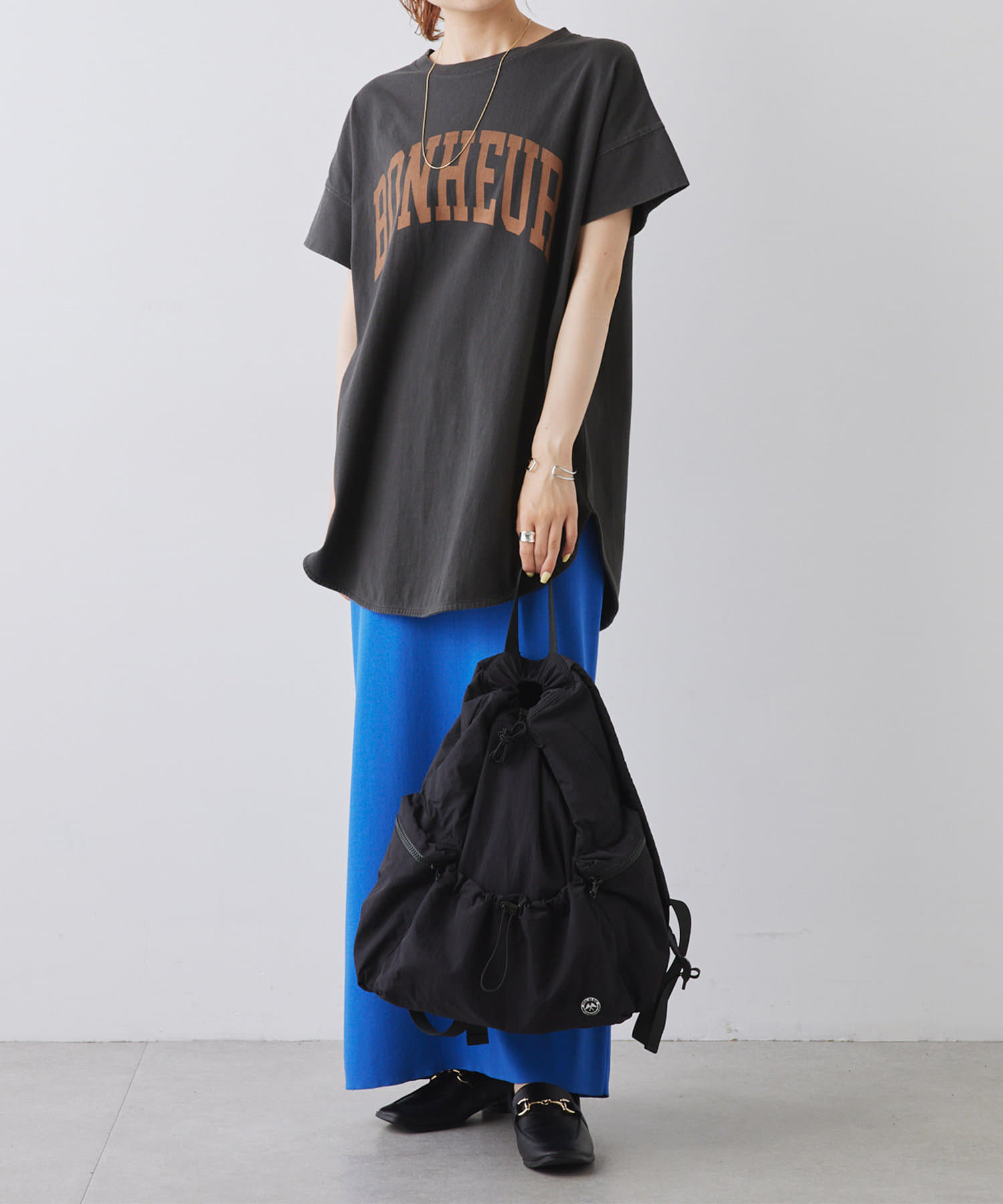 身体のラインを拾わないゆとりを持たせつつ、すっきり見えするサイズバランスに拘りました。