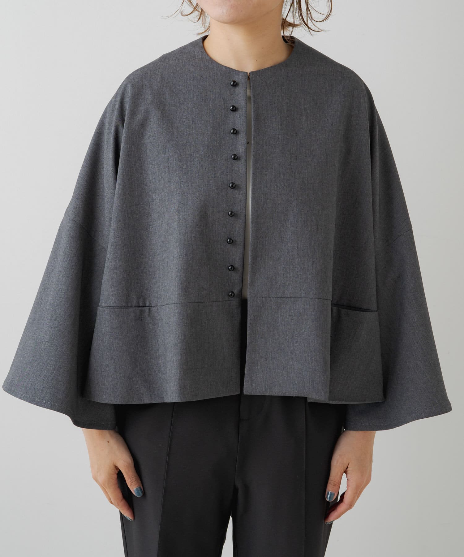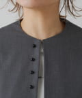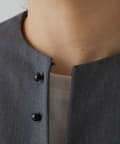 フロントの飾りボタンがアクセントになったノーカラージャケット。