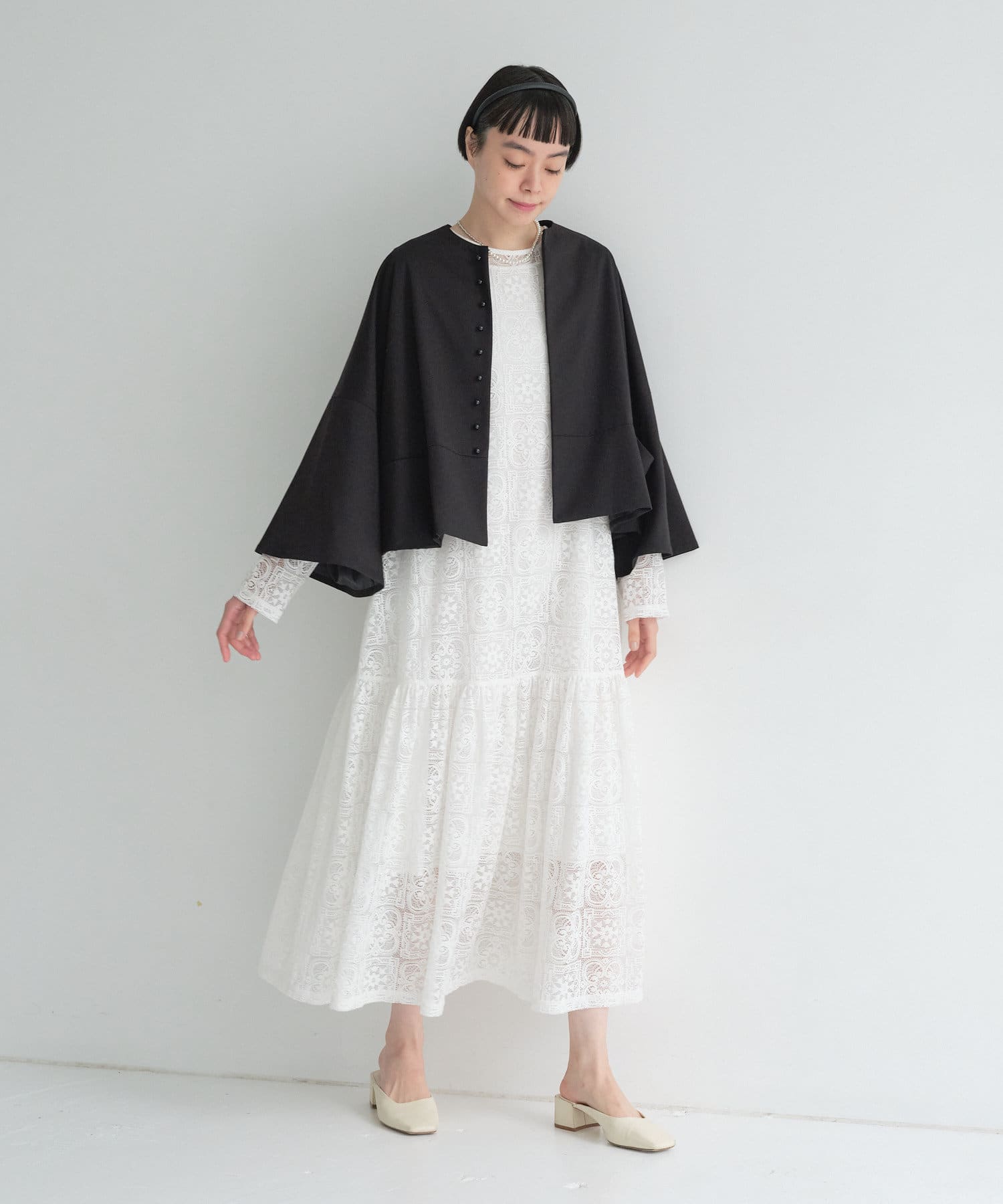 ノーカラーなのでレースが施されたハイネックトップスを合わせるのもおすすめです。