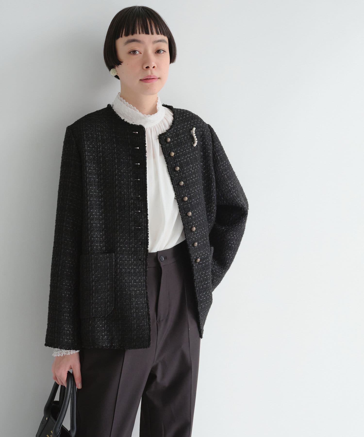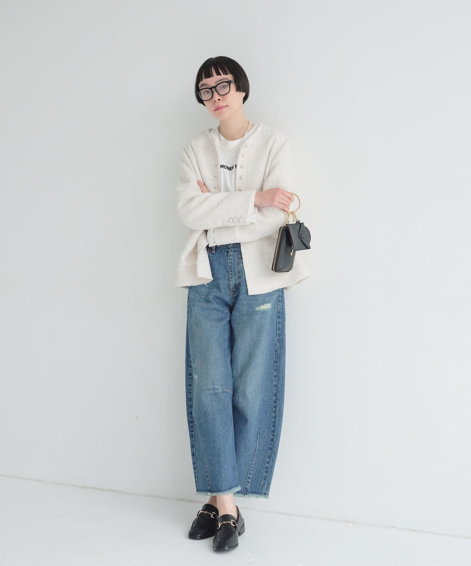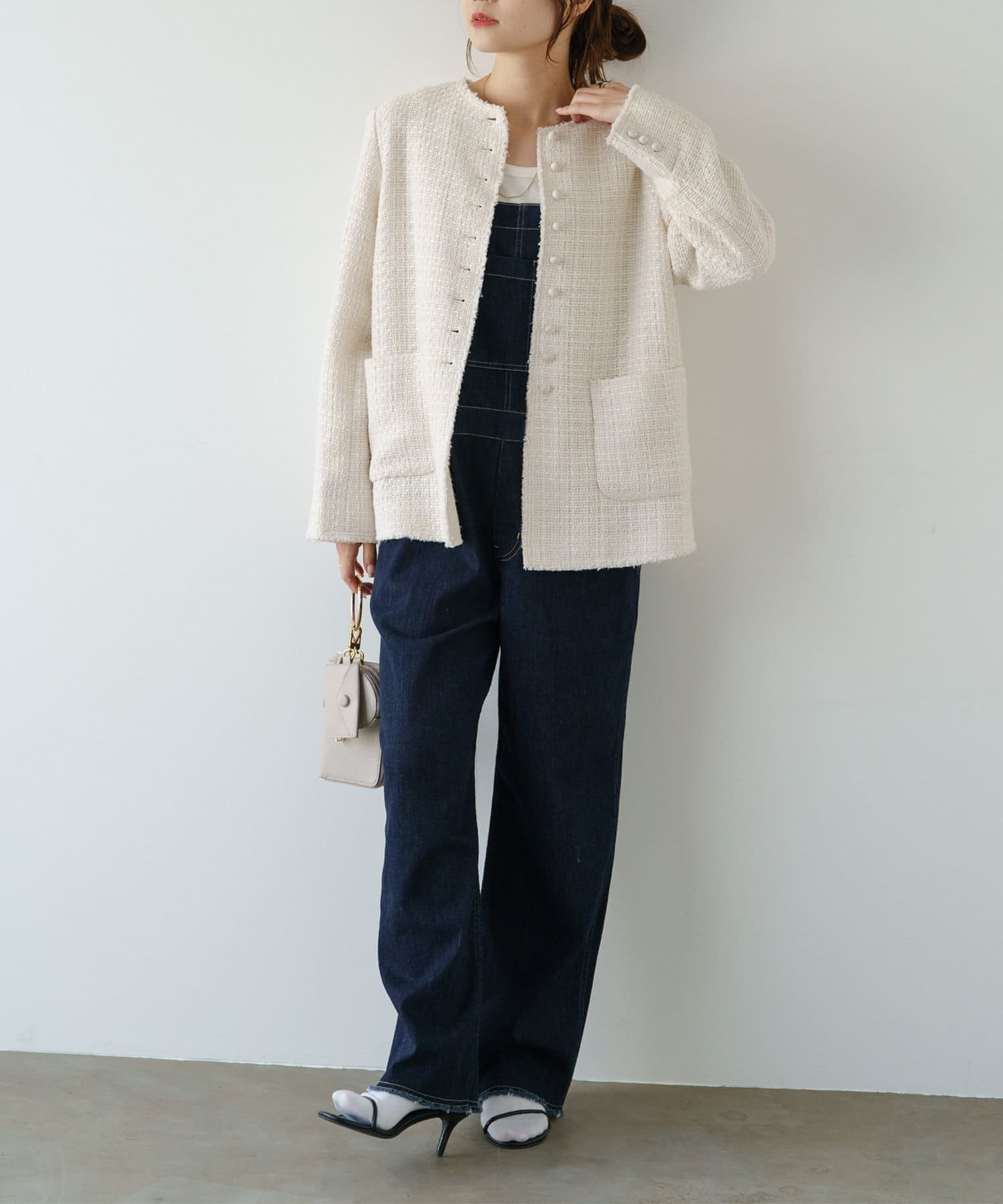 ツイードジャケットは綺麗めなコーディネートからカジュアルミックスまで幅広く活躍するので、ワードローブに加えていただきたいおすすめの一着です。