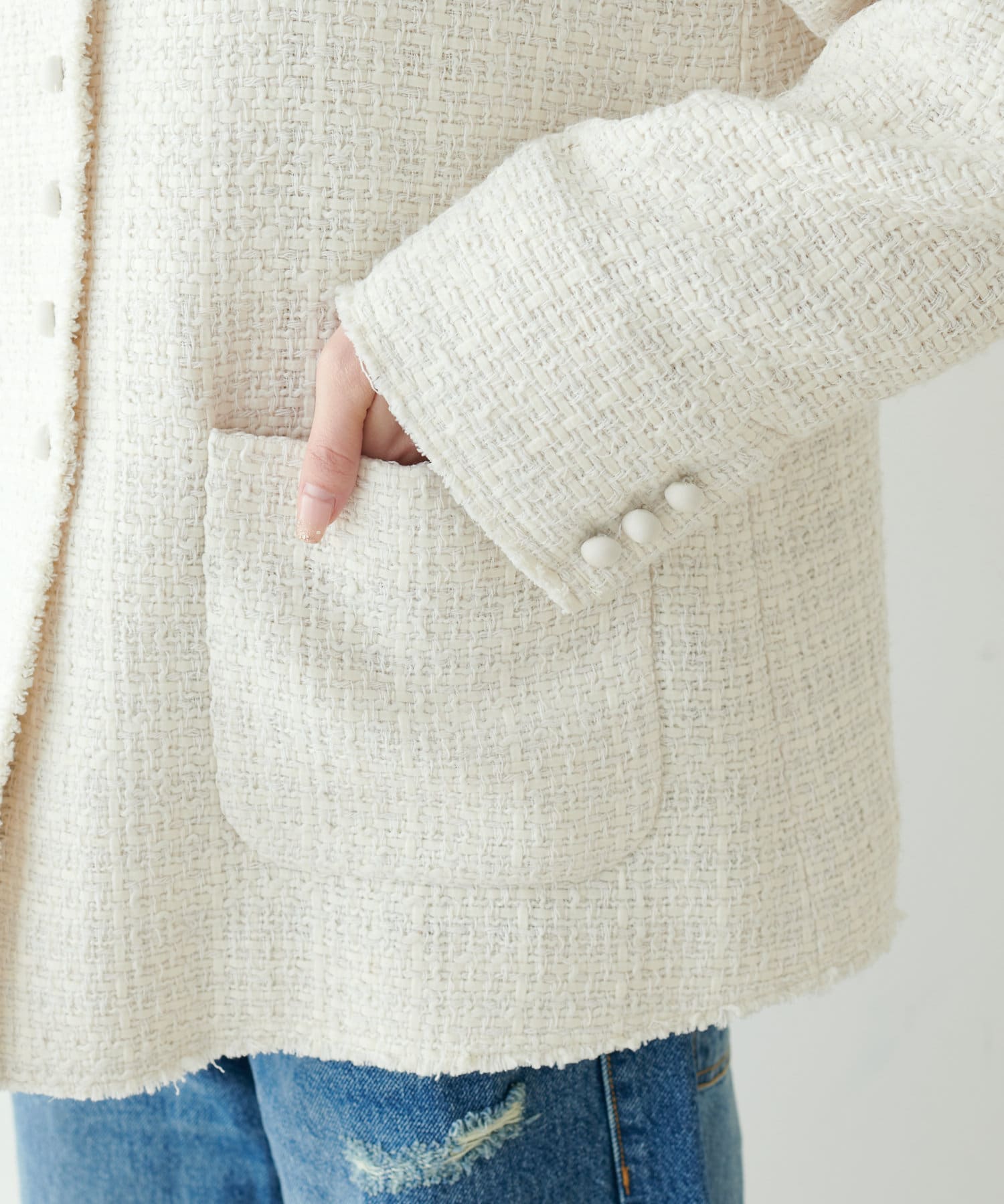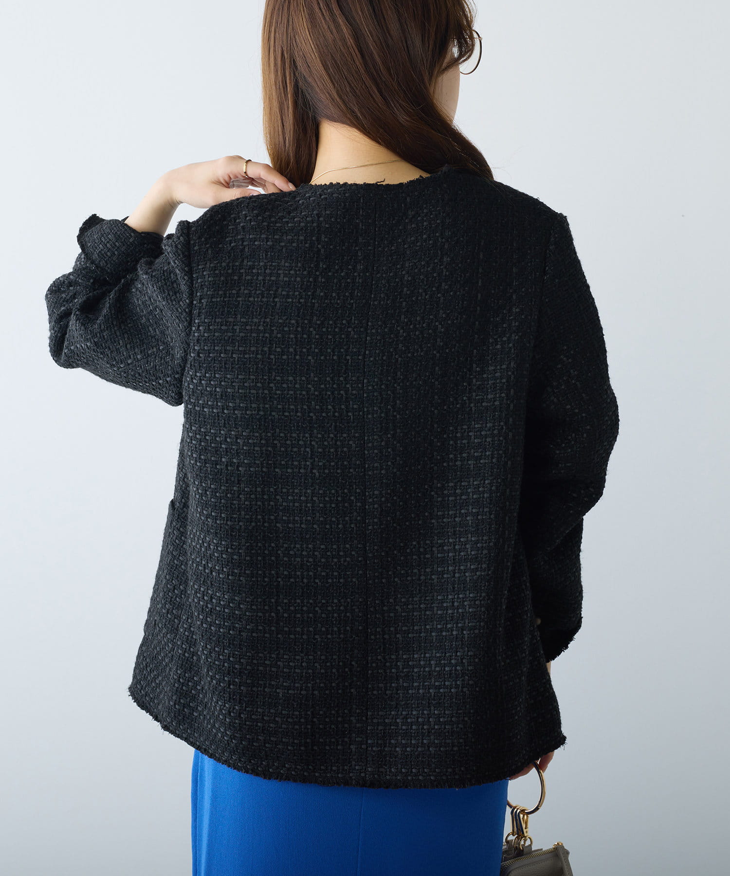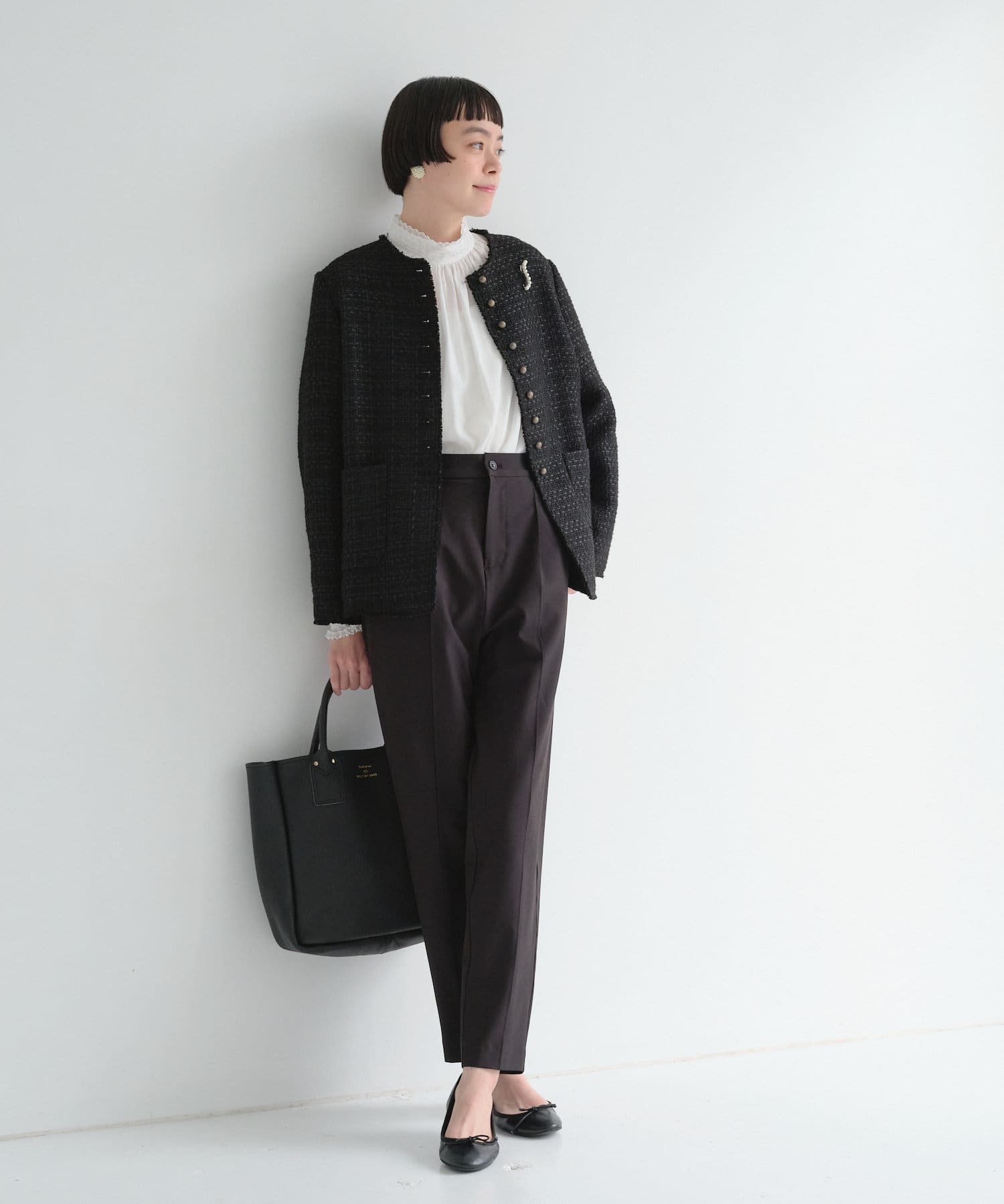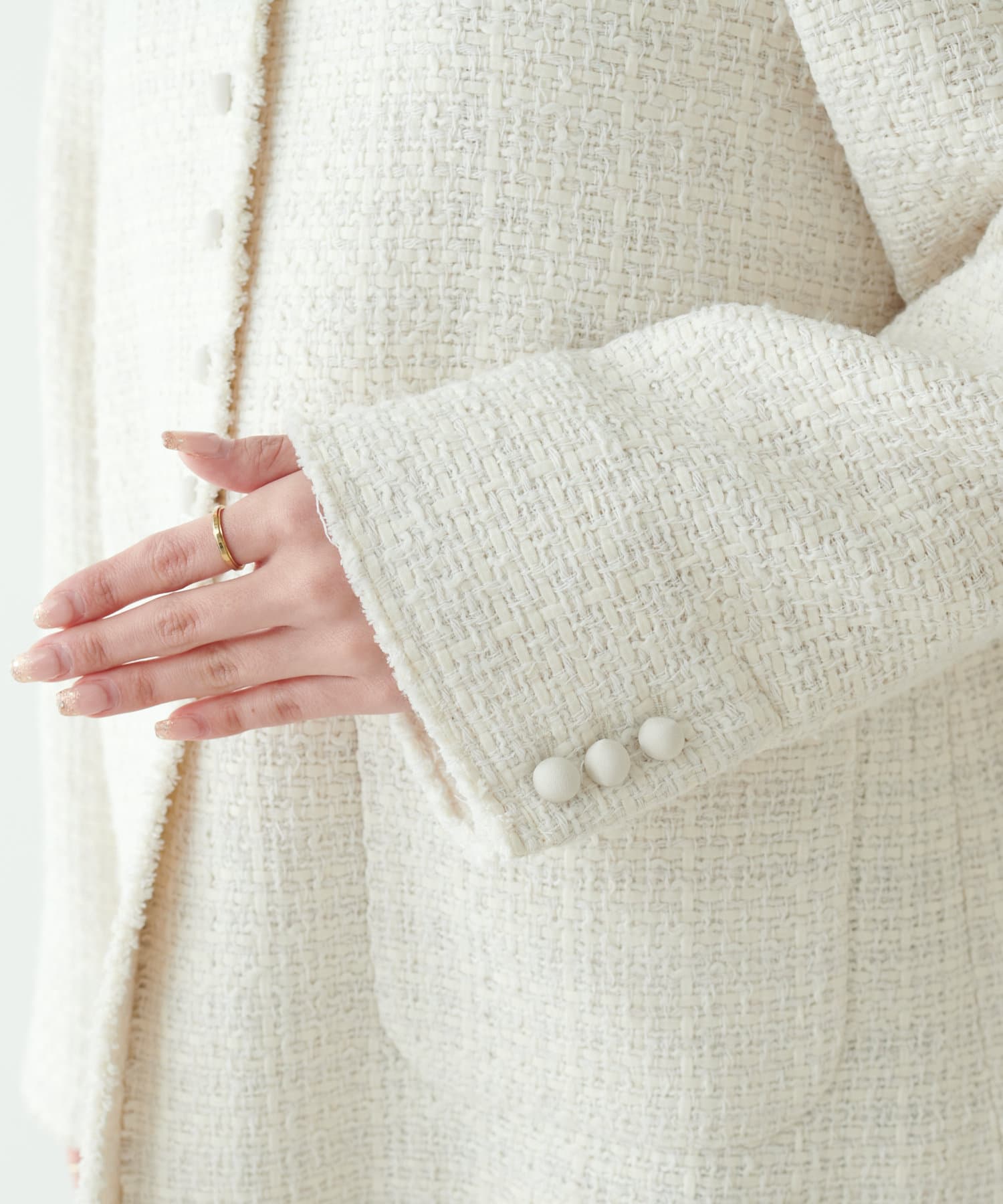 ツイードジャケットは綺麗めなコーディネートからカジュアルミックスまで幅広く活躍するので、ワードローブに加えていただきたいおすすめの一着です。