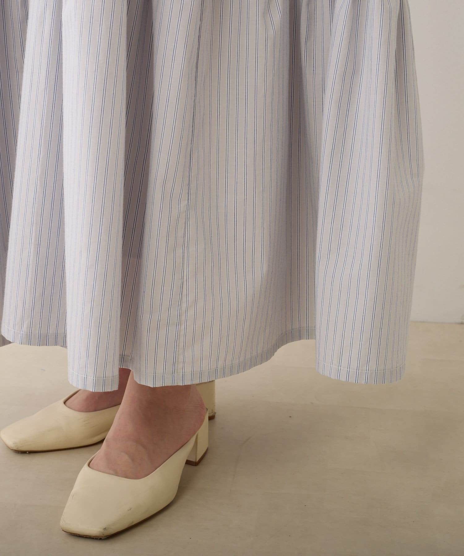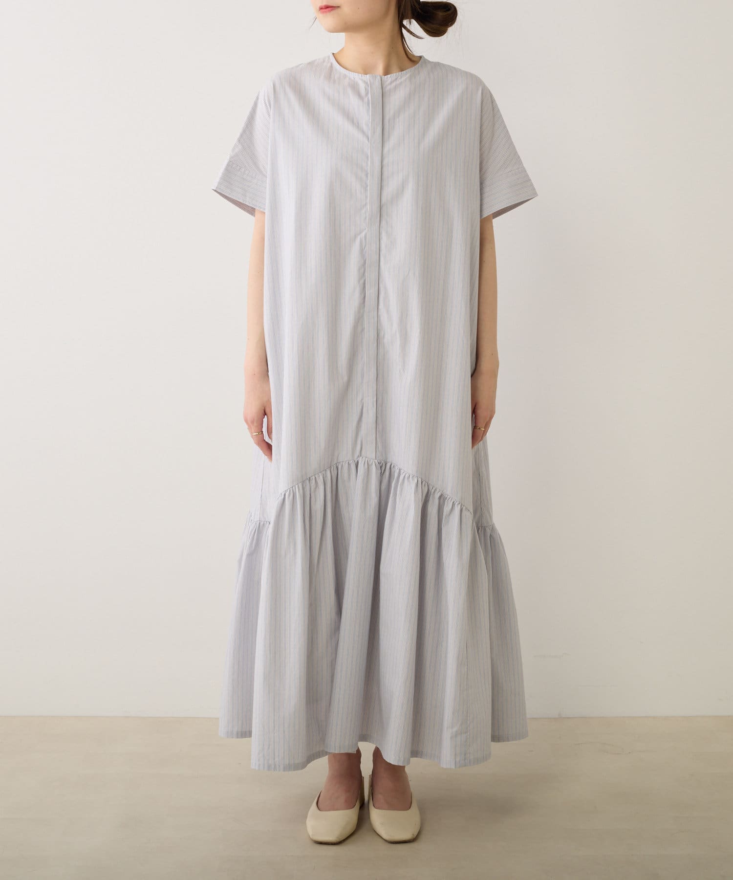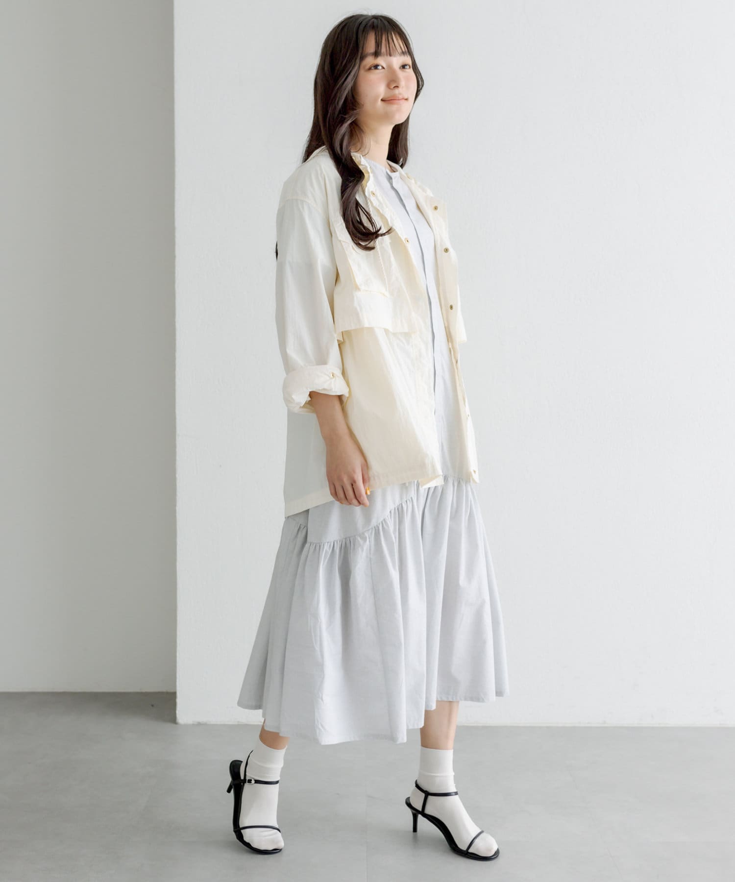 素材感:薄手で軽やかな着心地。ややハリがあるのでフレア部分が綺麗に出ます。