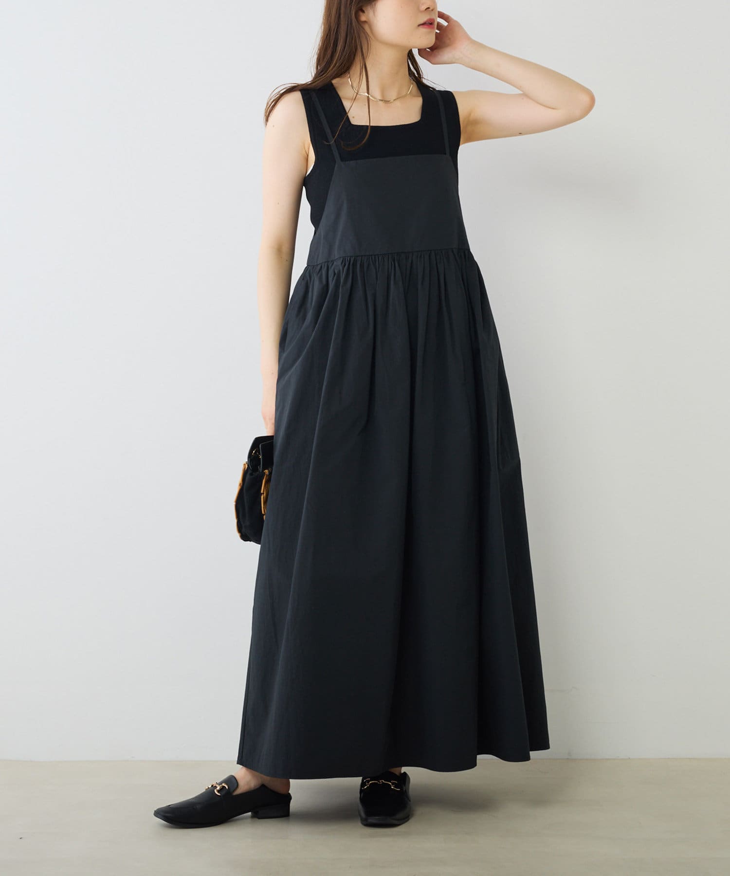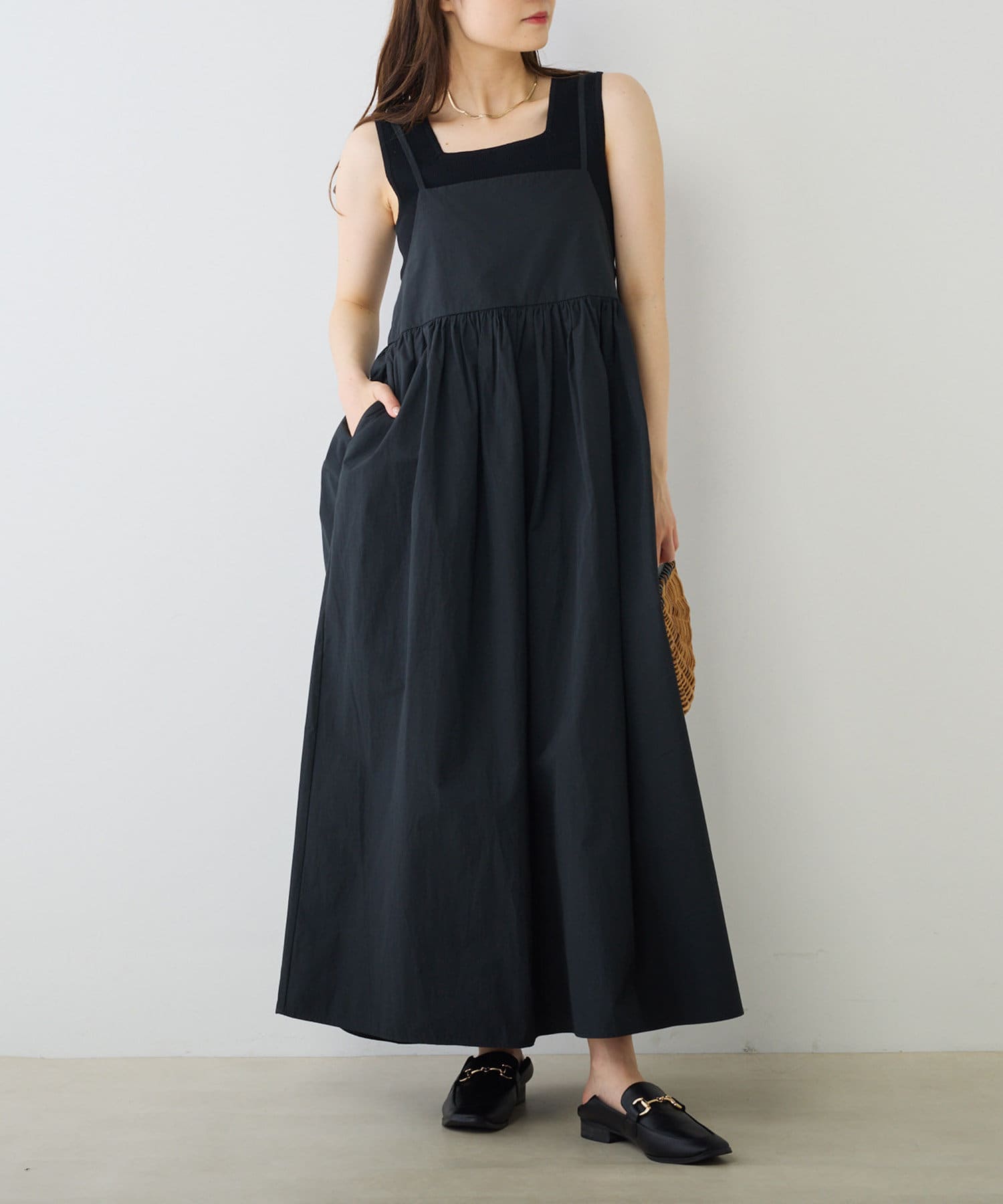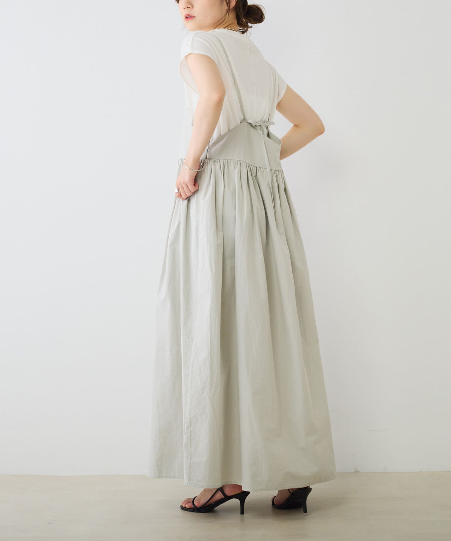 着丈は肩紐で調節でき、身長問わず着用いただけます。