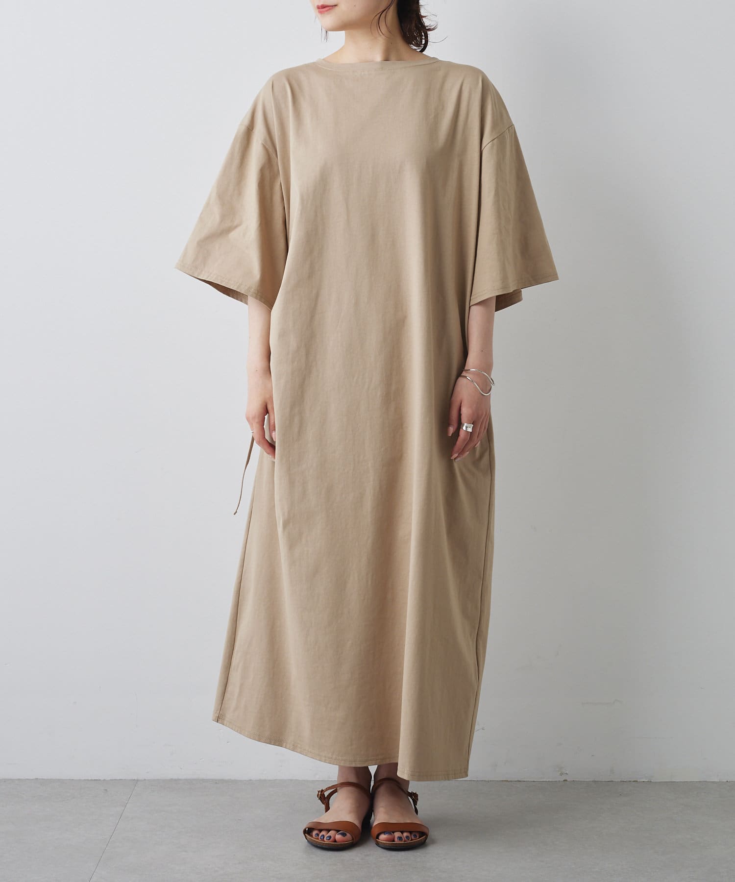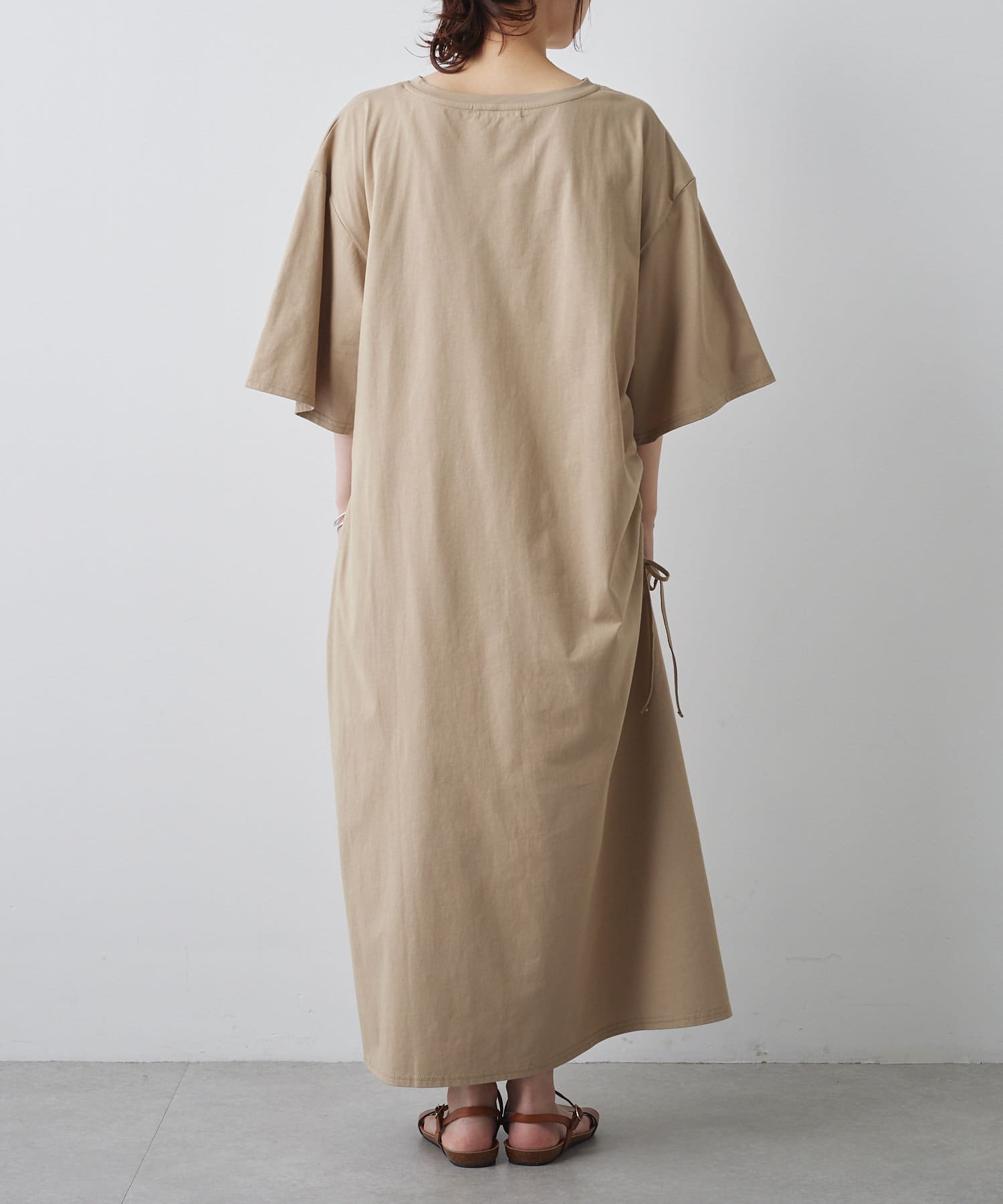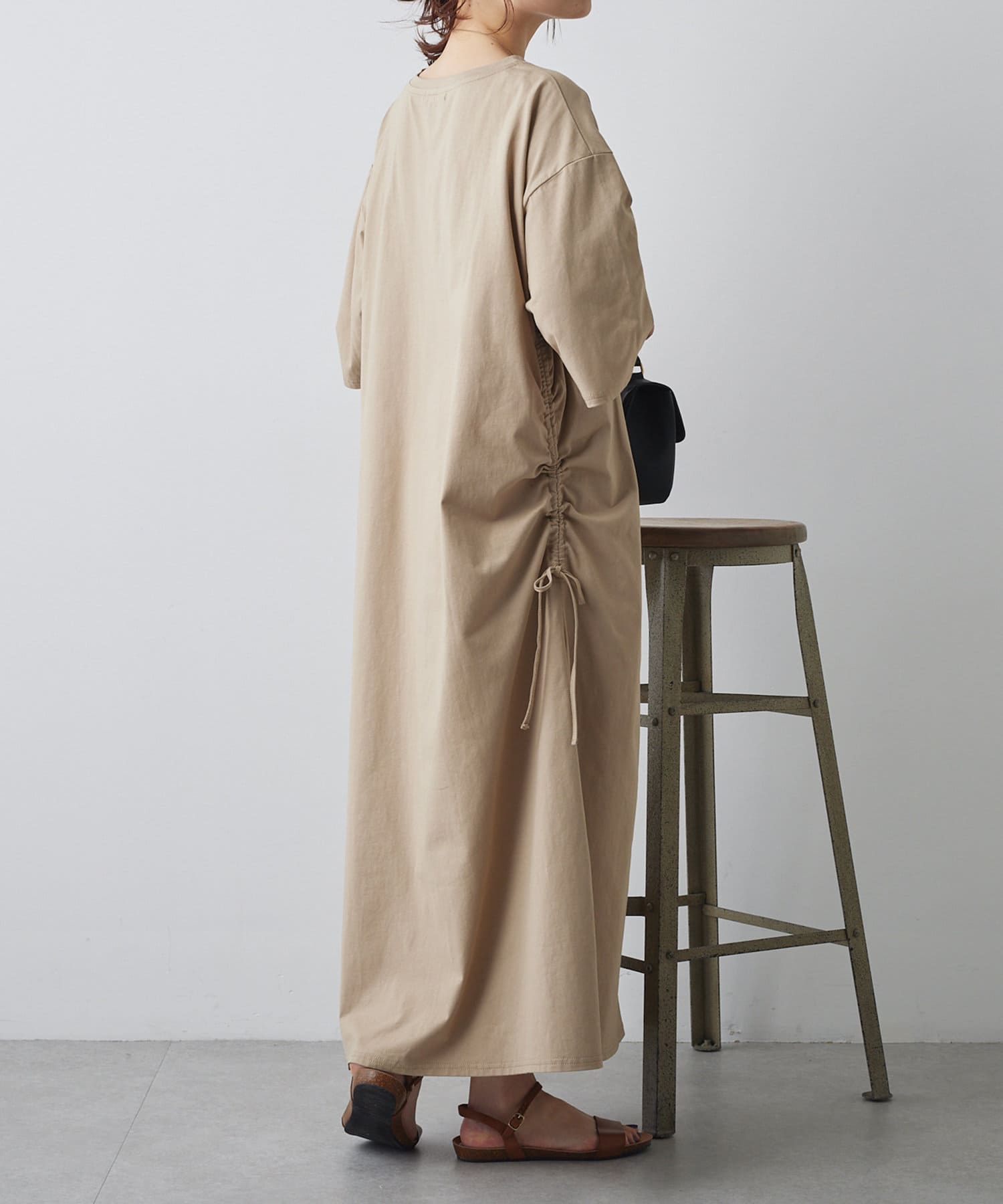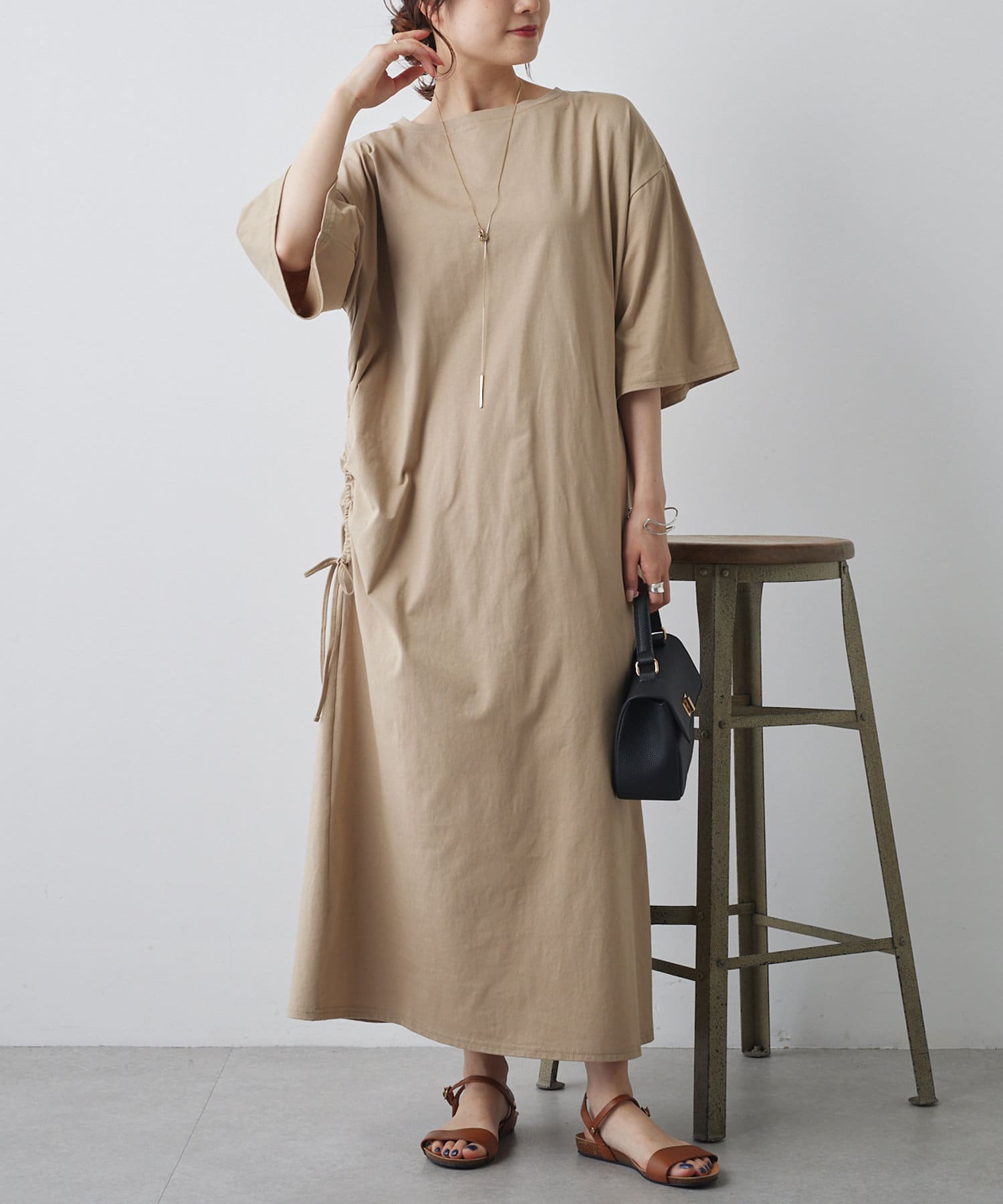 一見シンプルなワンピースに、アジャストデザインがワンポイントになった一枚。