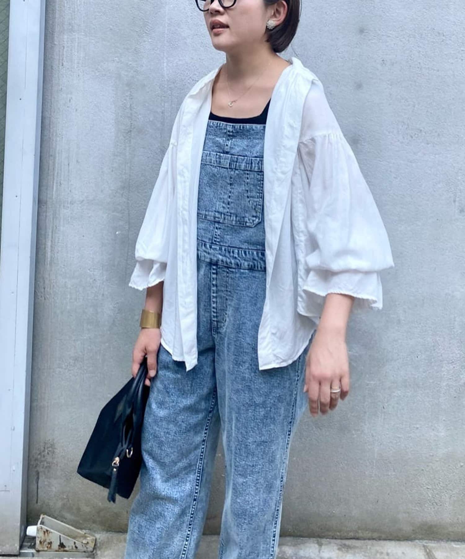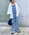 メンズライクに見えがちなサロペットは、レースやシアー素材のトップスと合わせると女性らしさが加わり、