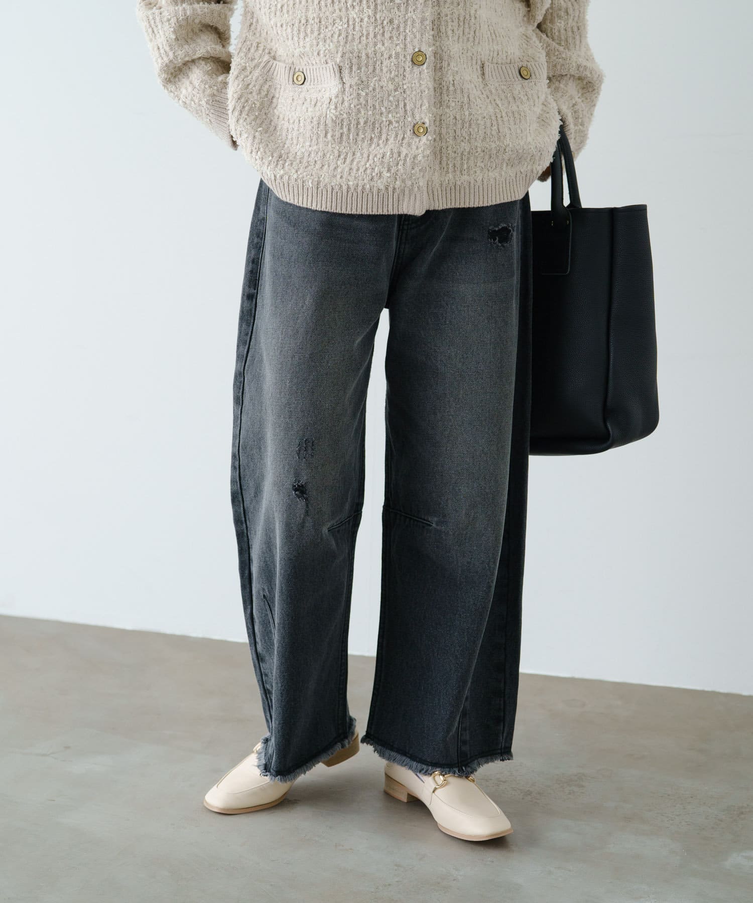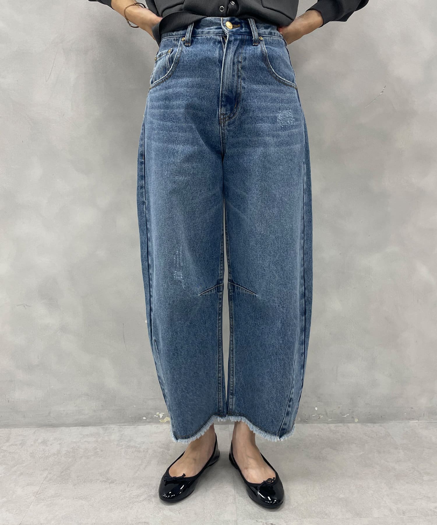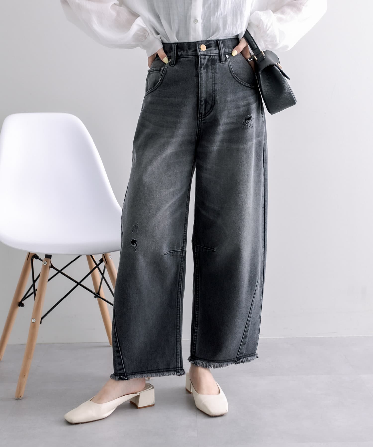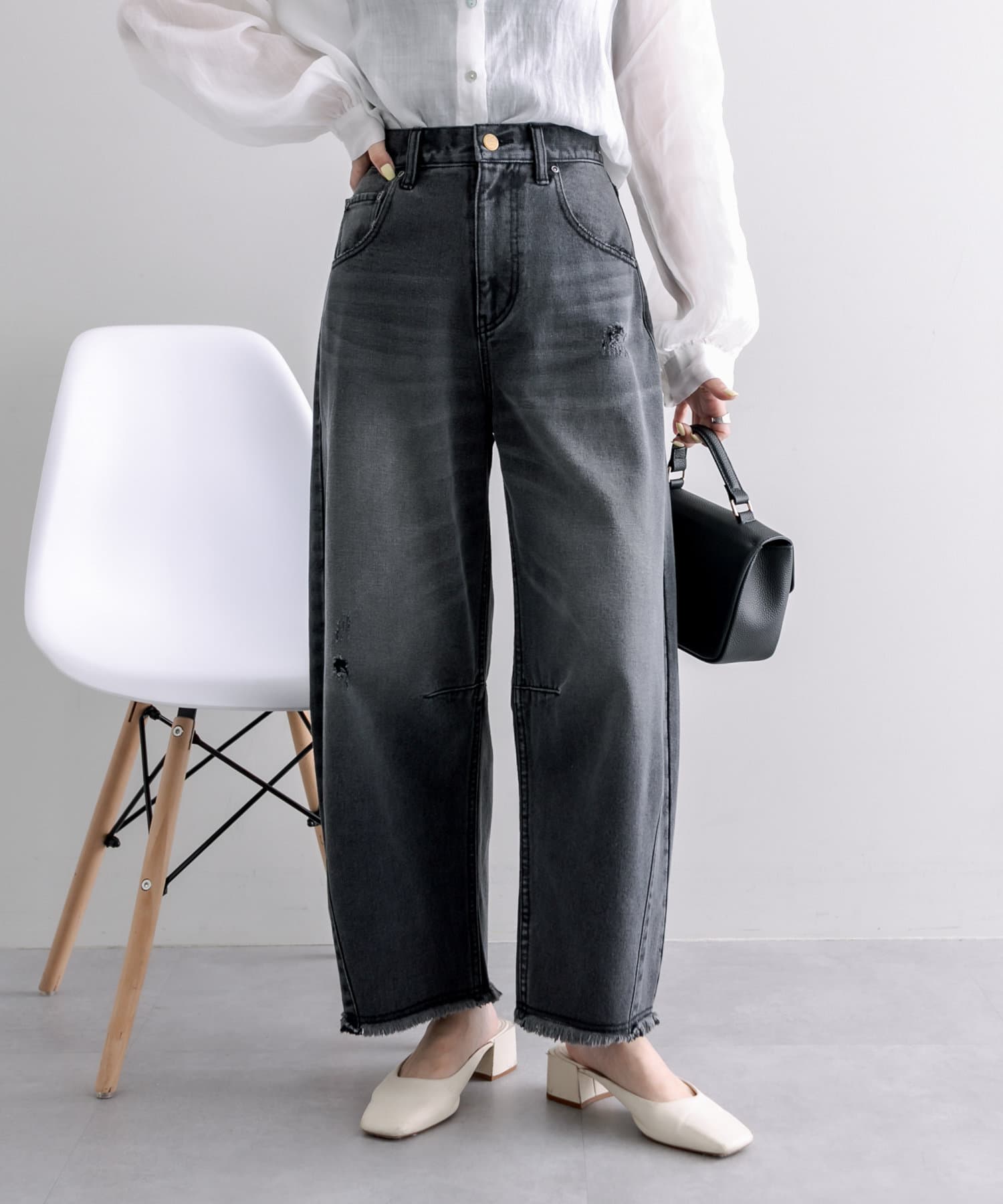 洗いざらしのナチュラルな表情と裾のフリンジやダメージ加工がヴィンテージ感を演出。