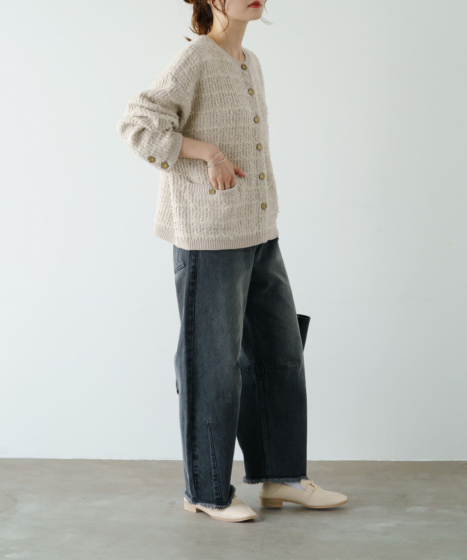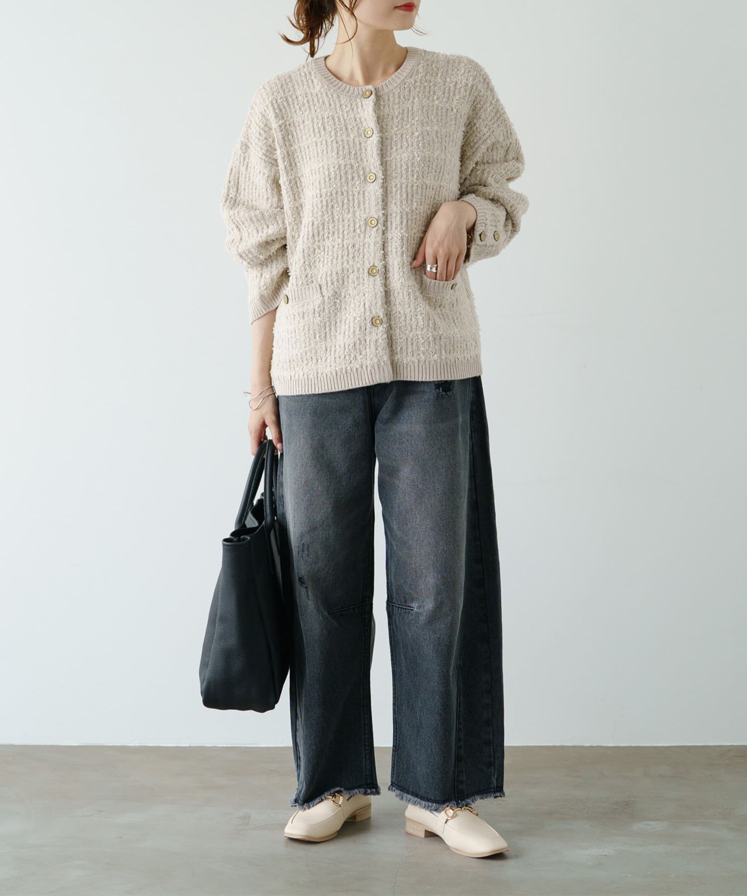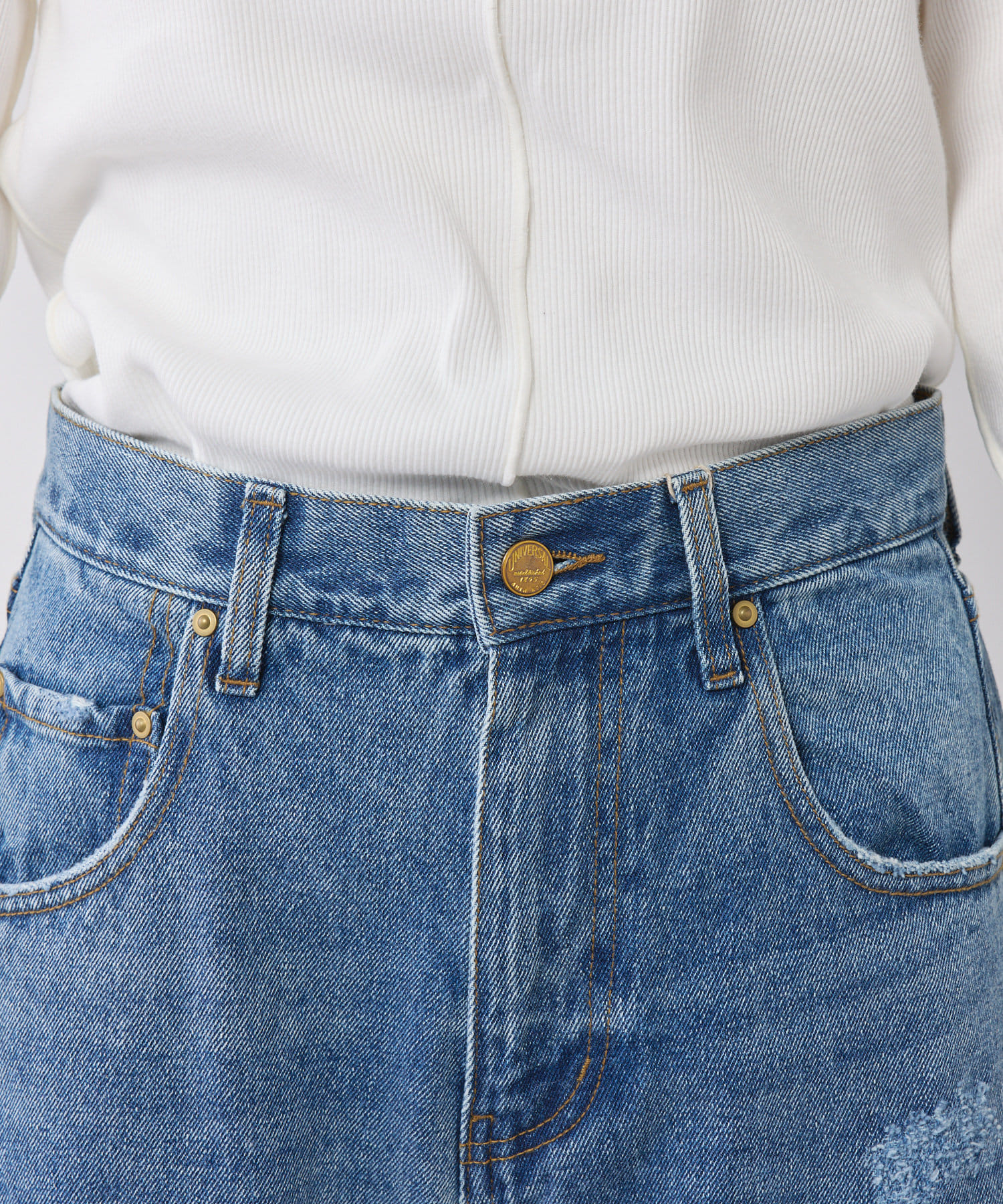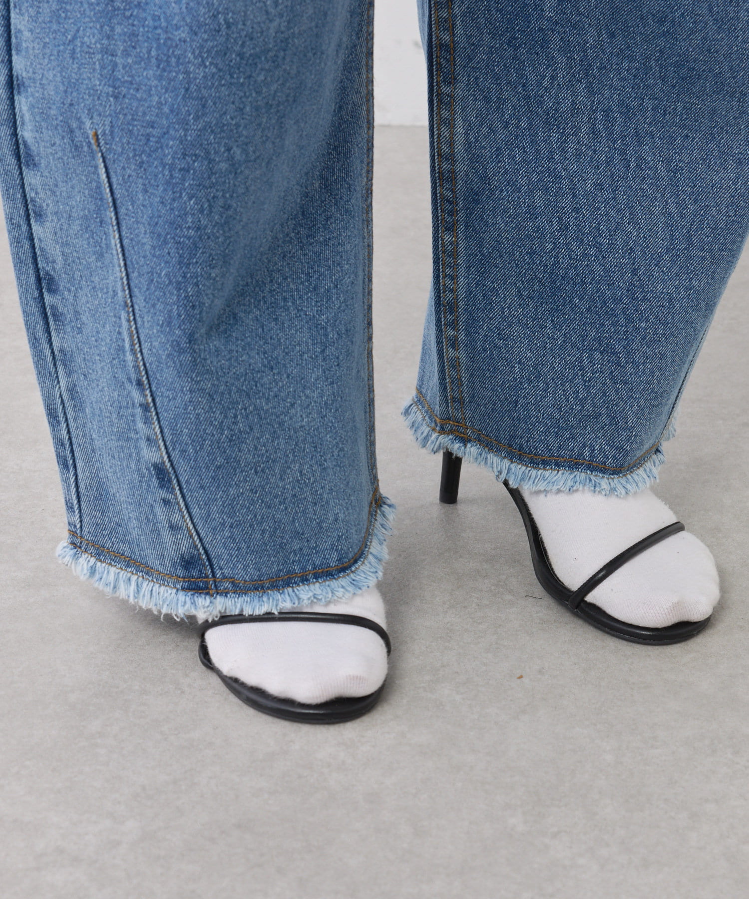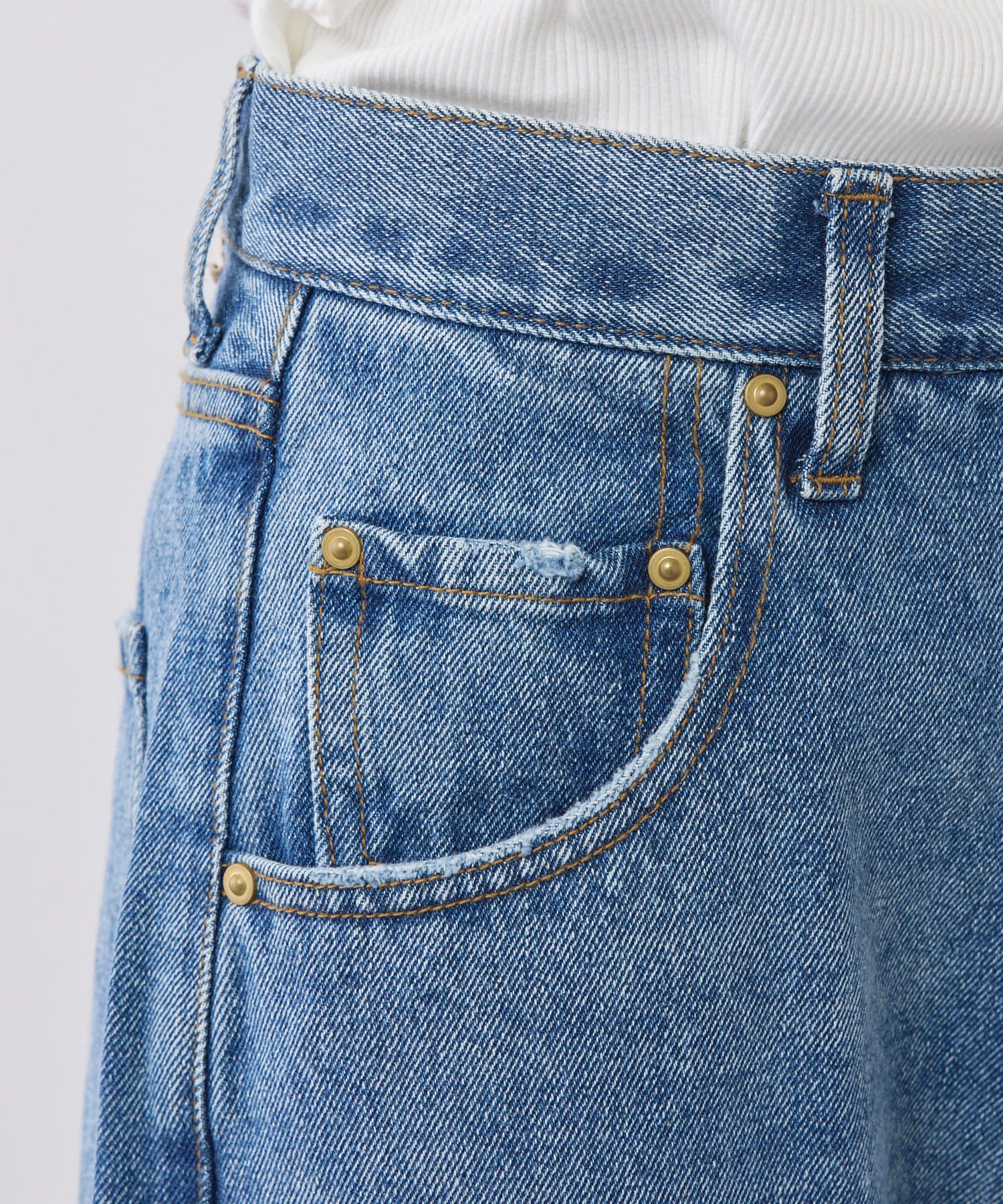 洗いざらしのナチュラルな表情と裾のフリンジやダメージ加工がヴィンテージ感を演出。