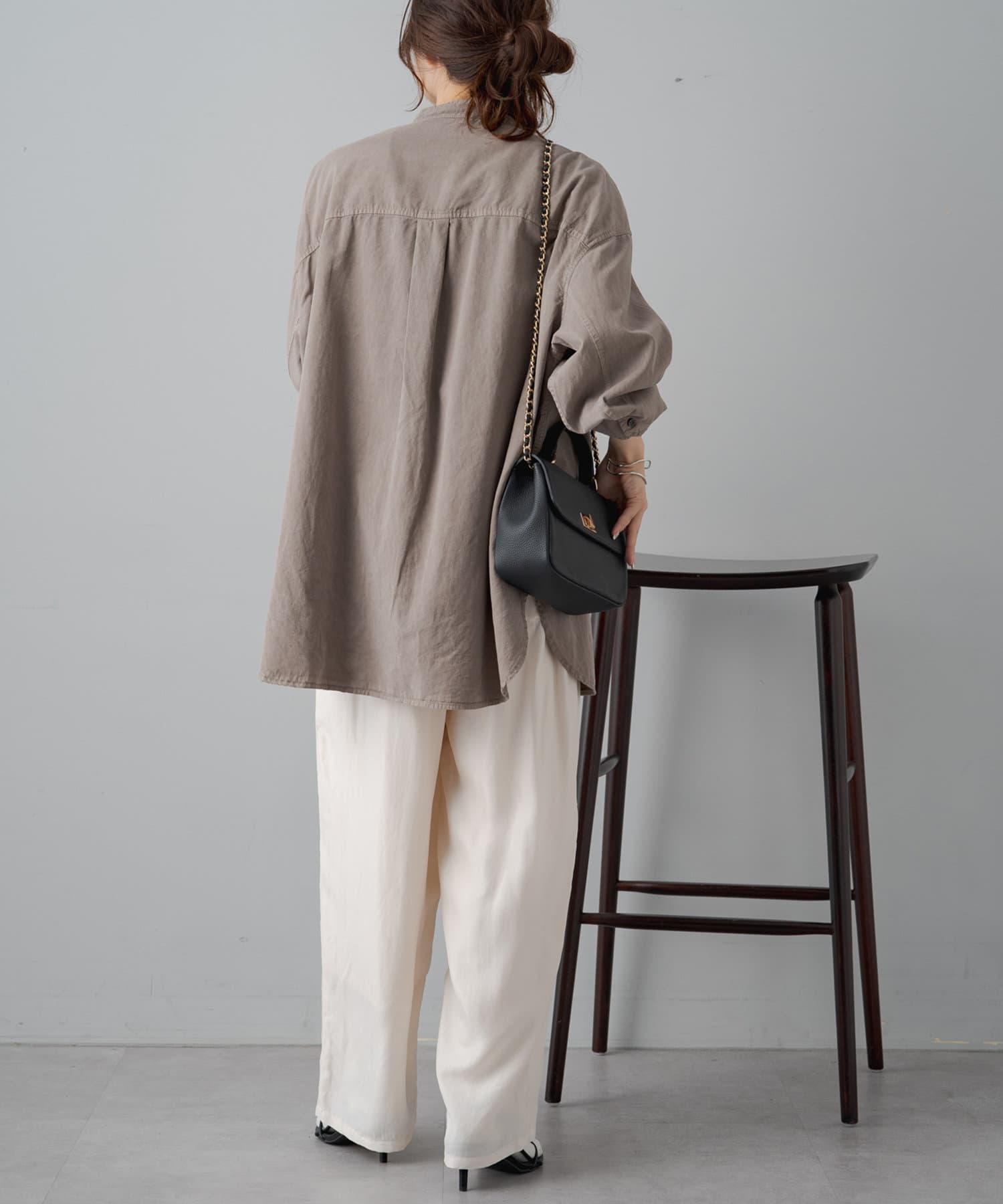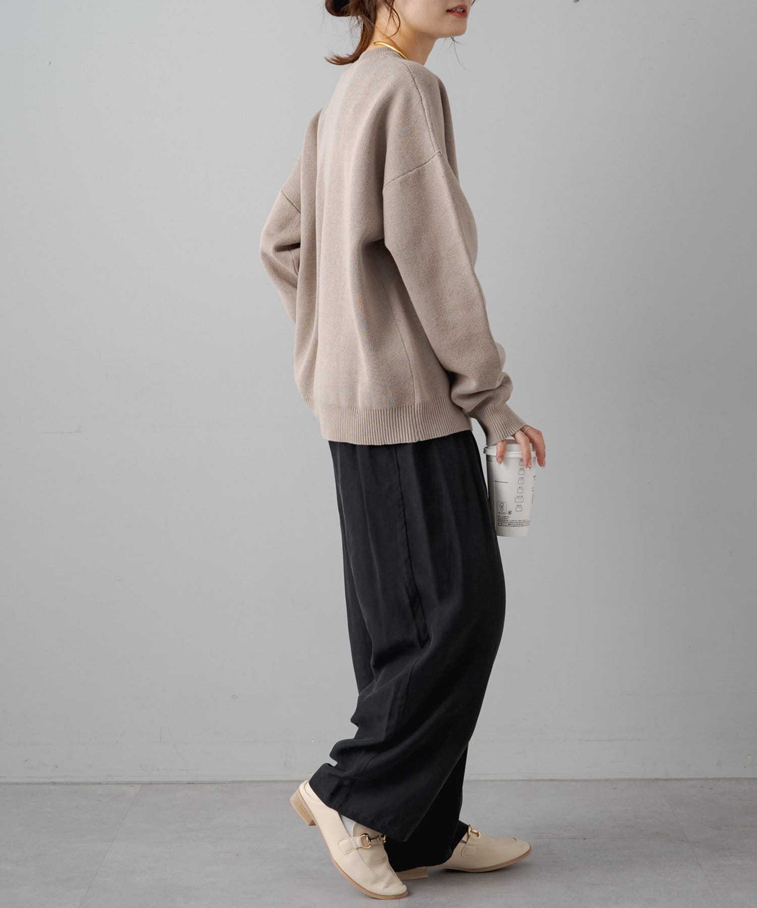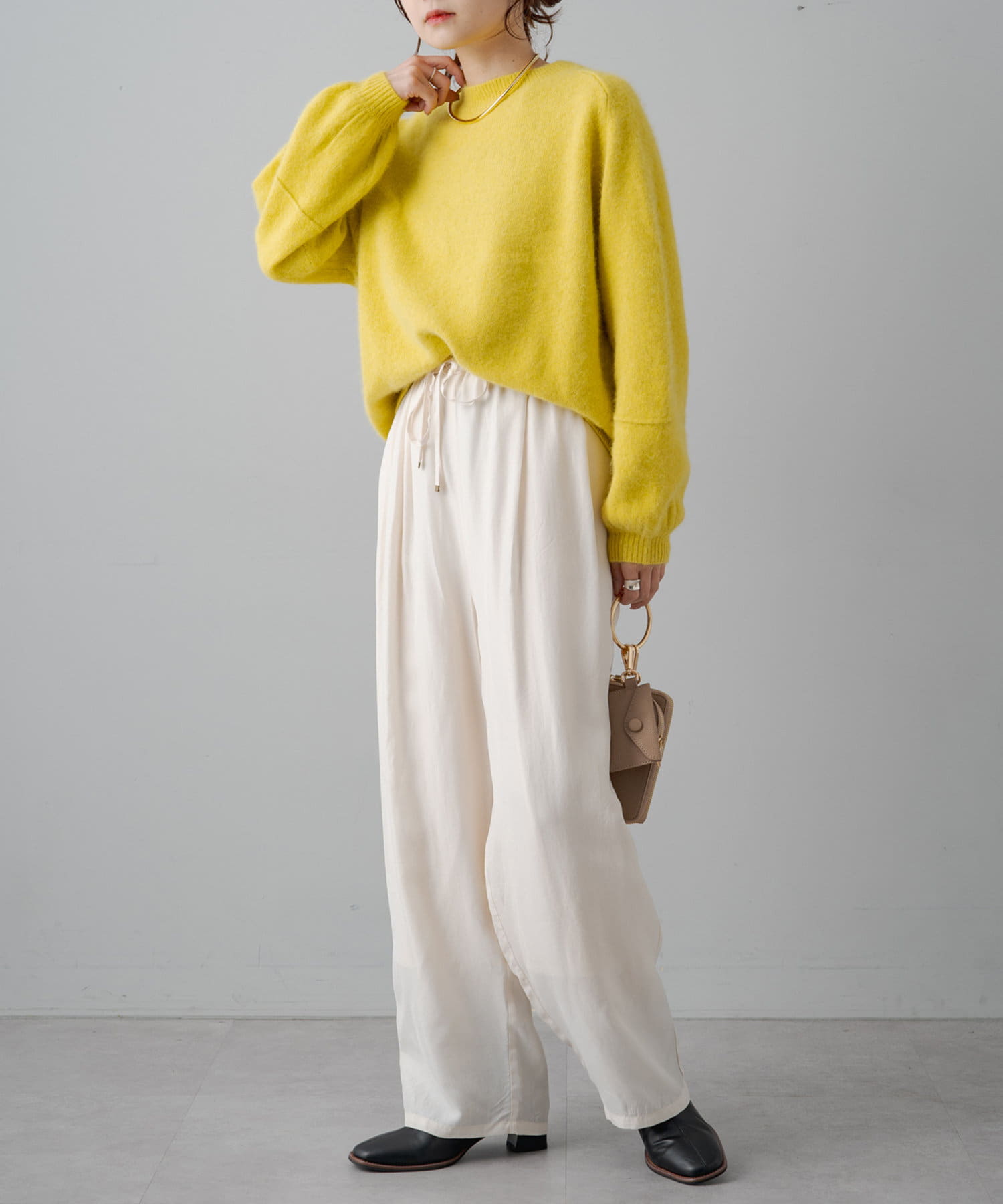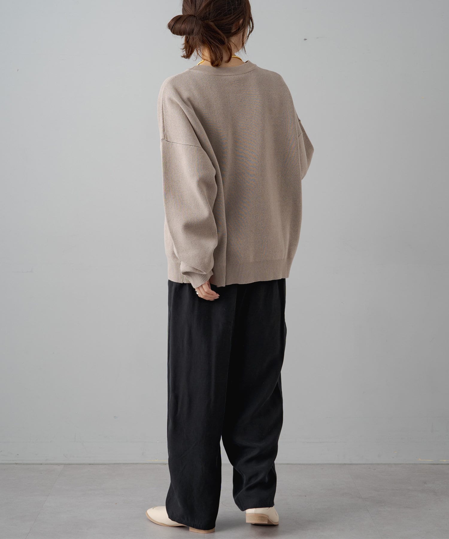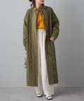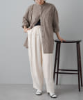やや丸みのあるコクーンシルエットですが、落ち感のある素材なので丸みは感じずに、スタイリッシュな雰囲気を演出。