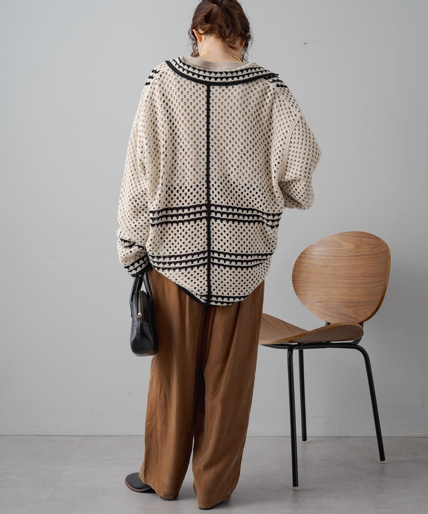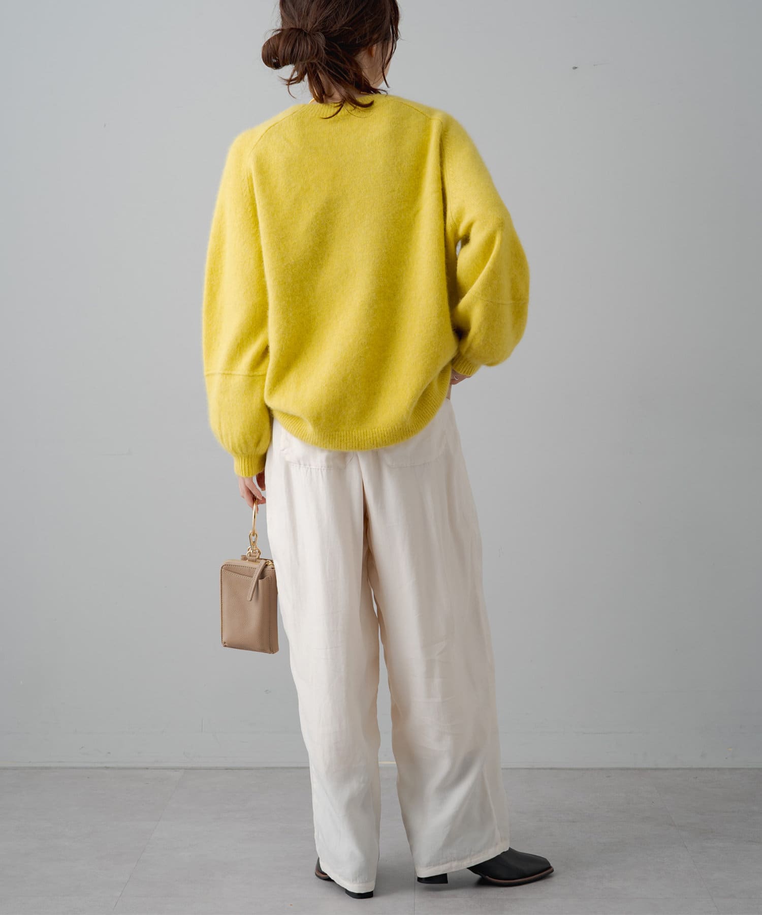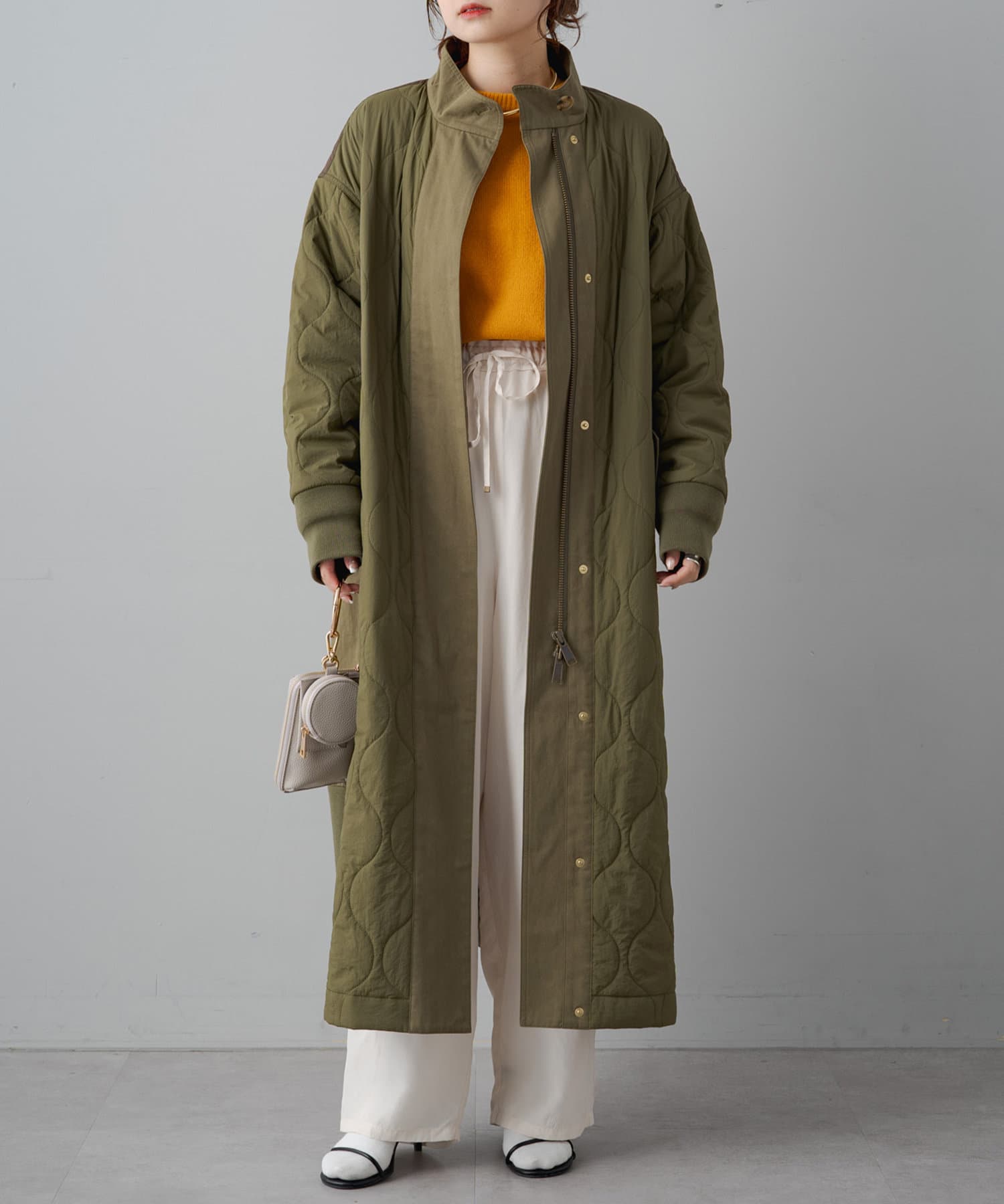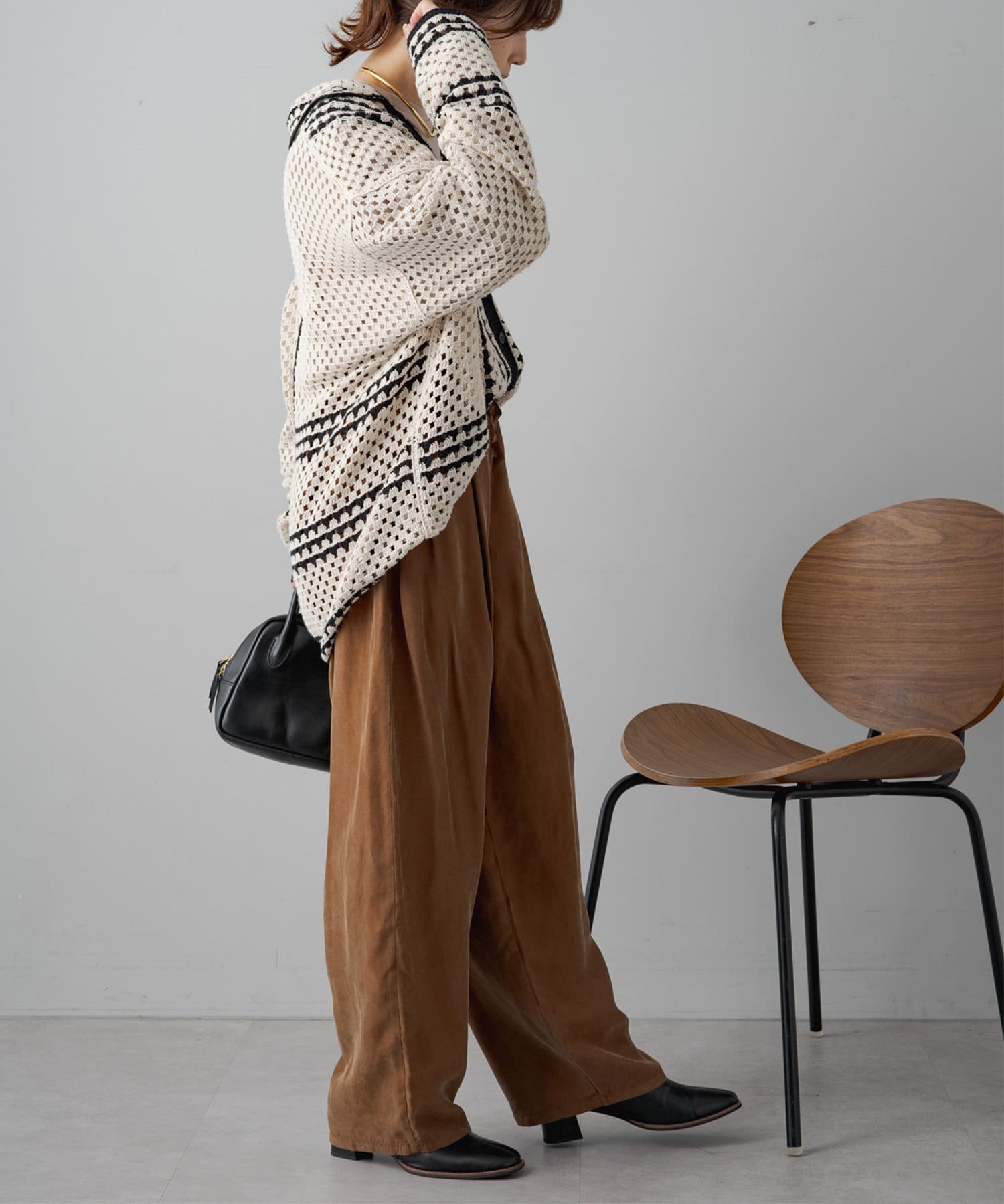 やや丸みのあるコクーンシルエットですが、落ち感のある素材なので丸みは感じずに、スタイリッシュな雰囲気を演出。