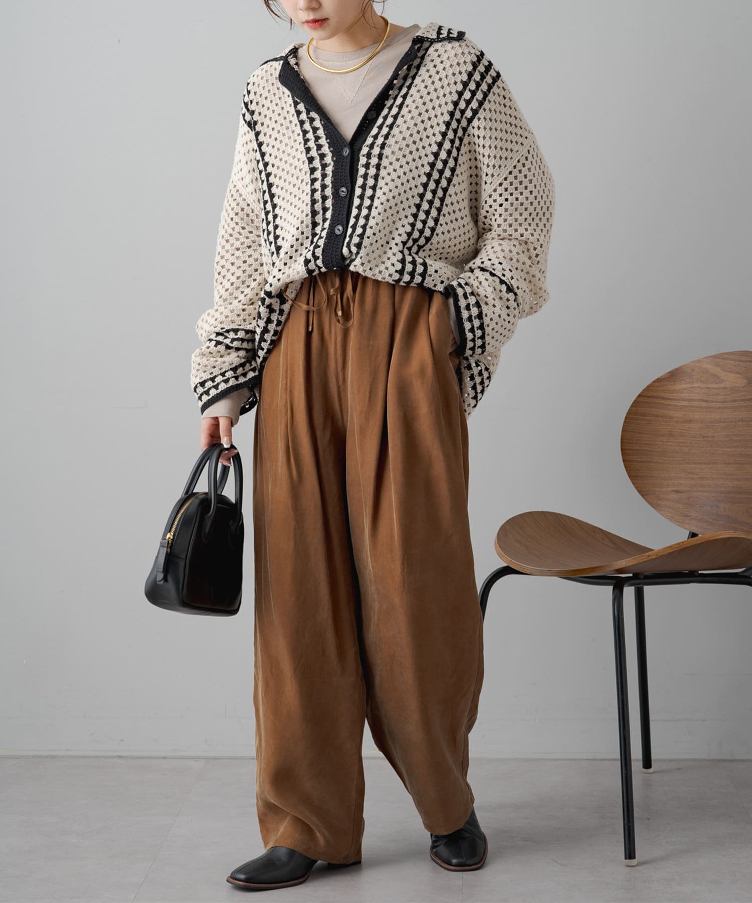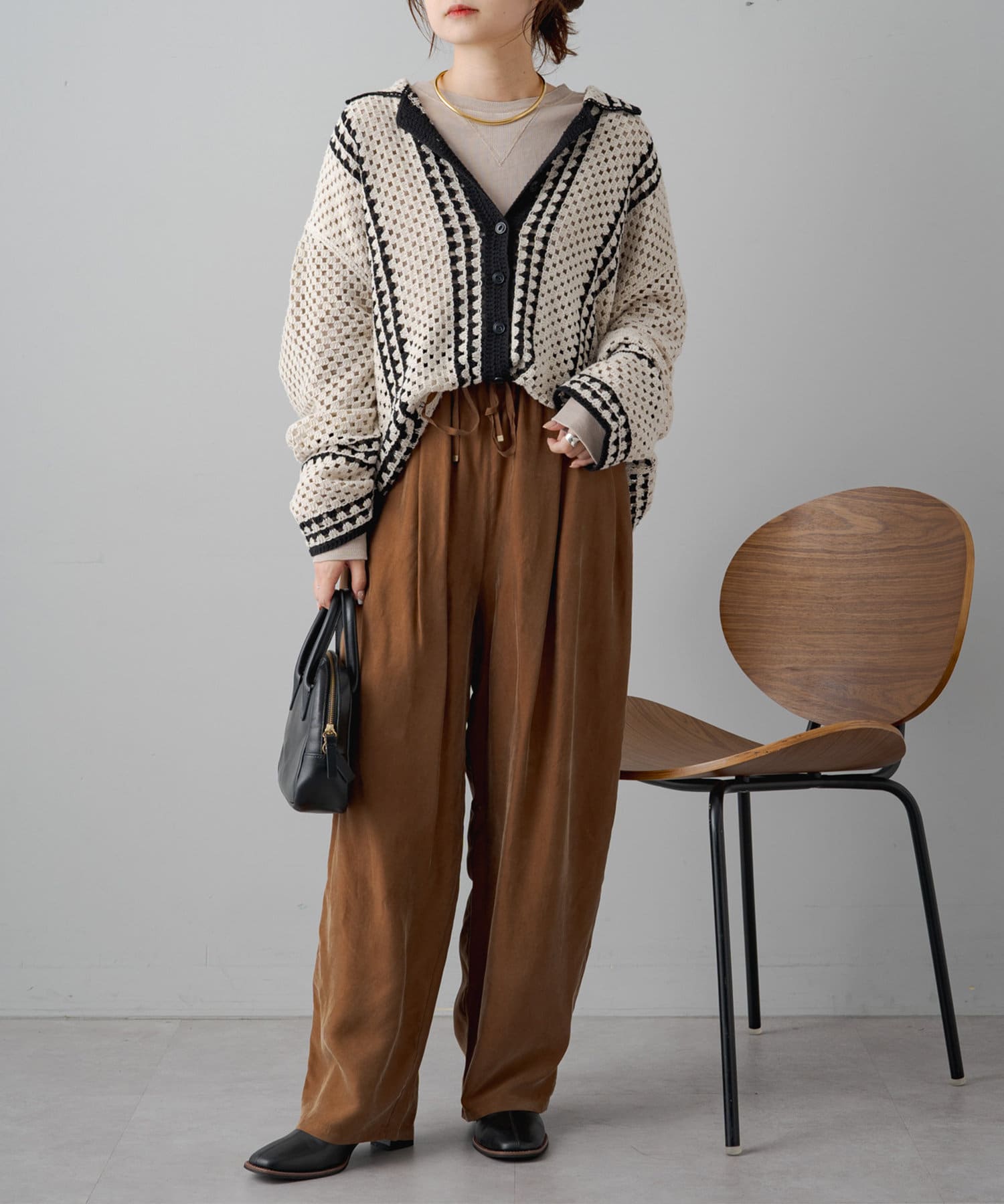 シンプルながら上品なツヤ感を持つテクスチャーで大人なスタイルに仕上がり