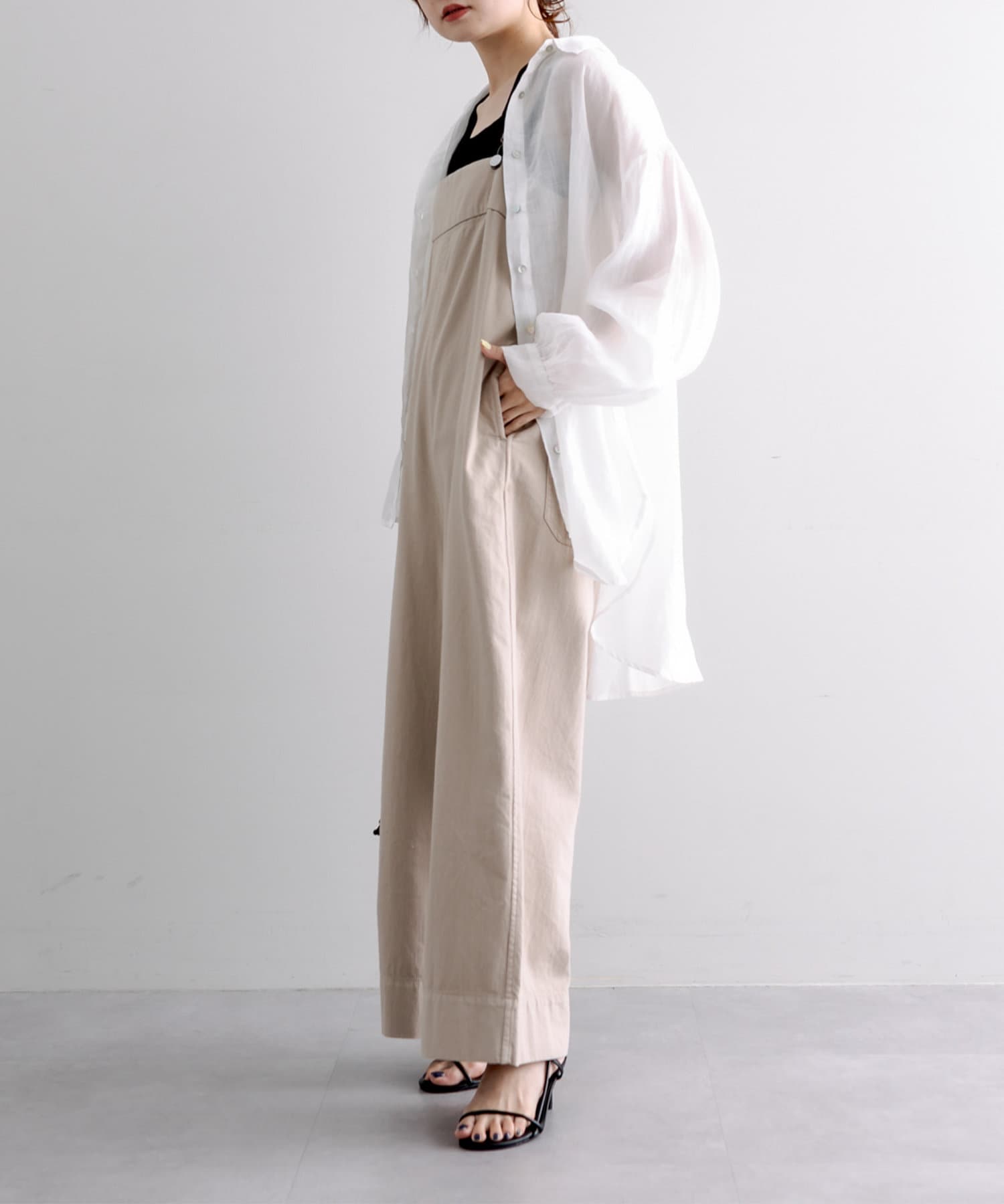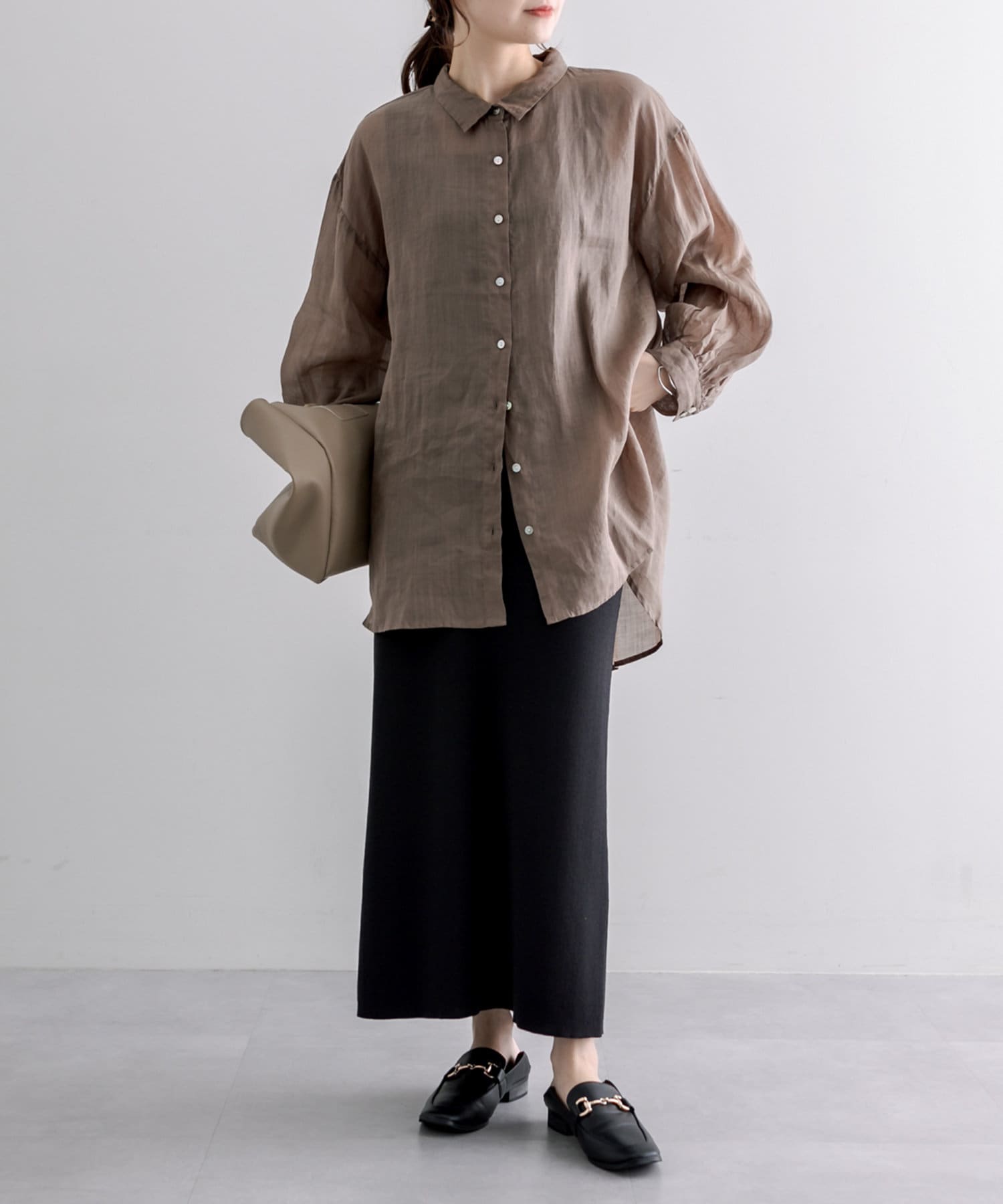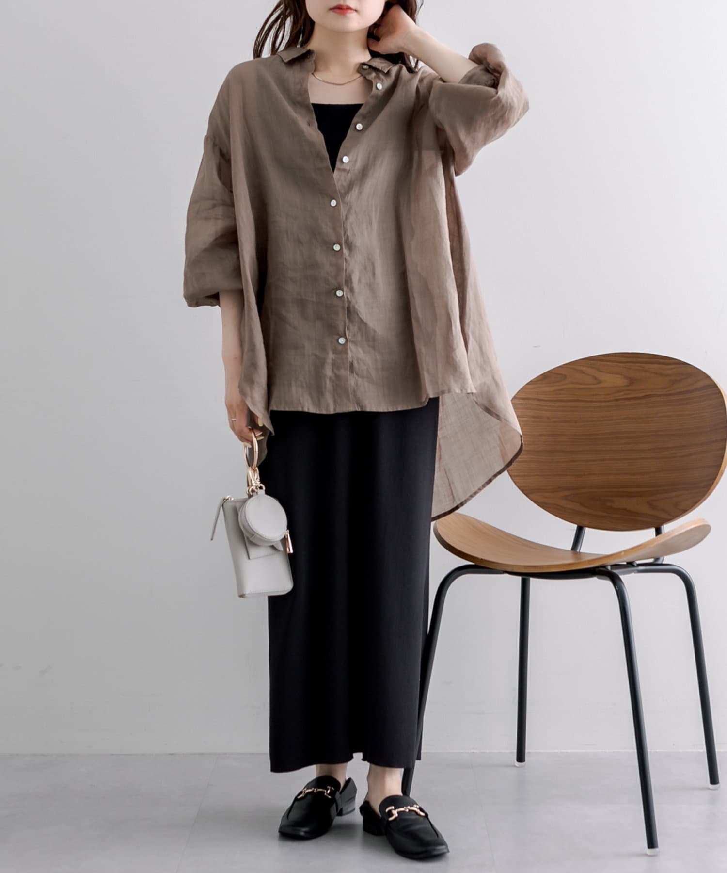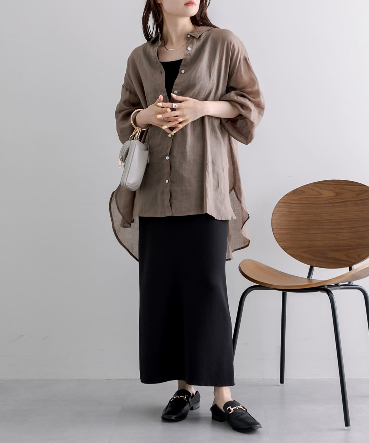 体が泳ぐワイドシルエットにヒップまですっぽり隠れる着丈で、羽織りでも1枚着でも着回しやすいデザインになっています。