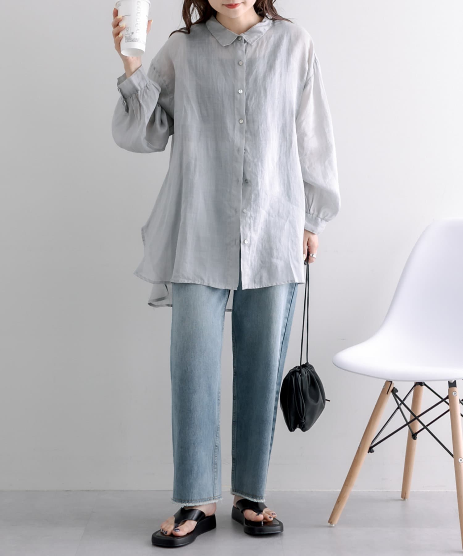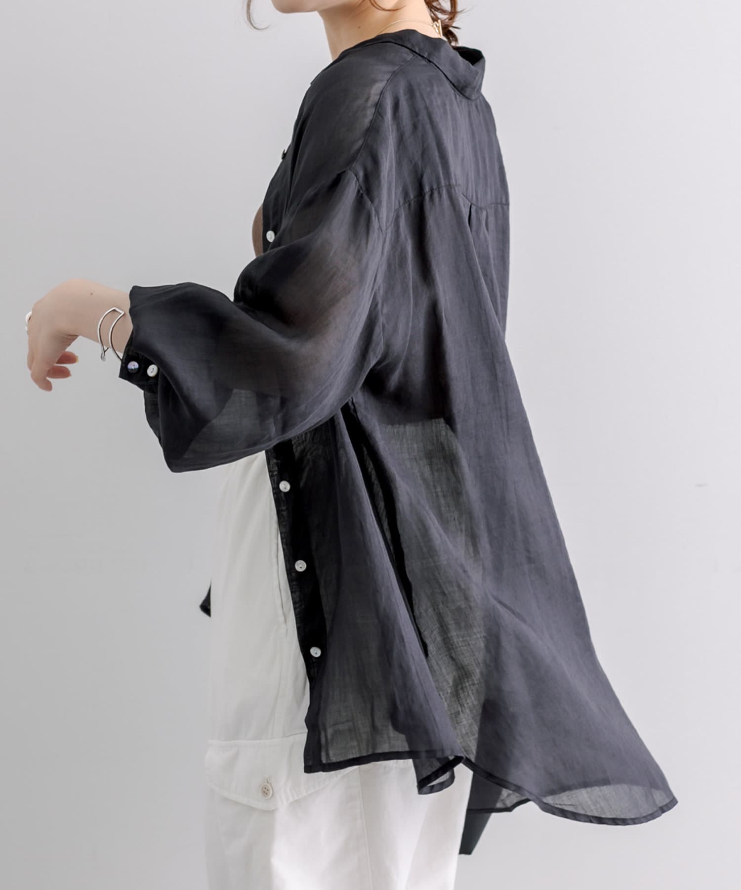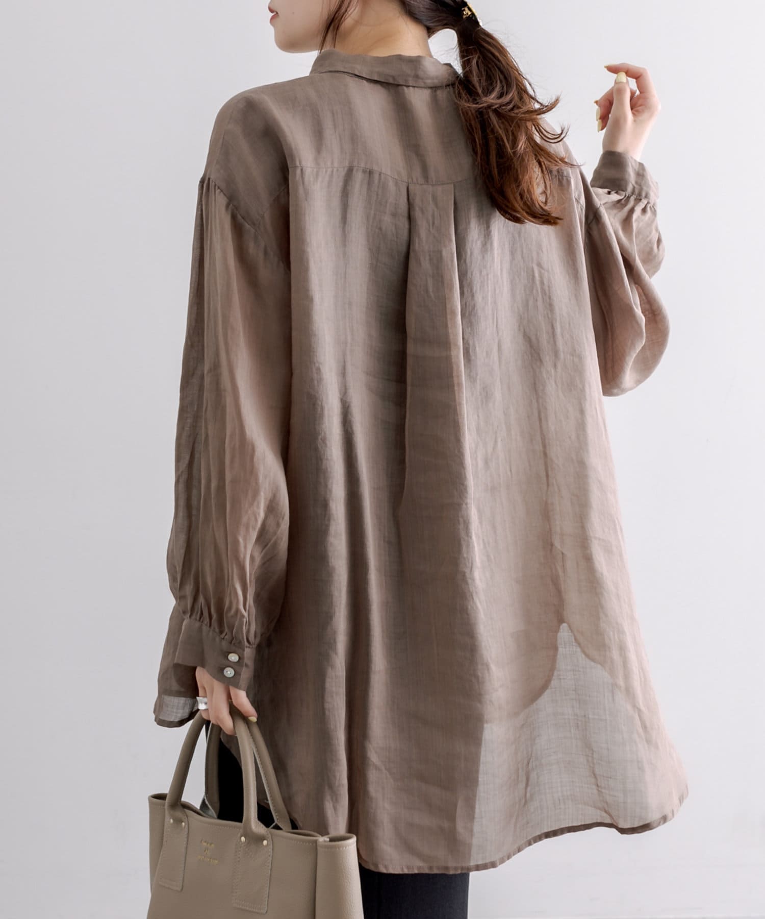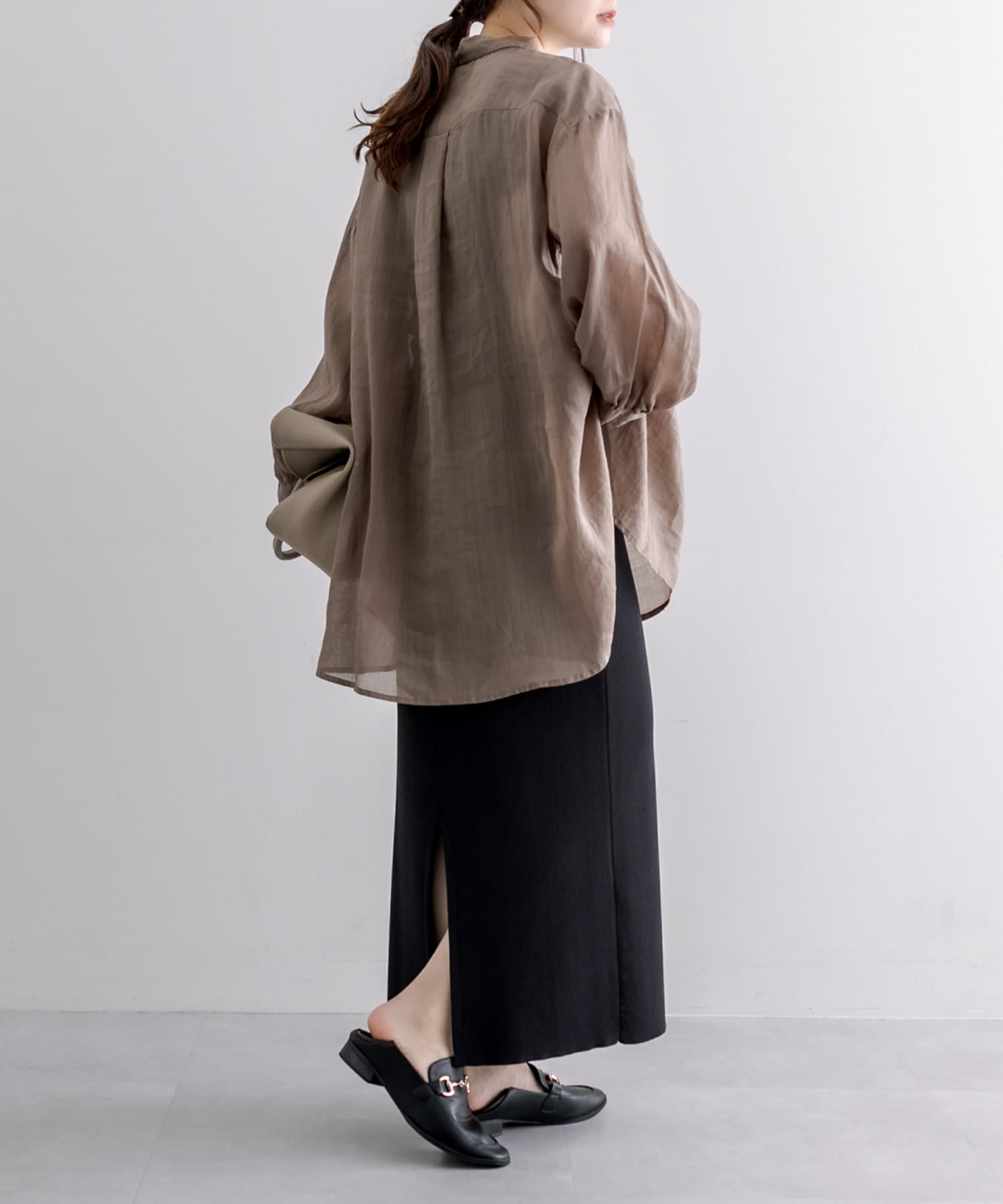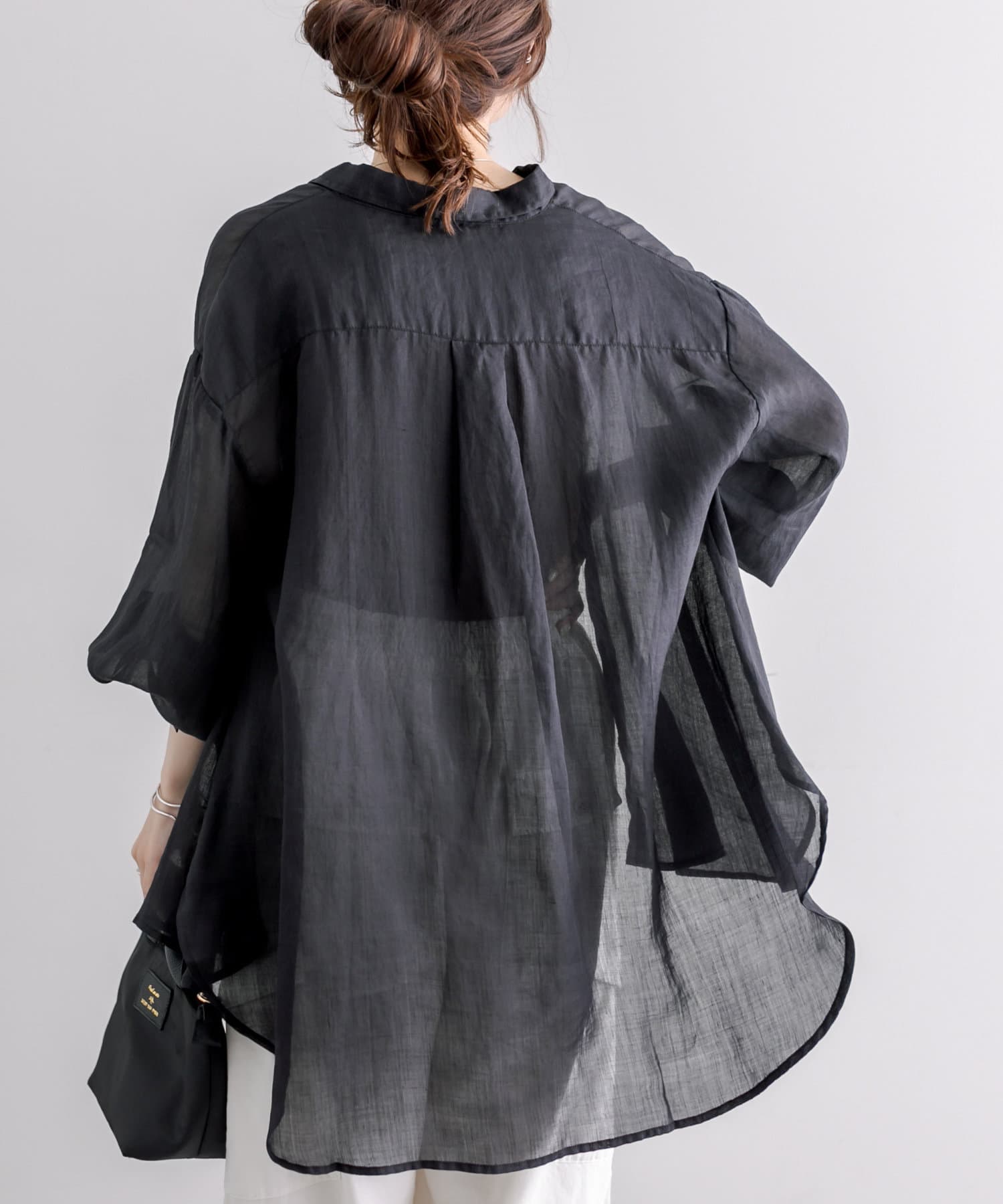体が泳ぐワイドシルエットにヒップまですっぽり隠れる着丈で、羽織りでも1枚着でも着回しやすいデザインになっています。